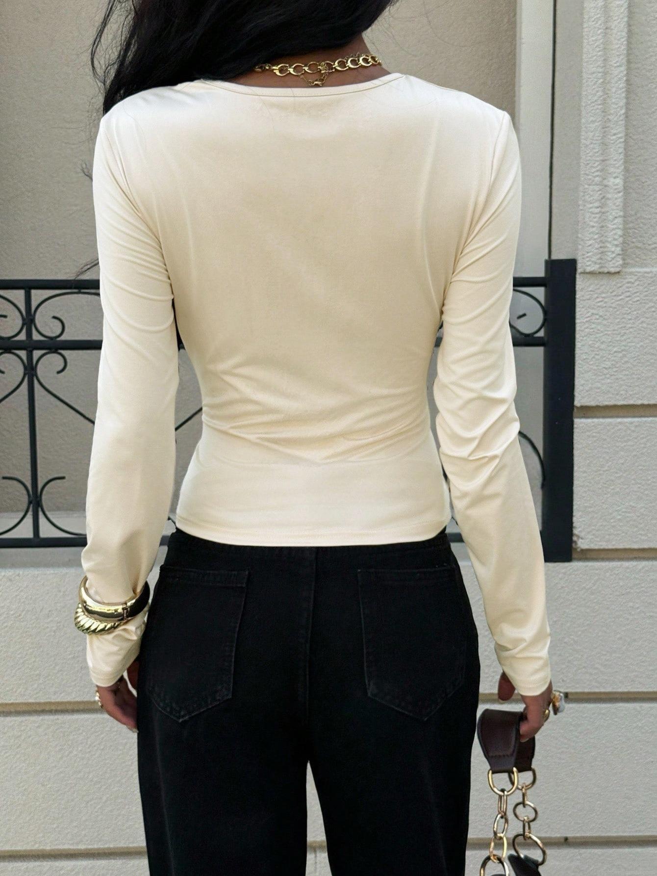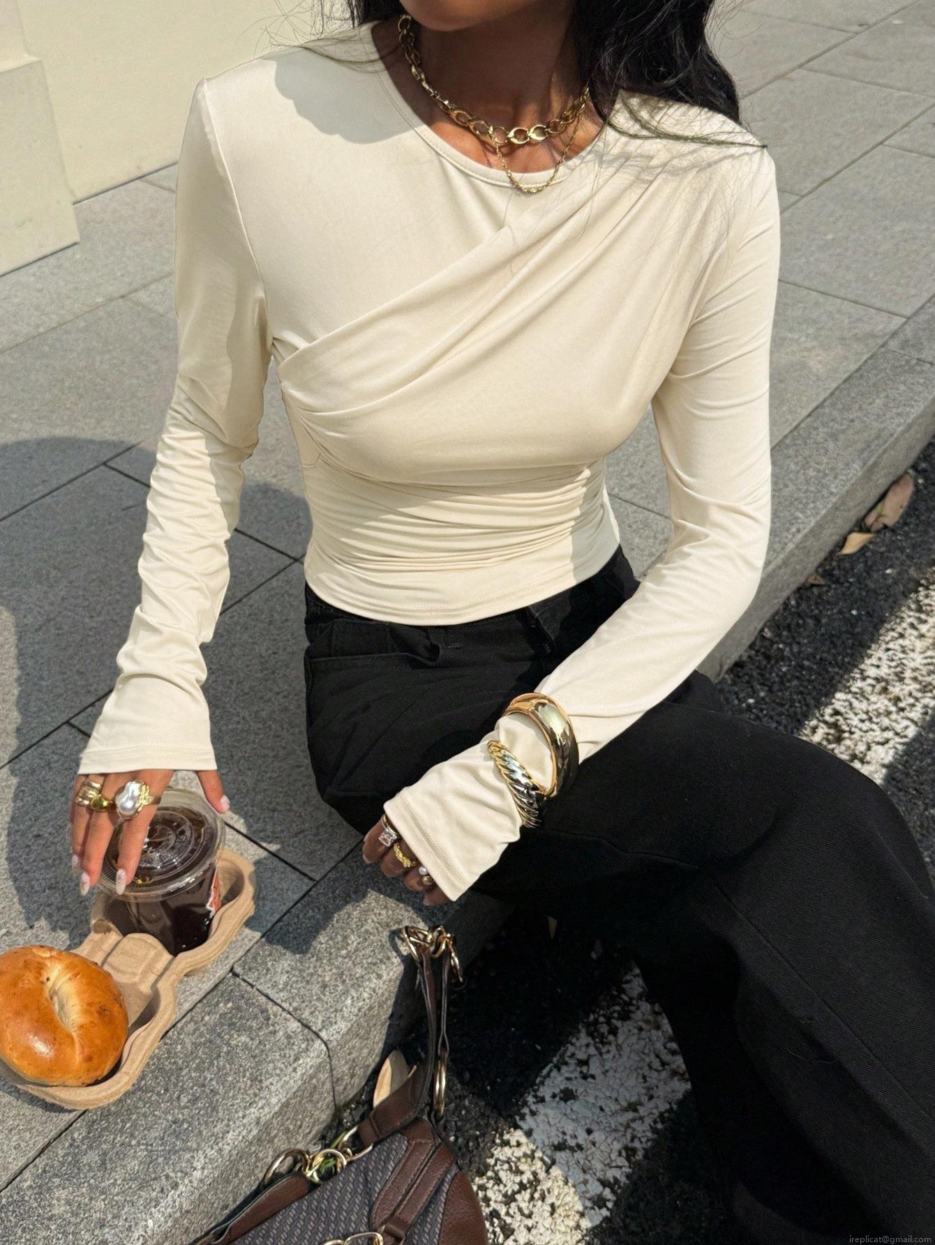 • Women's French Elegant Slim Fit Ruched Long Sleeve T-Shirt Solid Color Cream Round Neck Knit Top Soft Lightweight Casual Pullover Blouse