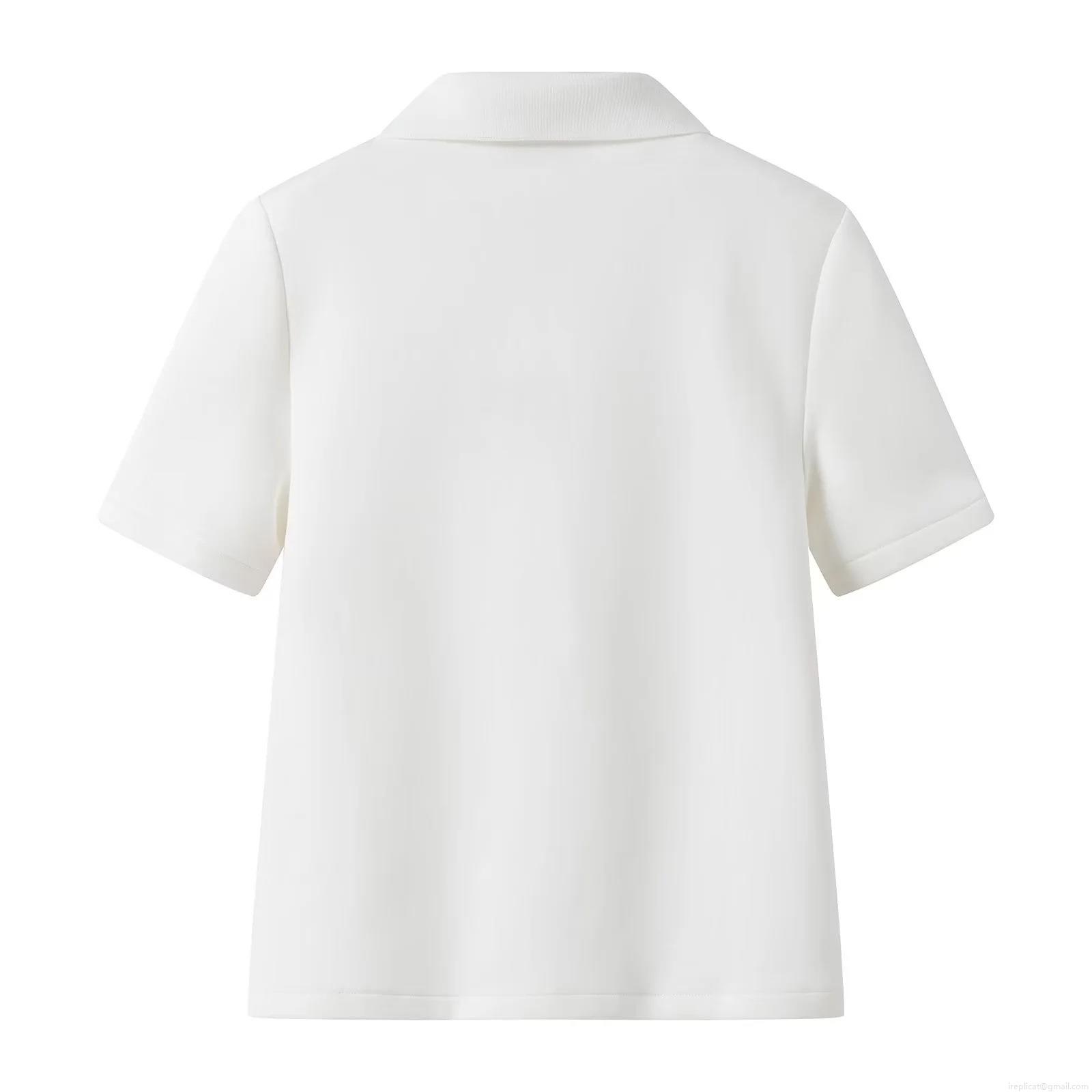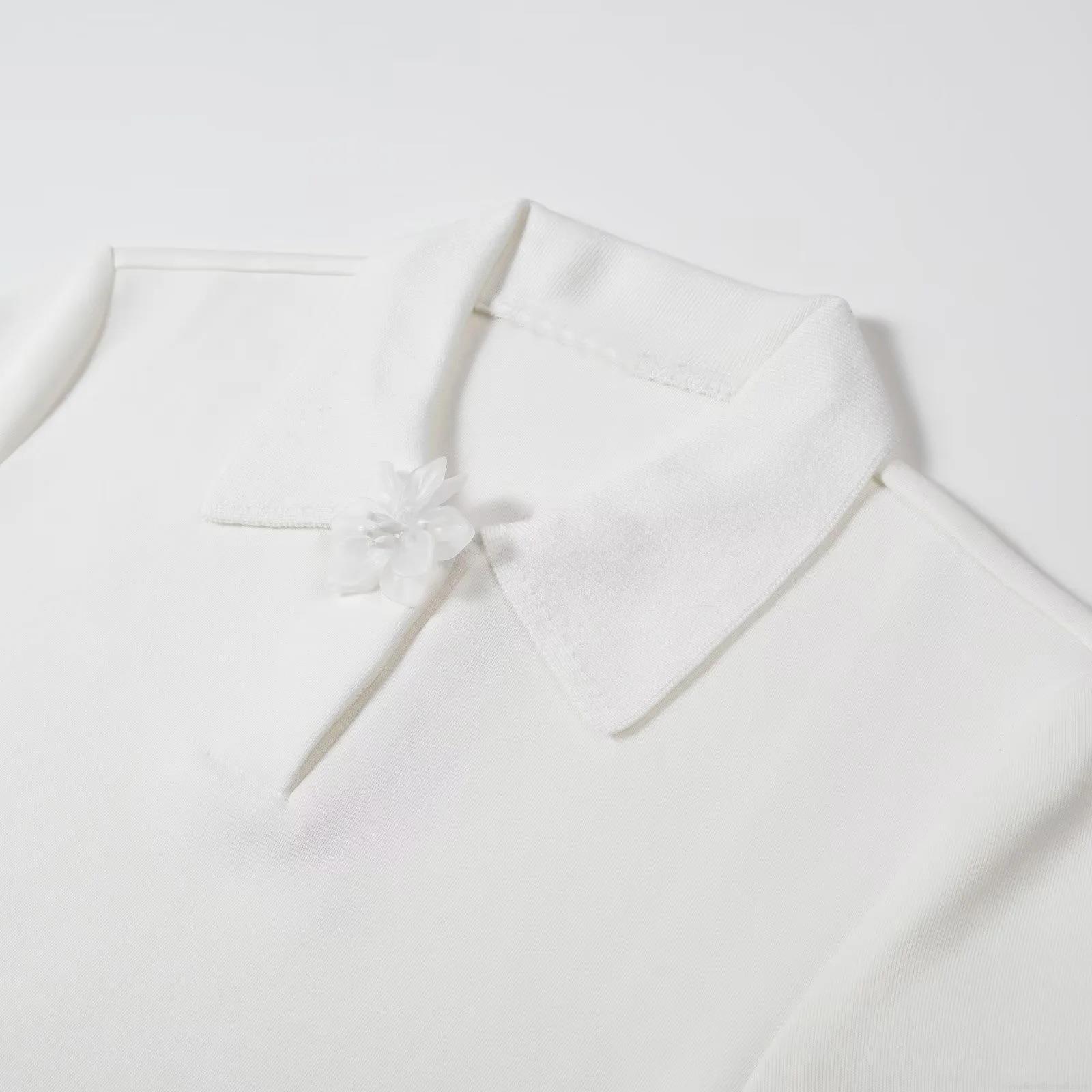 • Women's French Style Elegant White Knitted Polo Shirt With 3D Flower Decor Short Sleeve Loose Fit Casual Top For Summer Daily Wear