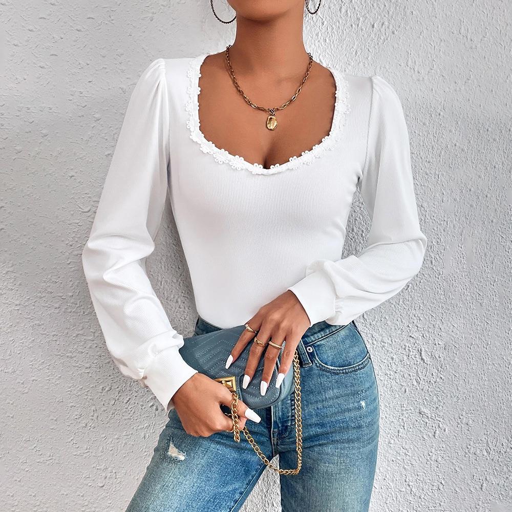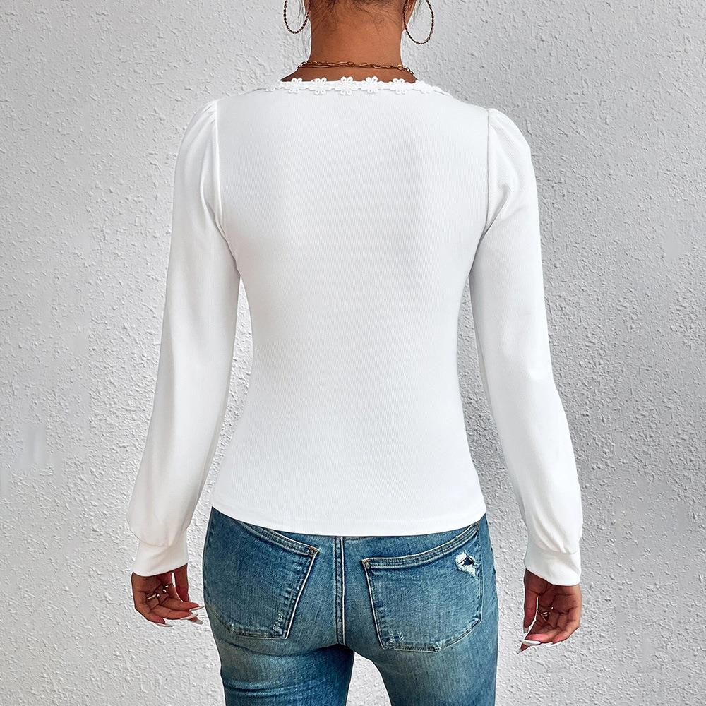• Women's French Style Slim Fit Ribbed Knit Top Lace Trim V-Neck Long Sleeve Bubble Sleeve Polyester Spandex T-Shirt Casual Solid Color Basic Tee