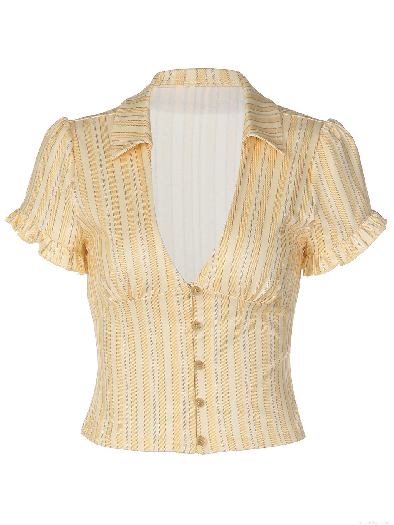 • Women's French Vintage Striped T-Shirt Short Sleeve Button Up Polo V Neck Crop Top Ruffle Sleeve Polyester Spandex Slim Fit Ribbed Knit Top