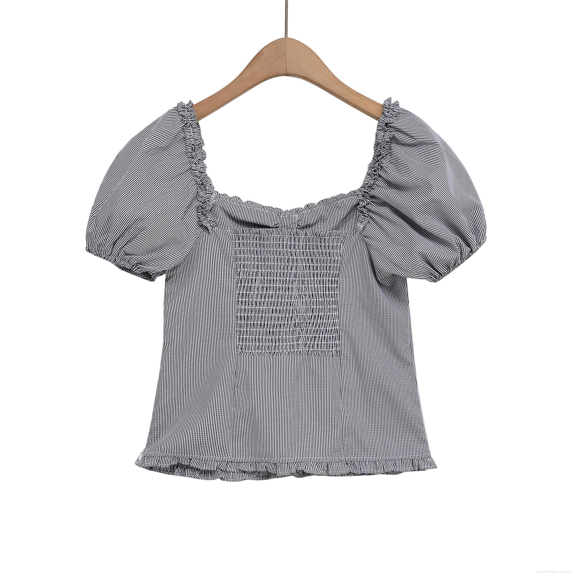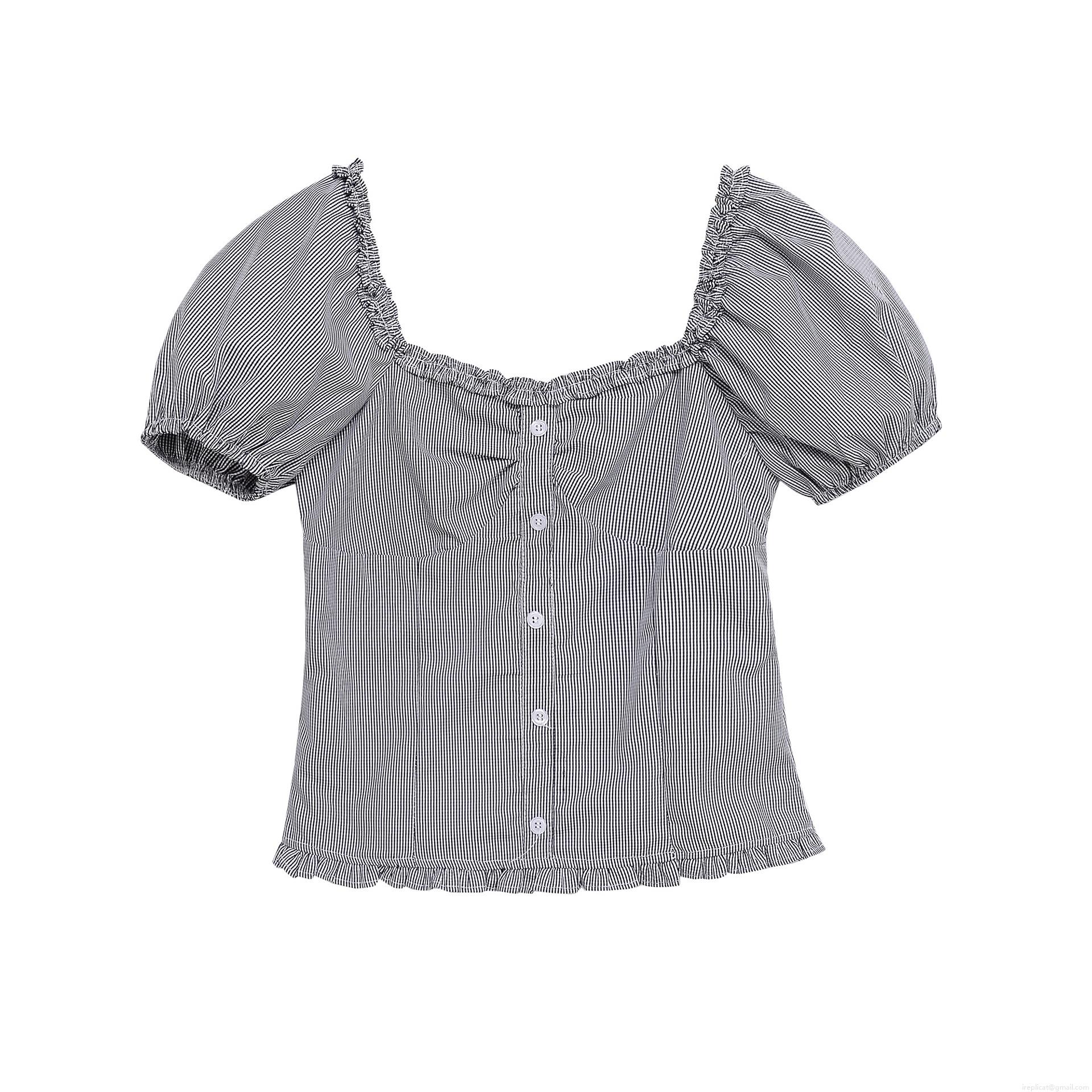 • Women's Gingham Plaid Ruffle Trim T-Shirt Puff Sleeve Square Neck Button Up Polyester Blend Top Summer Fashion Streetwear Daily Casual Ladies Blouse
