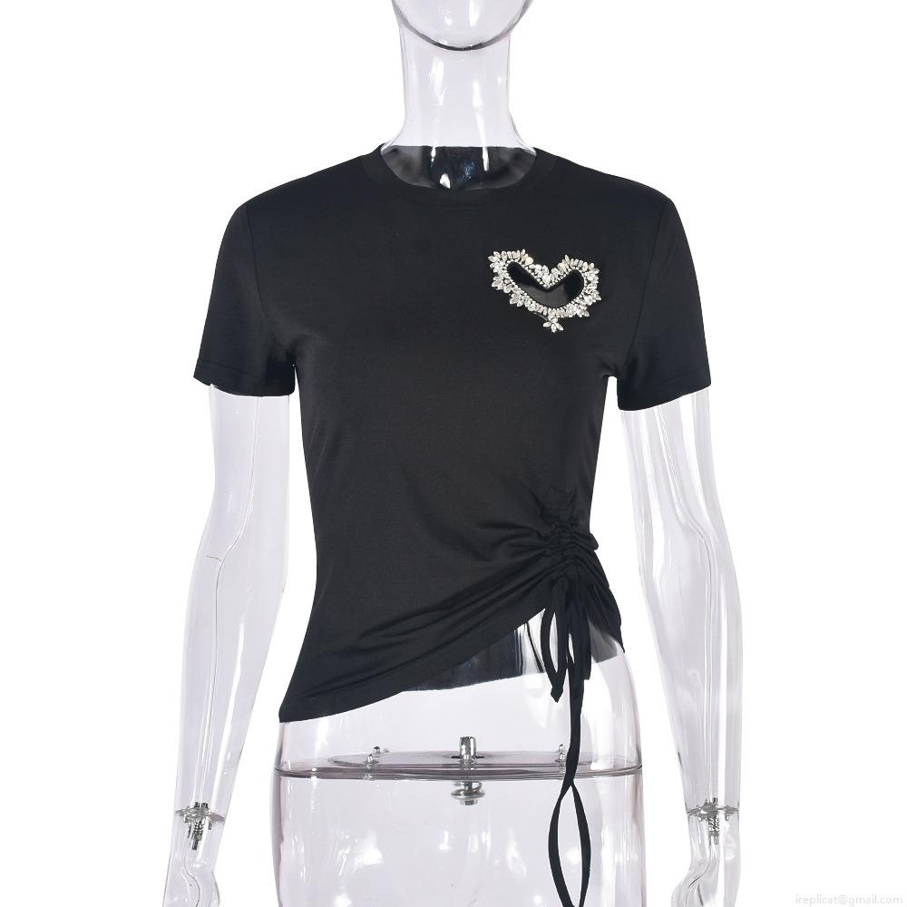 Women's Heart Cut Out Rhinestone T-Shirt Sexy Slim Fit Drawstring Ruched Short Sleeve Crop Top Streetwear Tee For Lady