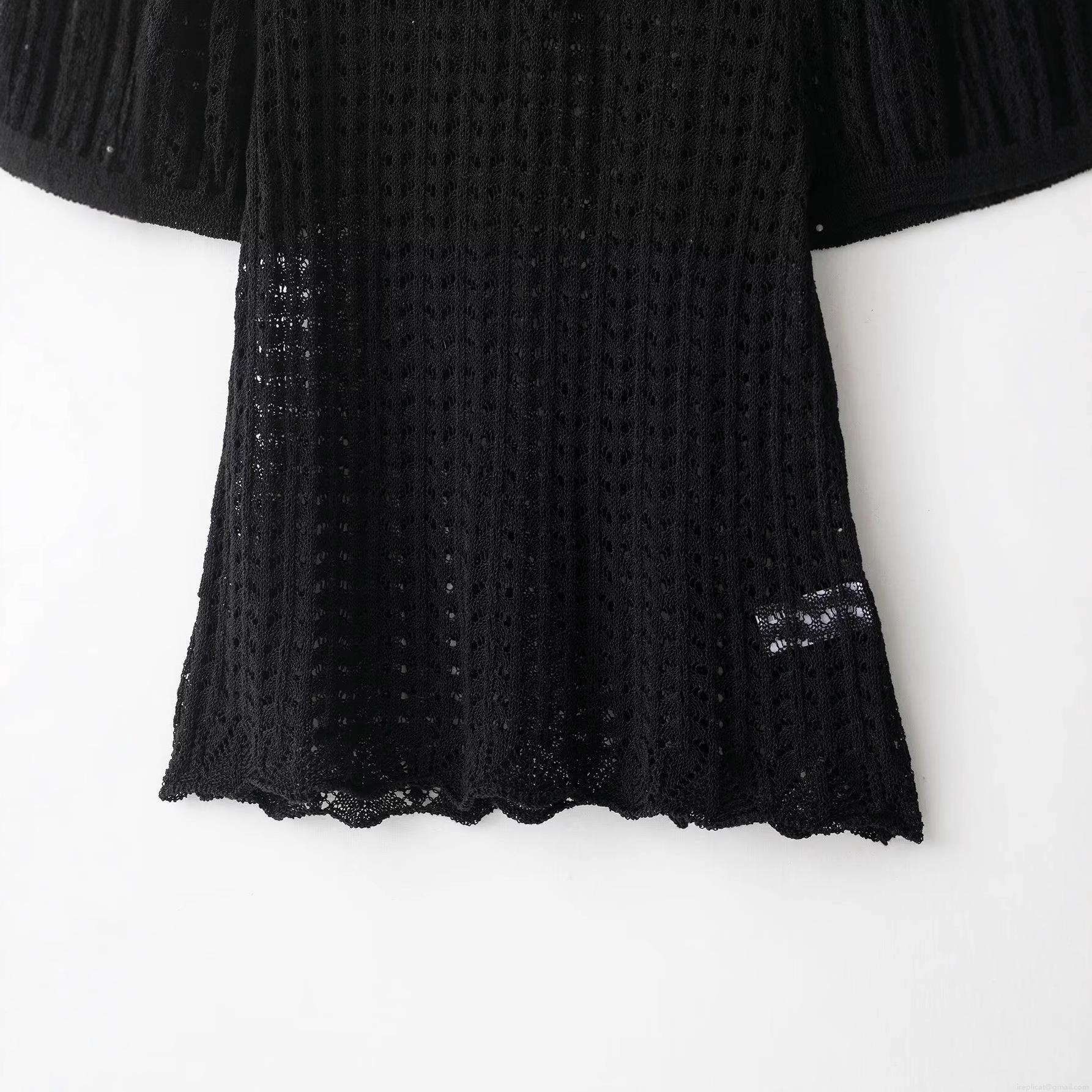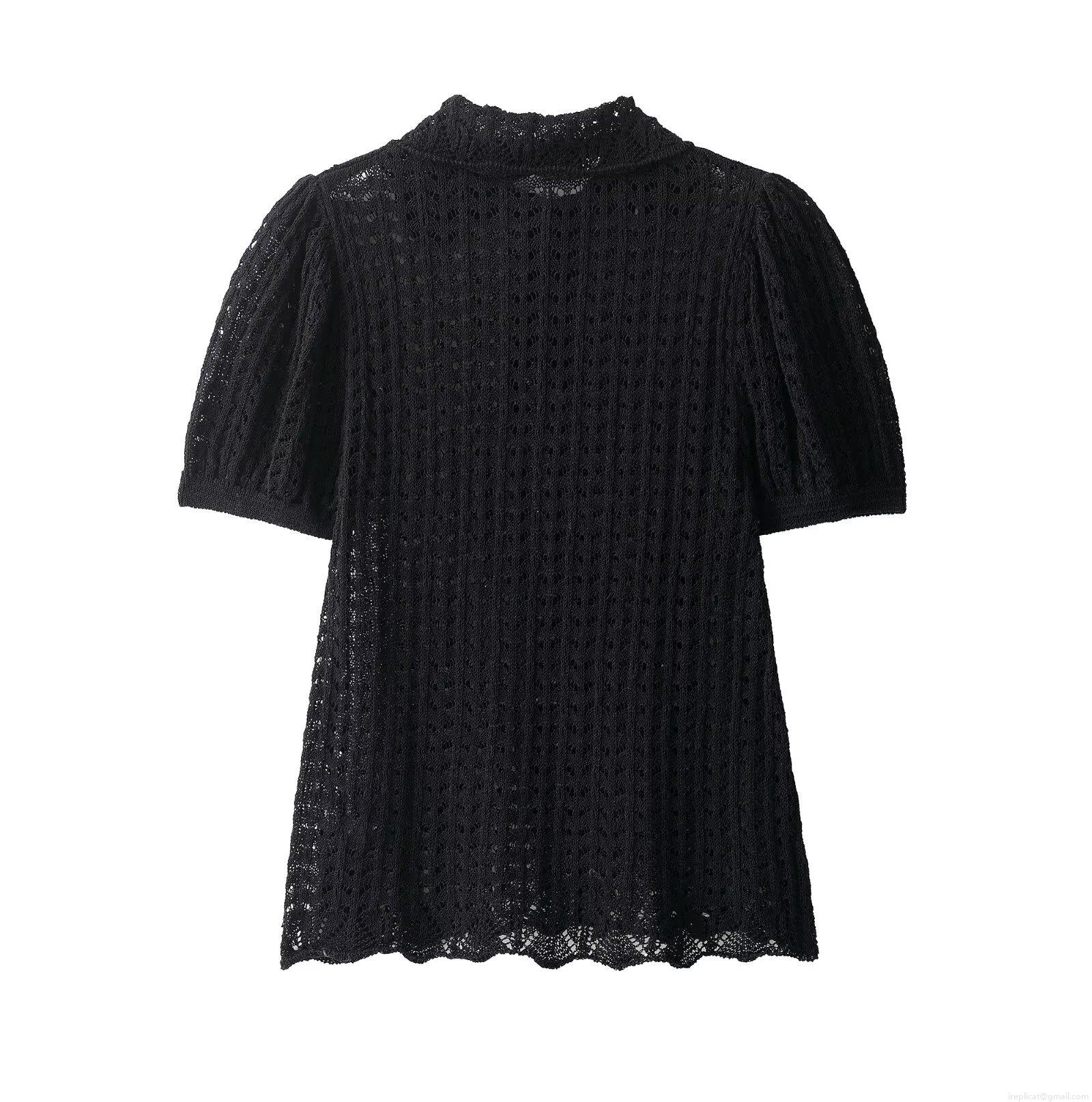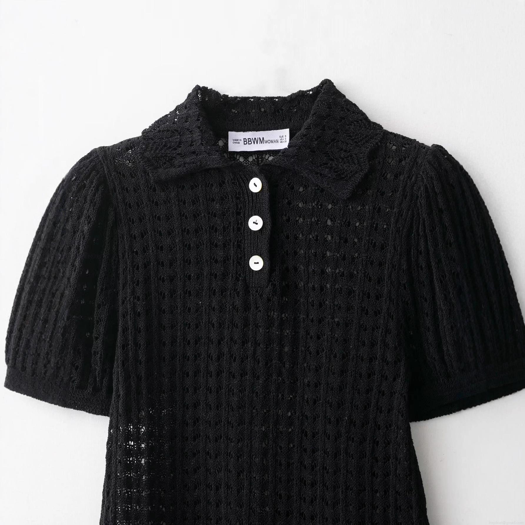 • Women's Hollow Out Knitted Polo Shirt Short Sleeve Puff Sleeve Top Casual Black Crochet Polyester T-Shirt For Women Daily Streetwear Comfort Tee