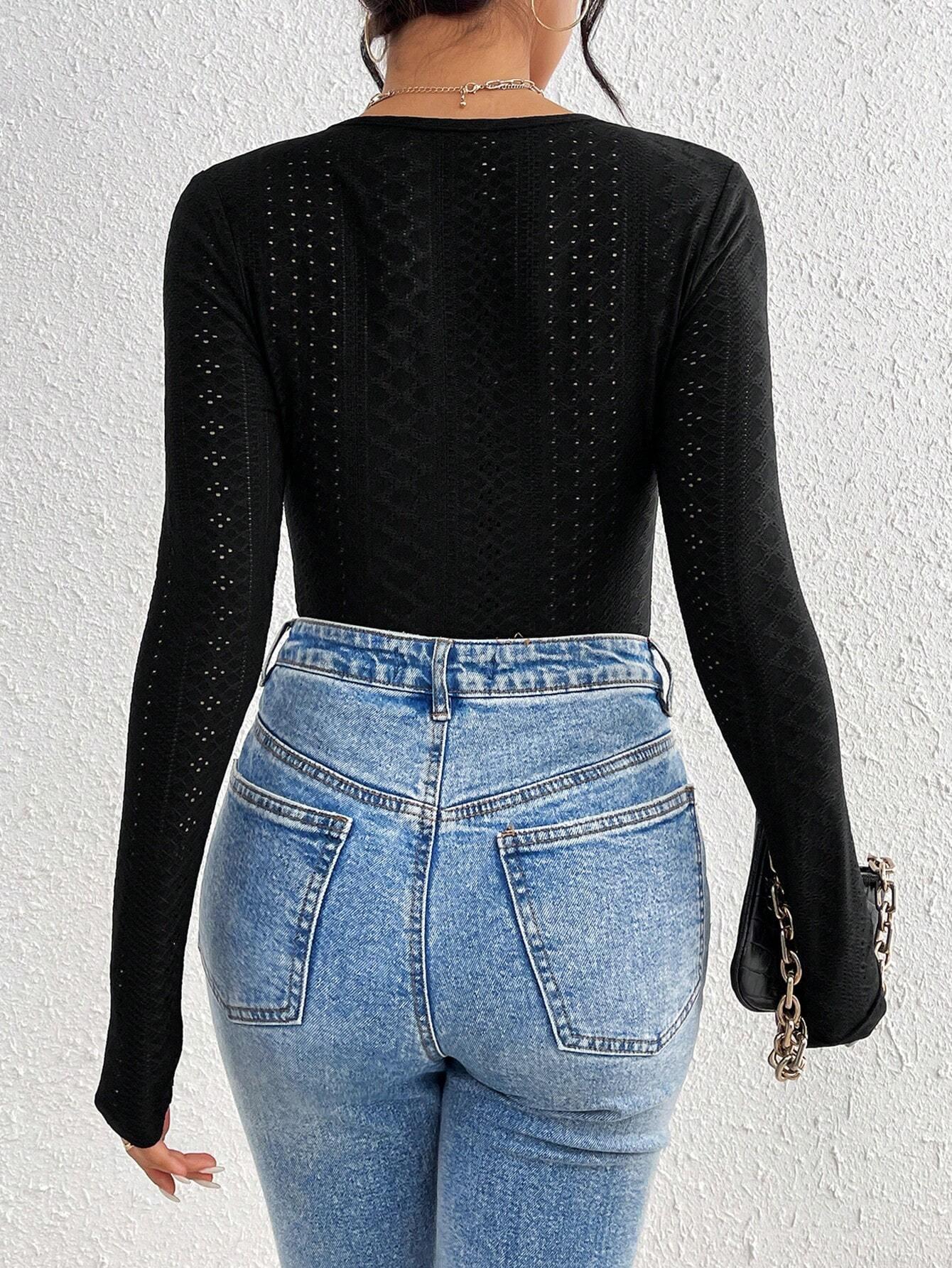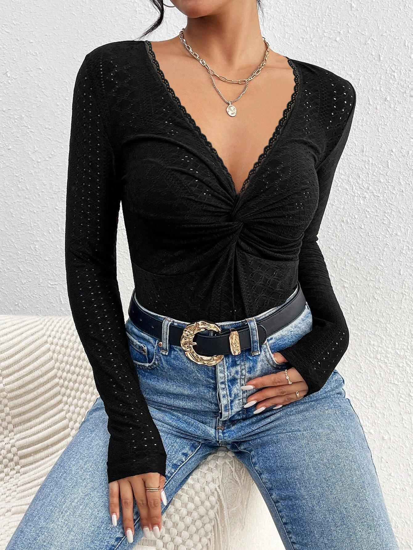 • Women's Intellectual V-Neck Lace Trim Long Sleeve T-Shirt Slim Fit Twist Front Hollow Out Polyester Elastane Commute Top