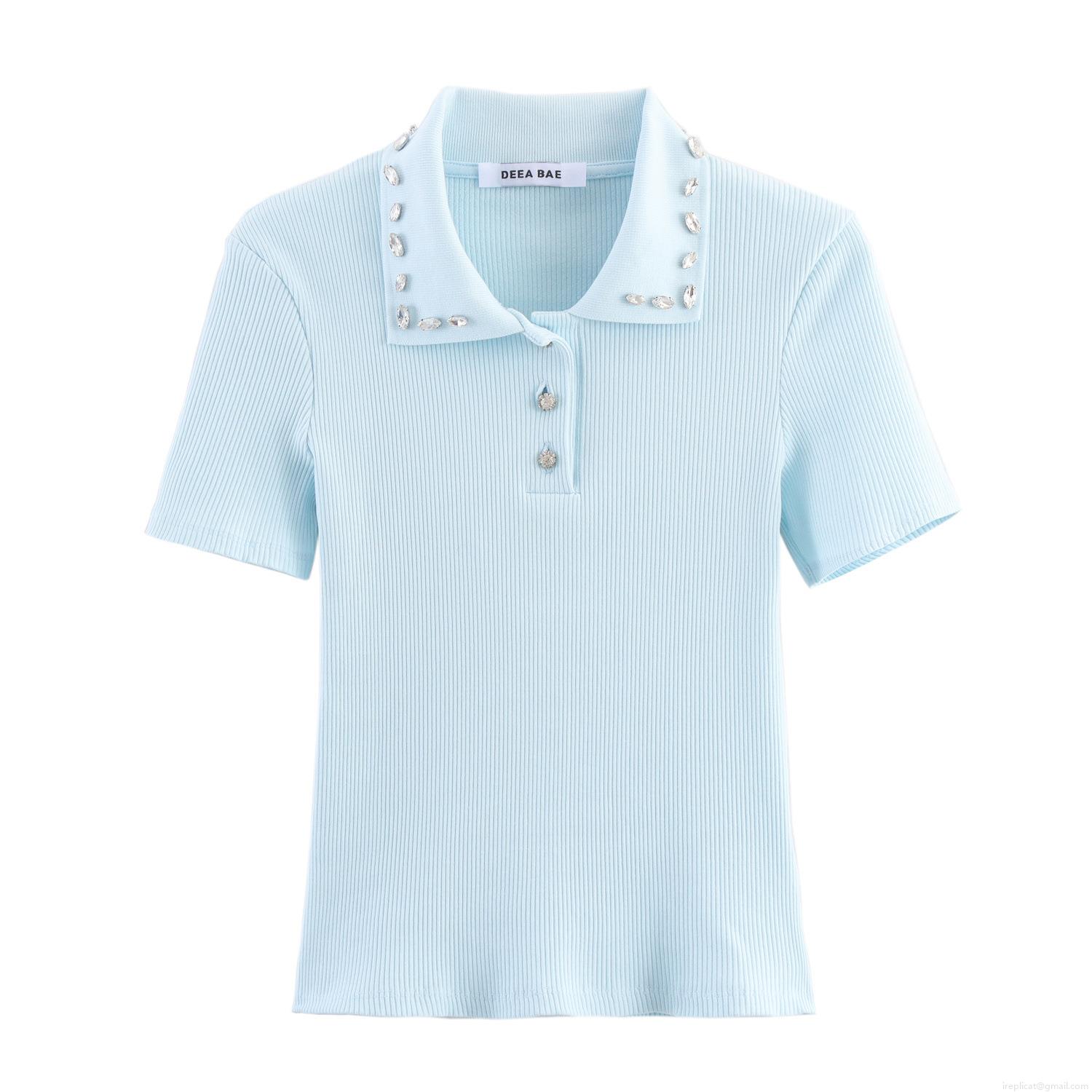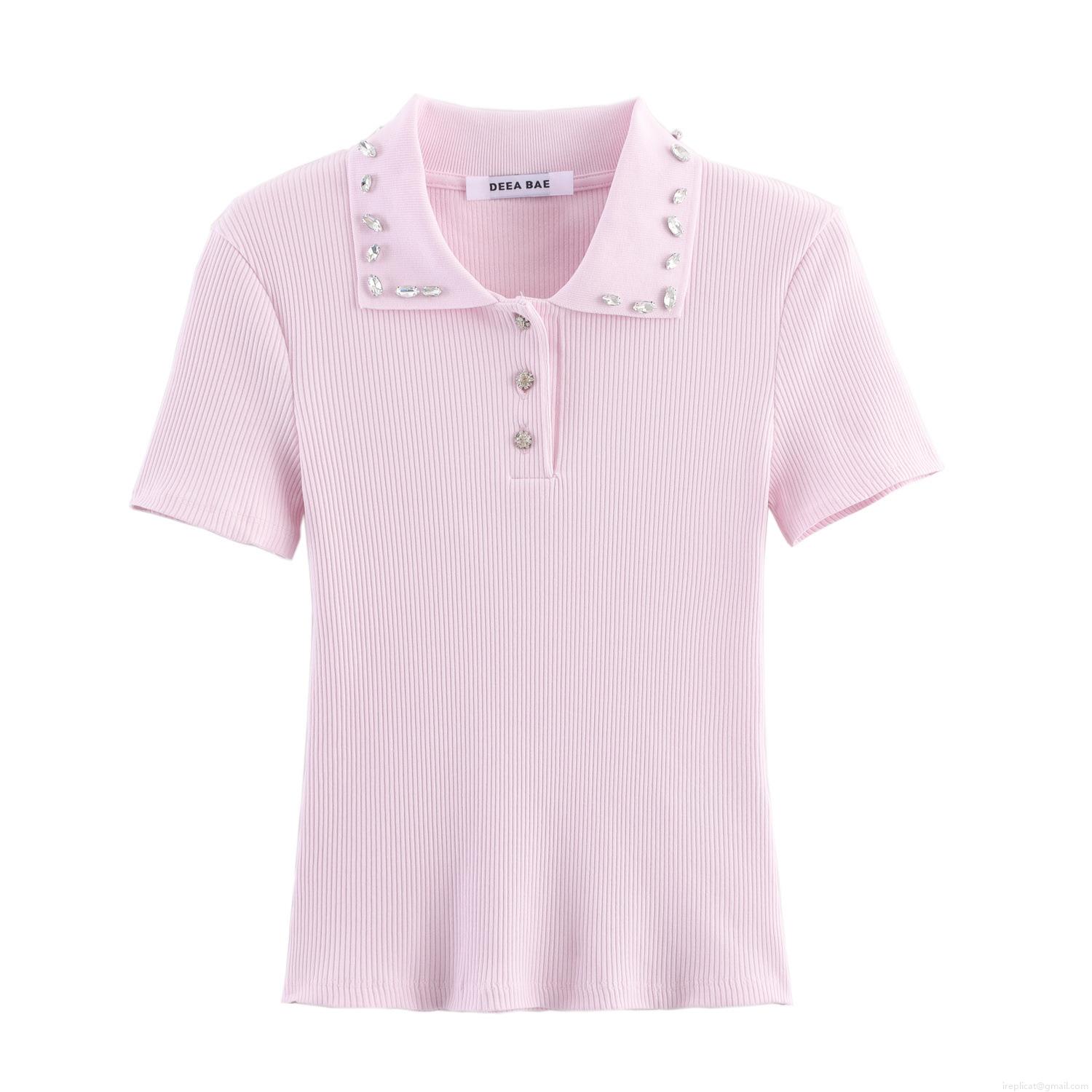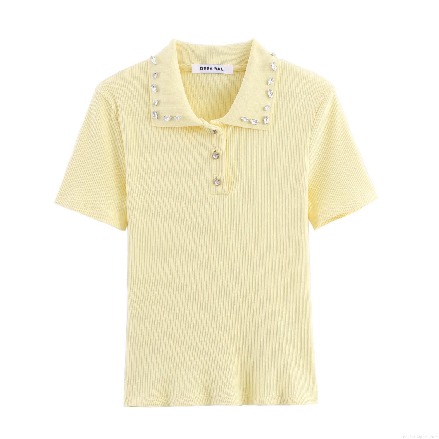 • Women's Knit Polo Shirt Short Sleeve Rhinestone Decorated Slim Fit Polyester Pullover Top Summer Autumn Street Style Casual Blouse