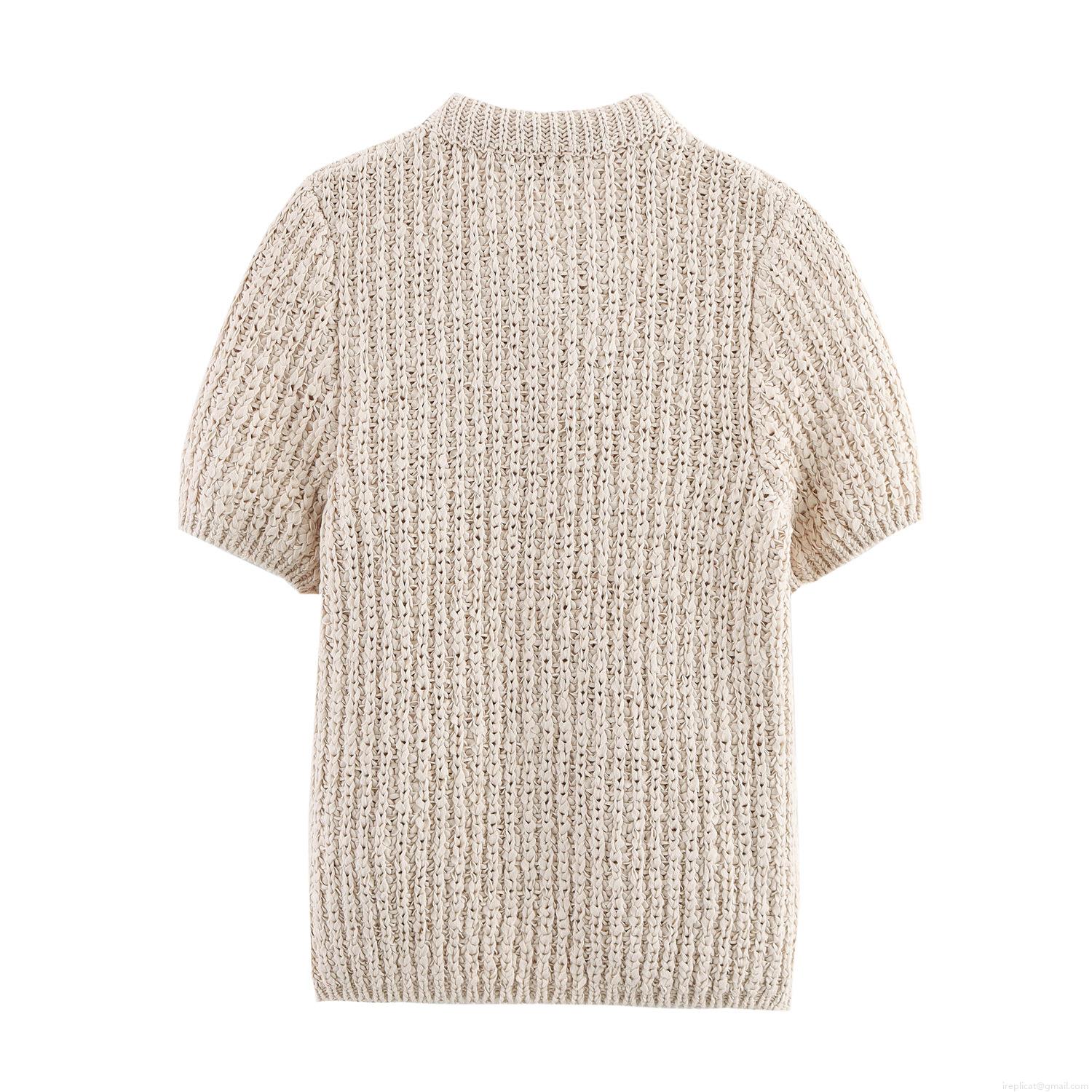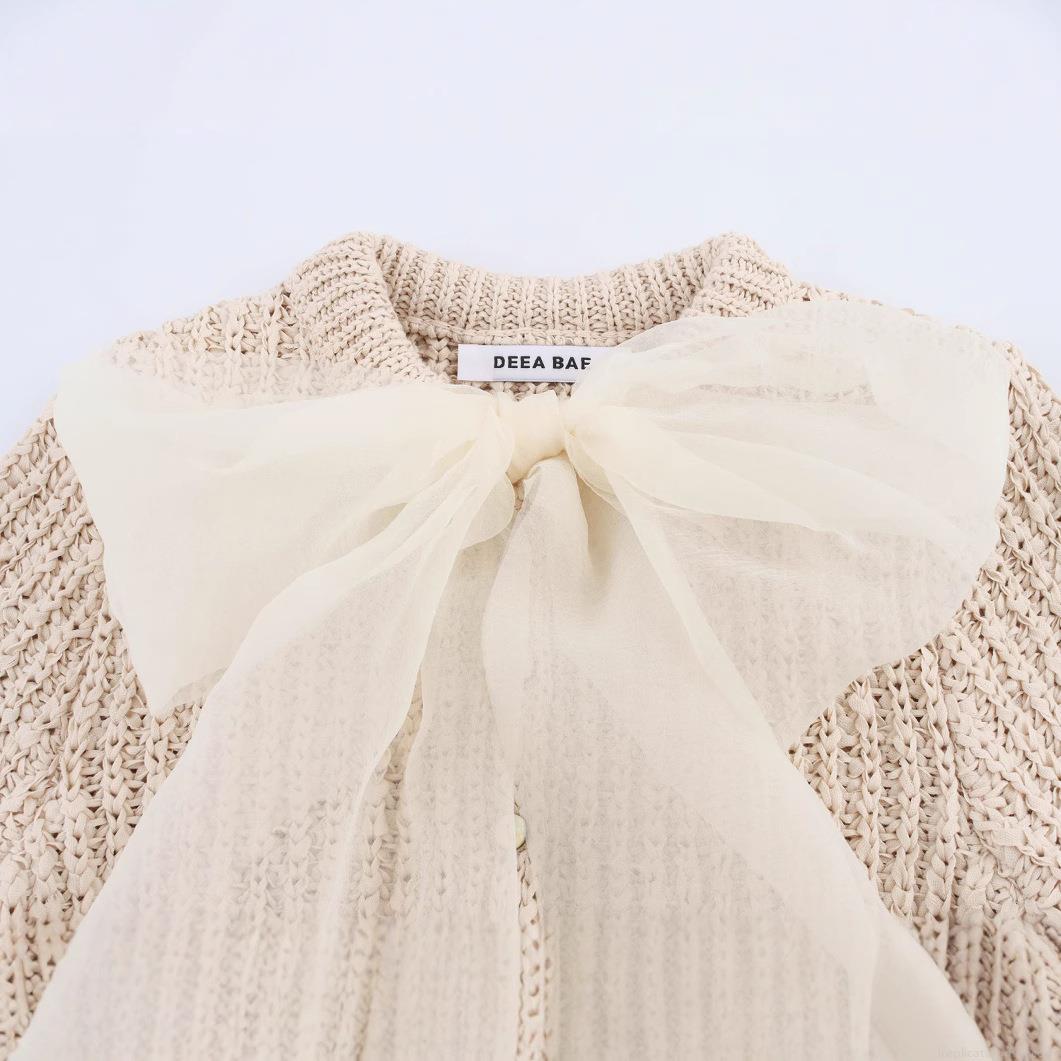 • Women's Knitted Polyester Short Sleeve T-Shirt With Large White Organza Bow Decoration Round Neck Off-White Elegant Pullover Top For Summer Party Streetwear