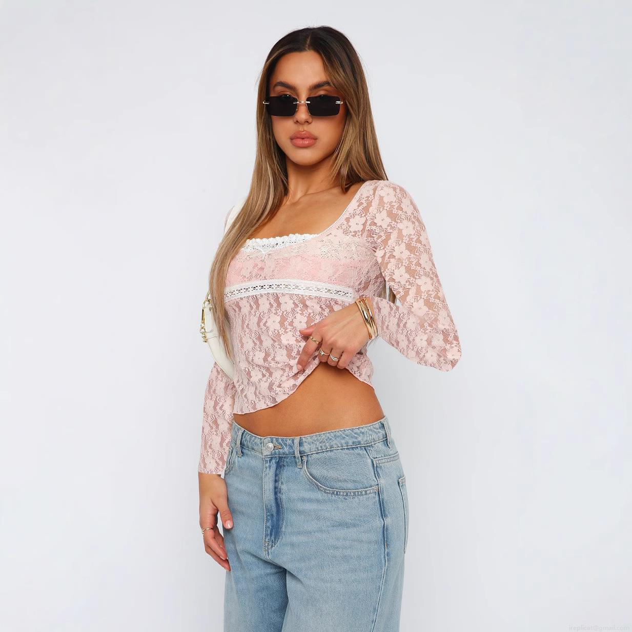 • Women's Lace Patchwork Long Sleeve T-Shirt Square Neck Slim Fit Cropped Top Sweet Girly Style Bow Decor Polyester Spandex For Dating