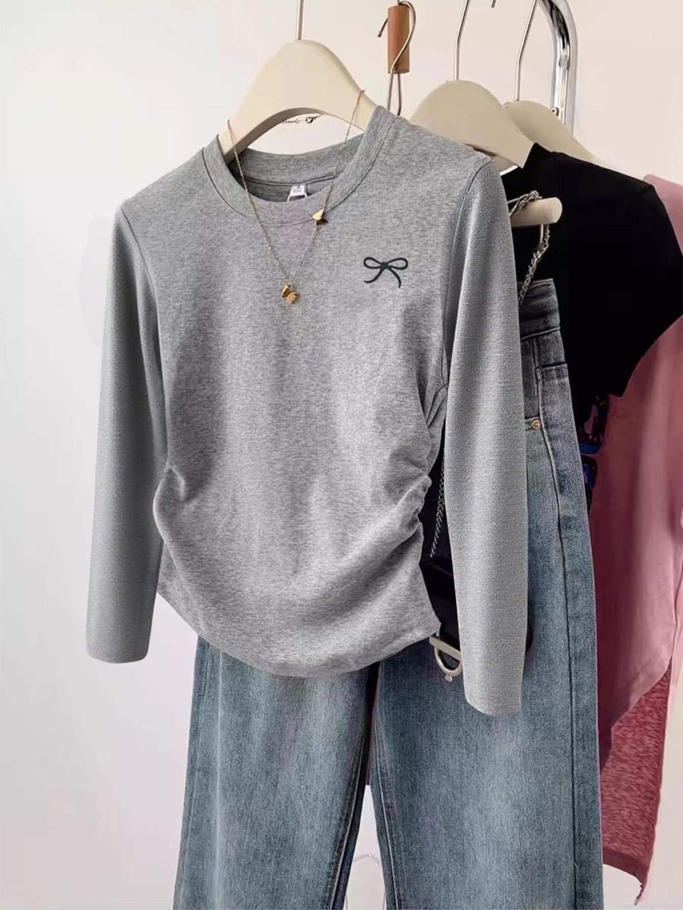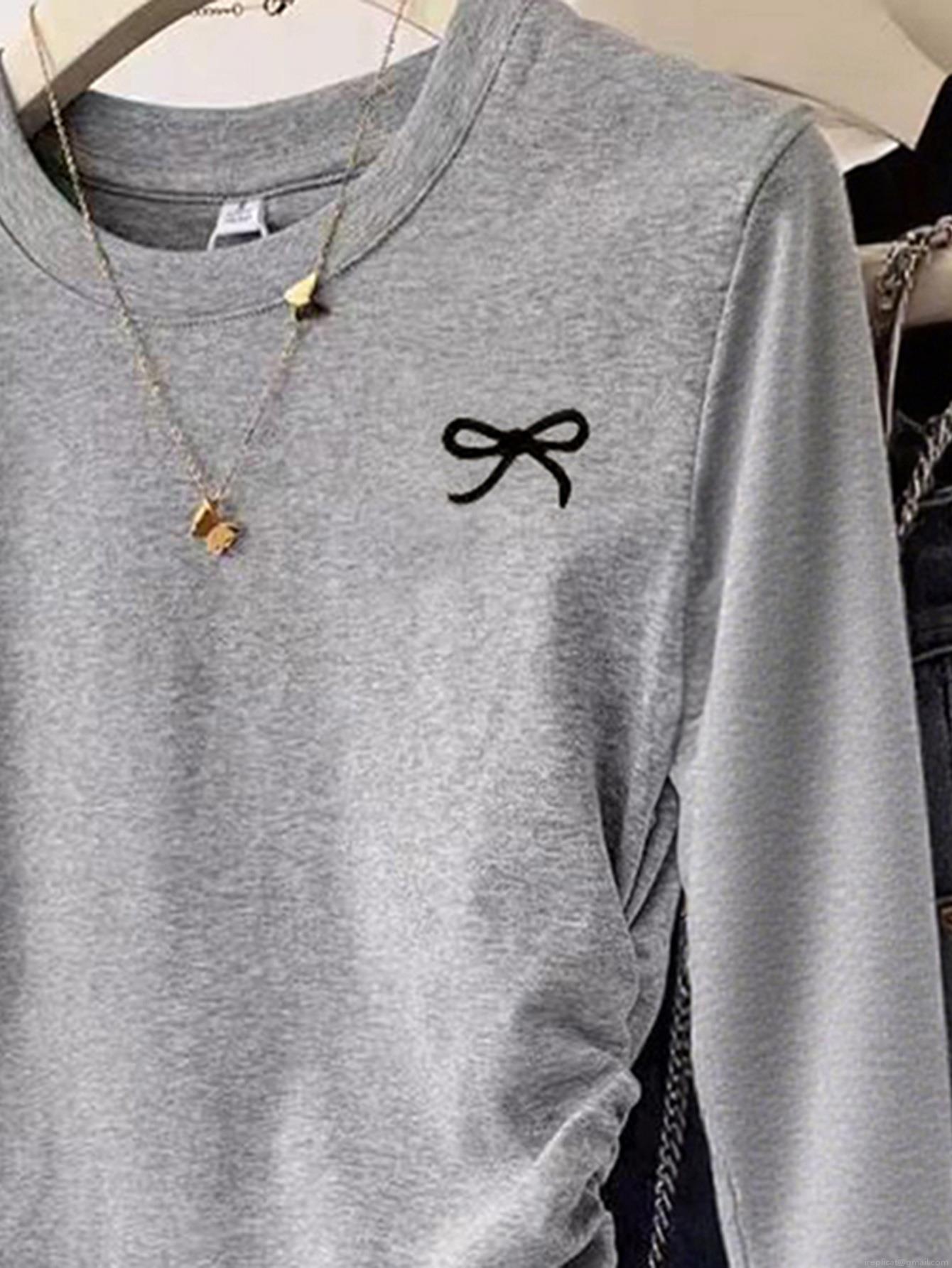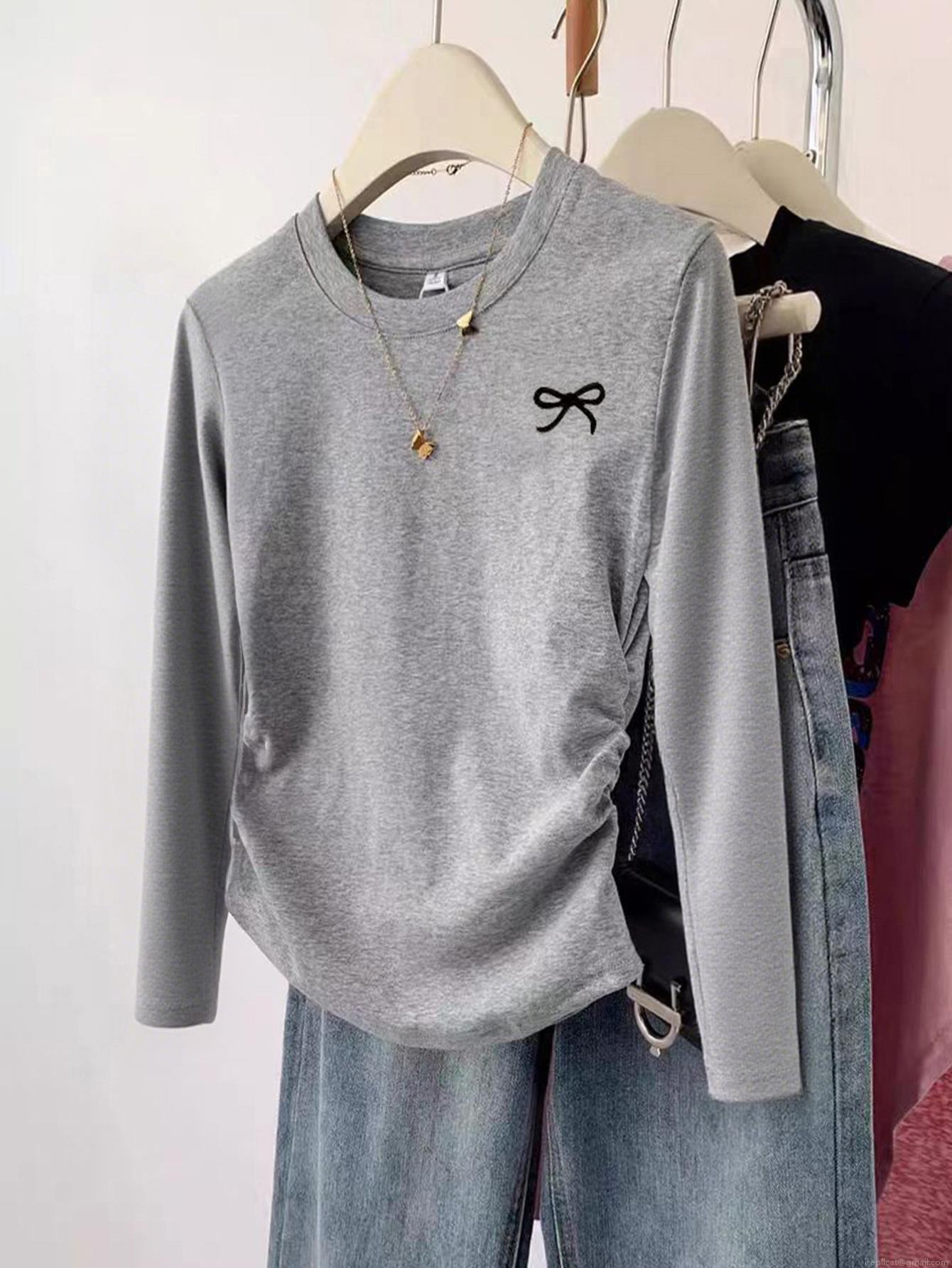 • Women's Long Sleeve T-Shirt Grey Polyester Spandex Knit Top With Bow Embroidery Ruched Side Slim Fit Round Neck Casual Tee For Women Daily Wear