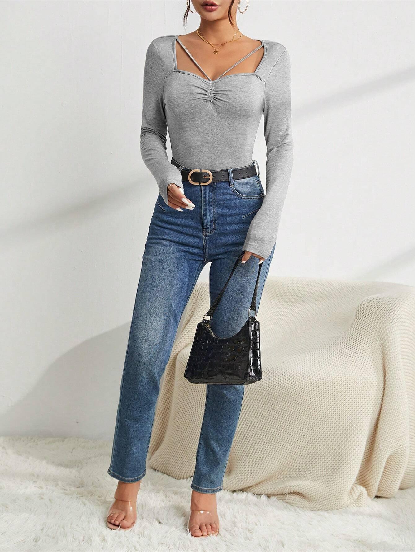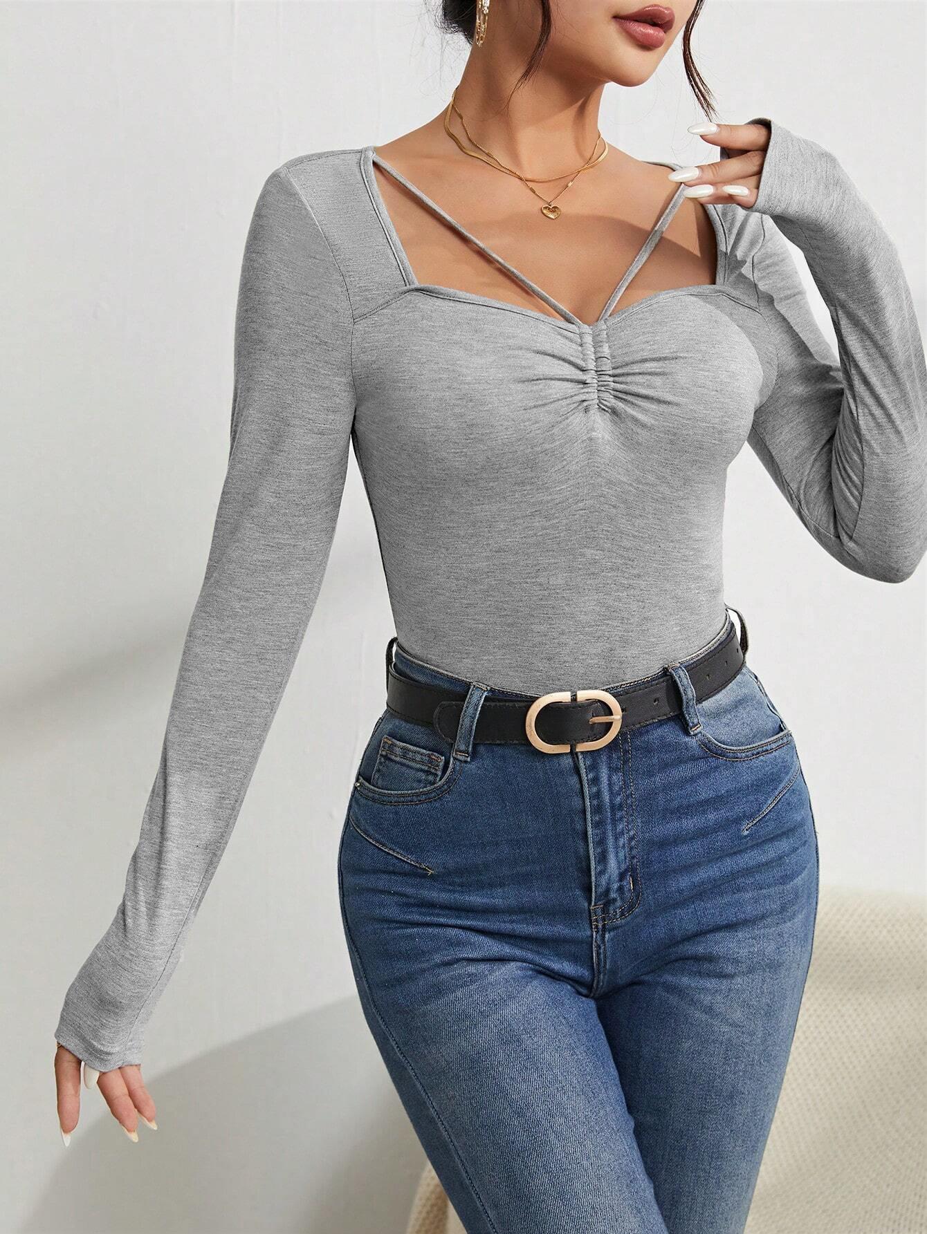 • Women's Long Sleeve T-Shirt Viscose Elastane Slim Fit Ruched Criss-cross Neckline Casual Basic Top Autumn Winter Streetwear Solid Color Grey