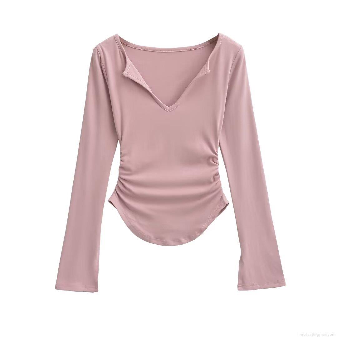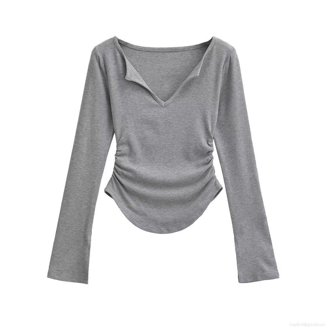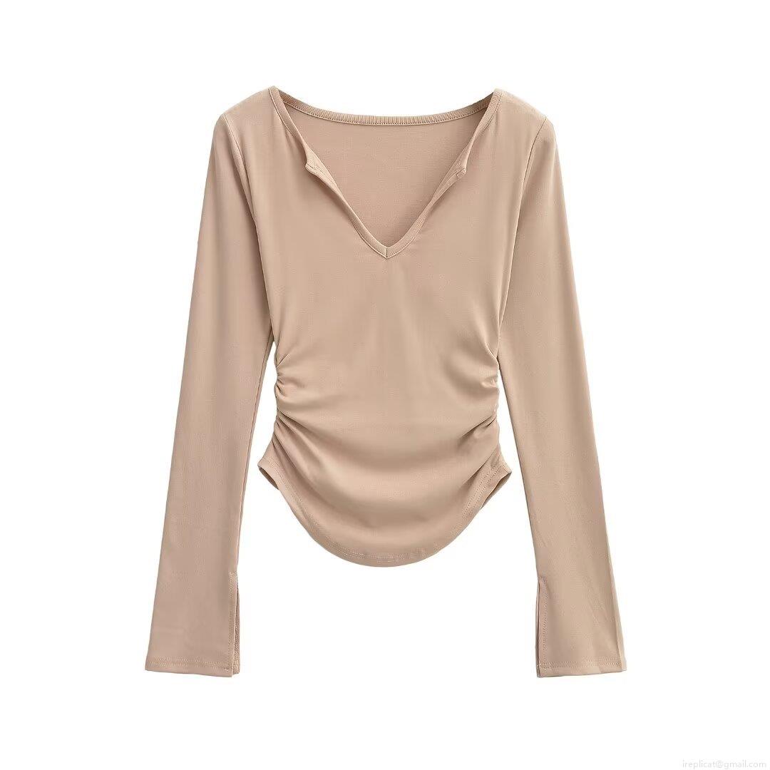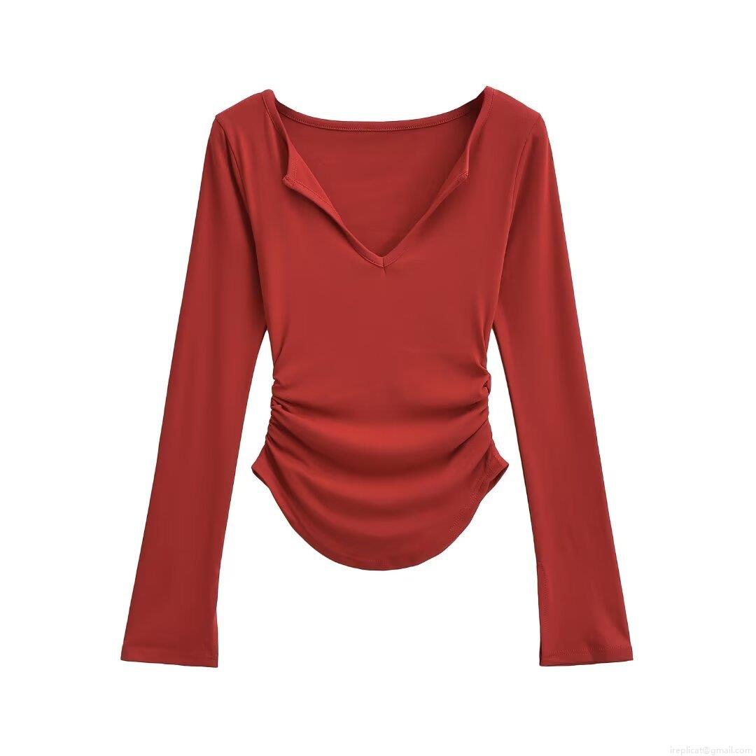 • Women's Long Sleeve V Neck Ruched T-Shirt Slim Fit Polyester Ribbed Knit Top Fashion Casual Streetwear Stretchy Undershirt For Women