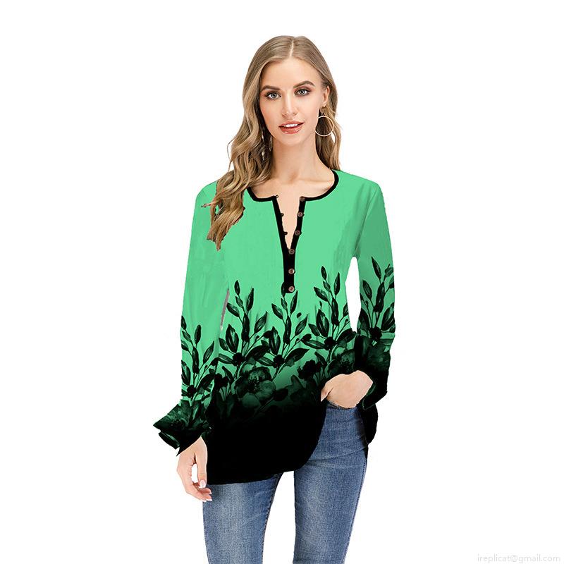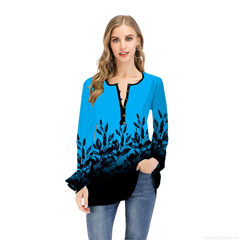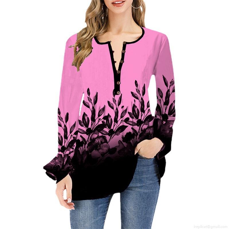 Women's Long Sleeve V-Neck Ombre T-Shirt Floral Printed Polyester Spandex Top Loose Casual Lotus Sleeve Pullover Shirt For Ladies