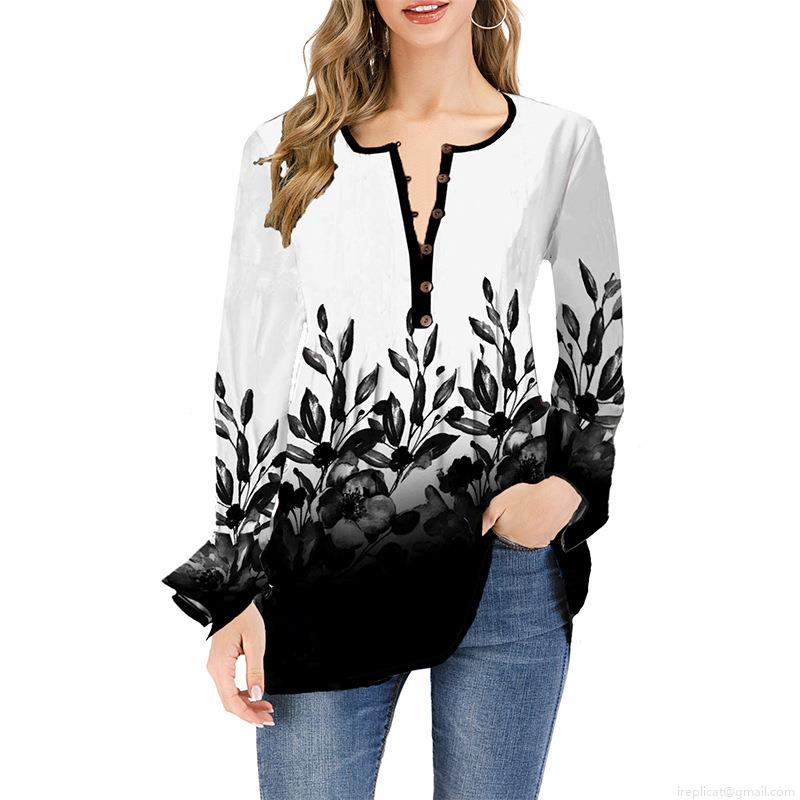 • Women's Long Sleeve V-Neck Ombre T-Shirt Floral Printed Polyester Spandex Top Loose Casual Lotus Sleeve Pullover Shirt For Ladies