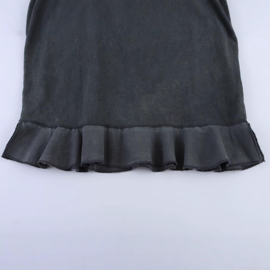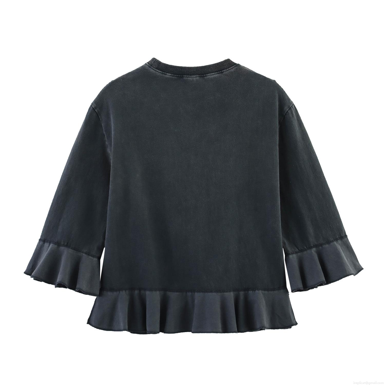 • Women's Loose Long Sleeve T-Shirt Washed Dark Grey Cotton Blend Ruffle Patchwork Pullover Top Streetwear Style Casual Wear