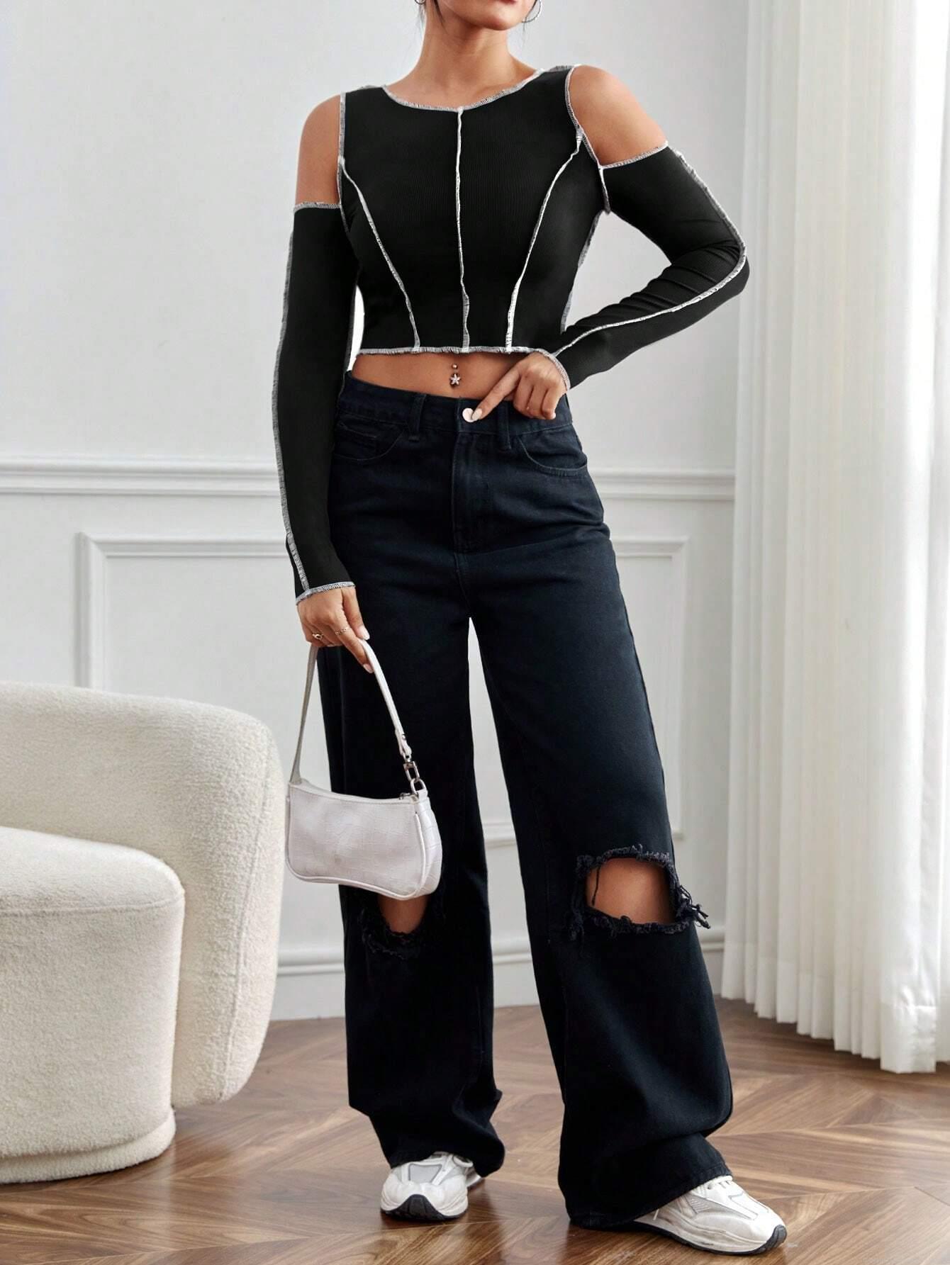 • Women's Off Shoulder Long Sleeve T-Shirt Ribbed Knit Crop Top Sexy Cold Shoulder Slim Fit Tee With White Contrast Stitching Casual Y2K Style Tops