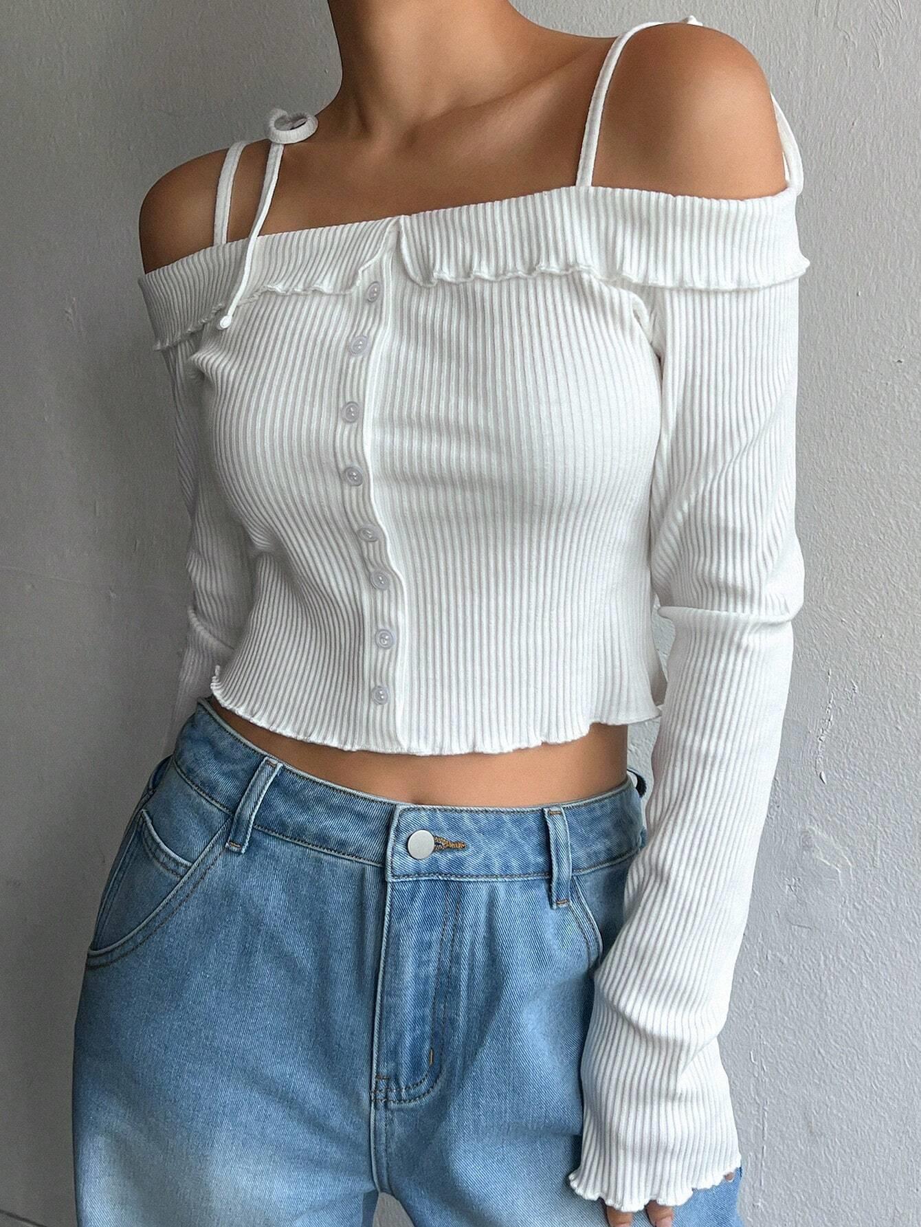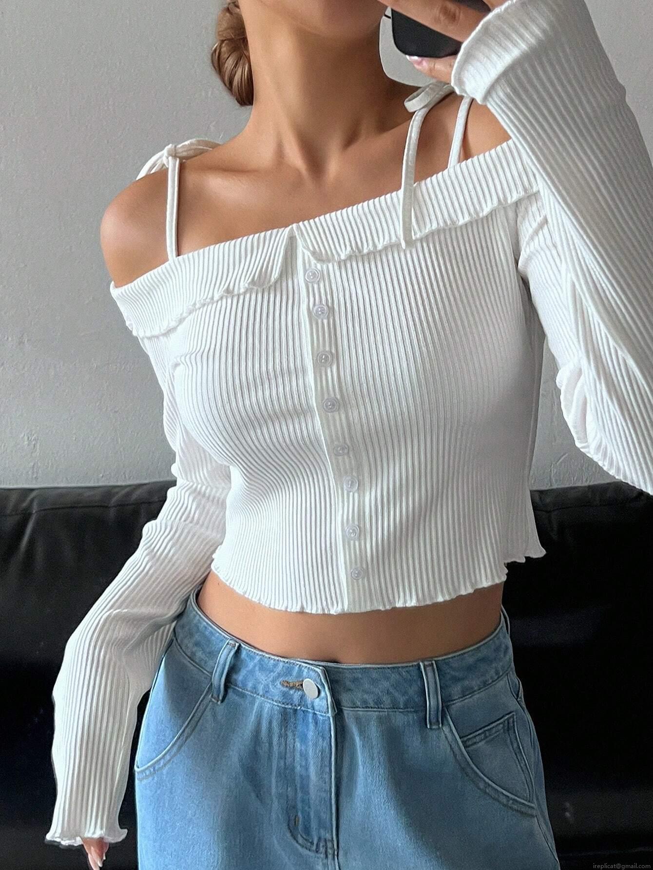 • Women's Off The Shoulder Long Sleeve T-Shirt Ribbed Knit Button Front Slim Fit Crop Top Casual Sweet Style Cotton Blend Basic Tee