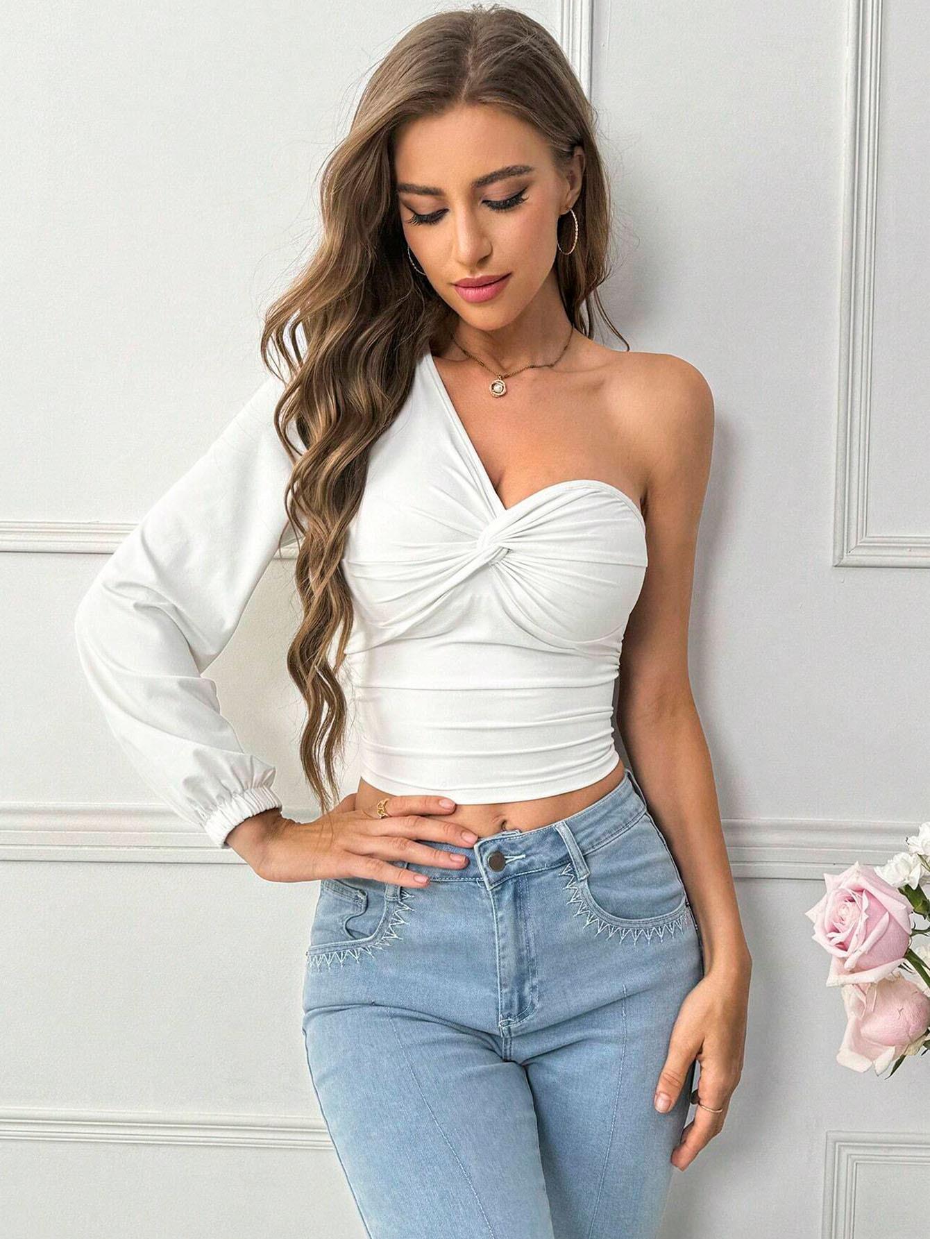 • Women's One Shoulder Long Sleeve T-Shirt Asymmetric Twist Front Slim Fit Crop Top Solid Color Polyester Trendy Streetwear Autumn Casual Top