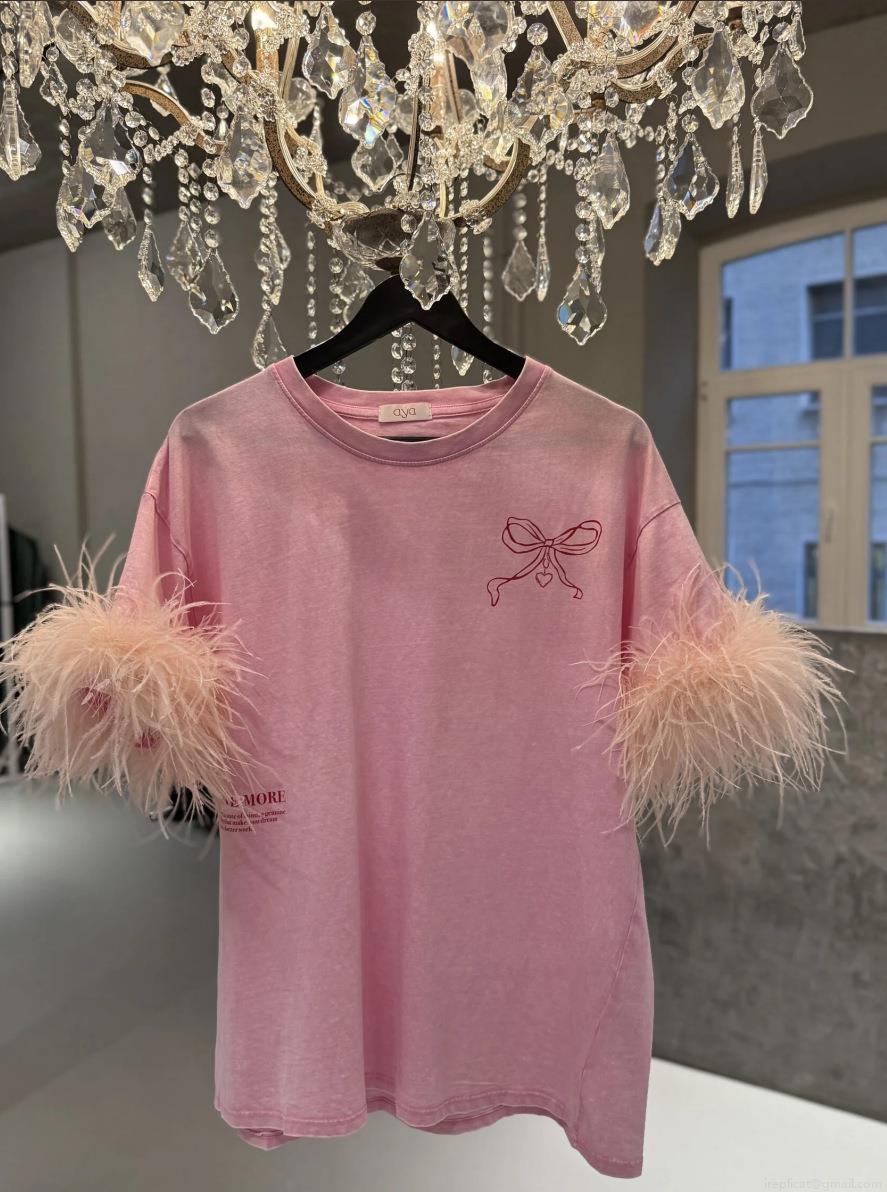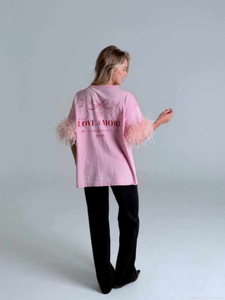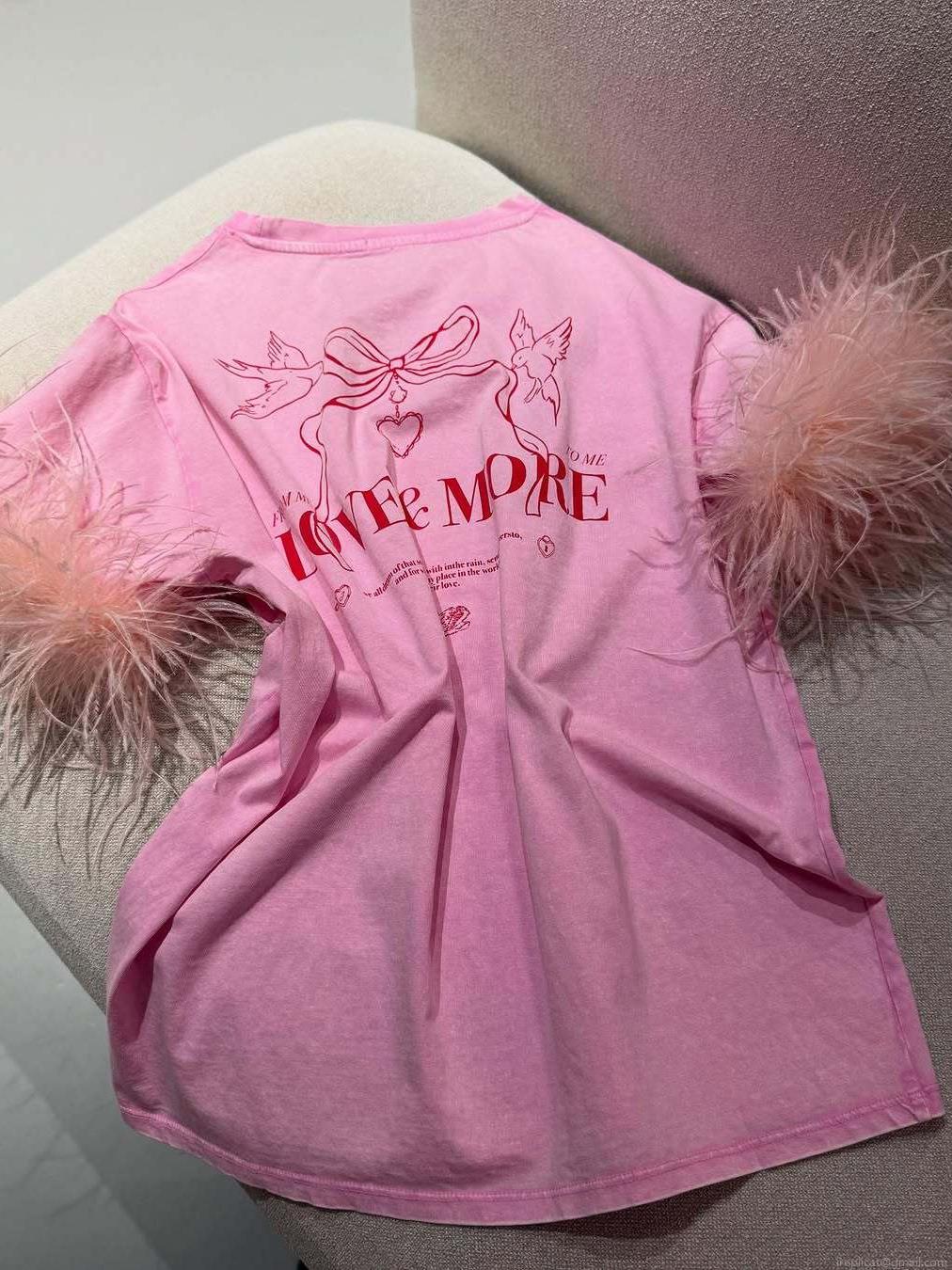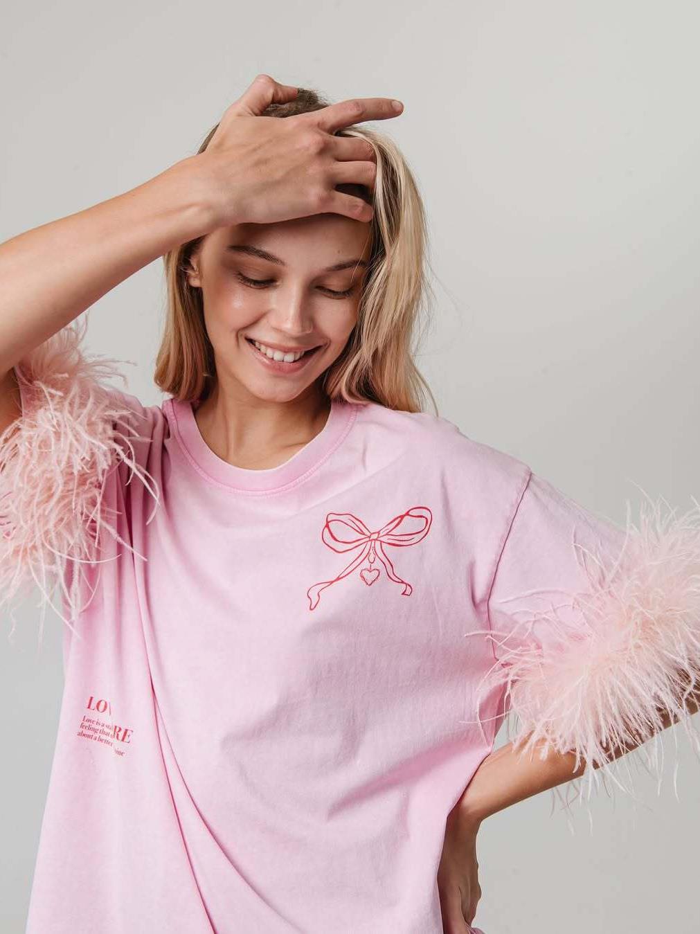 Women's Oversized 100% Cotton T-Shirt With Feather Patchwork Cuffs Pink Short Sleeve Top Bow Heart Print Casual Streetwear Tee