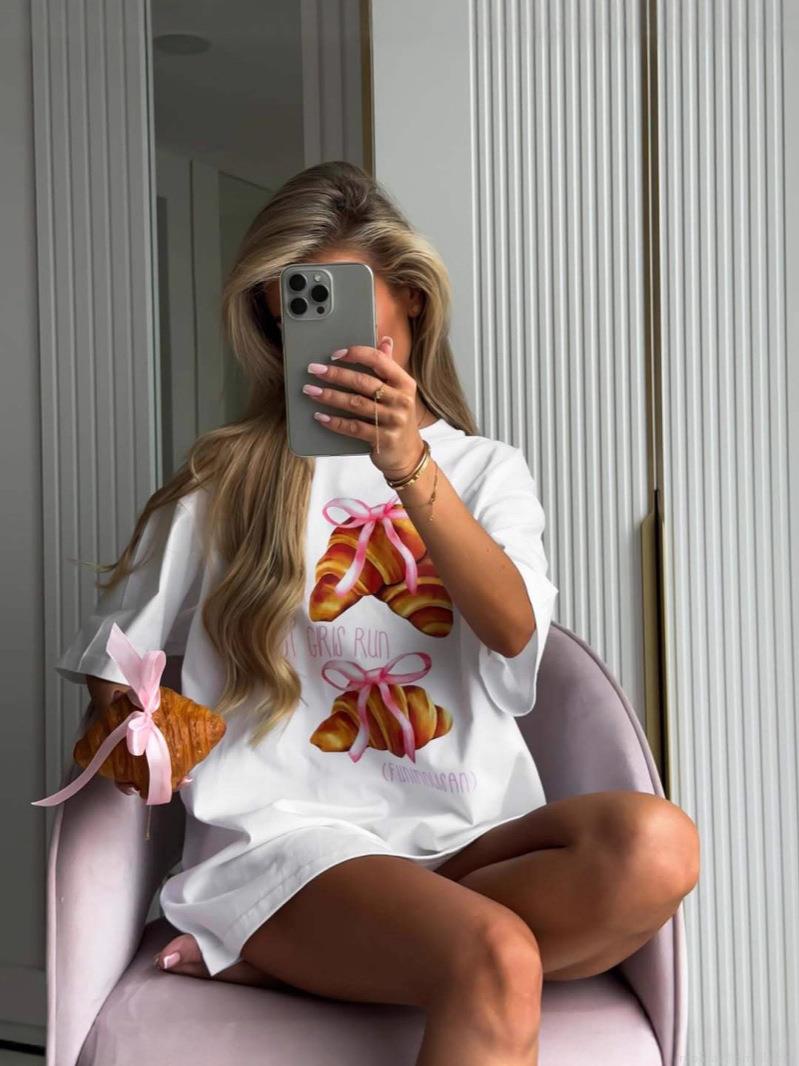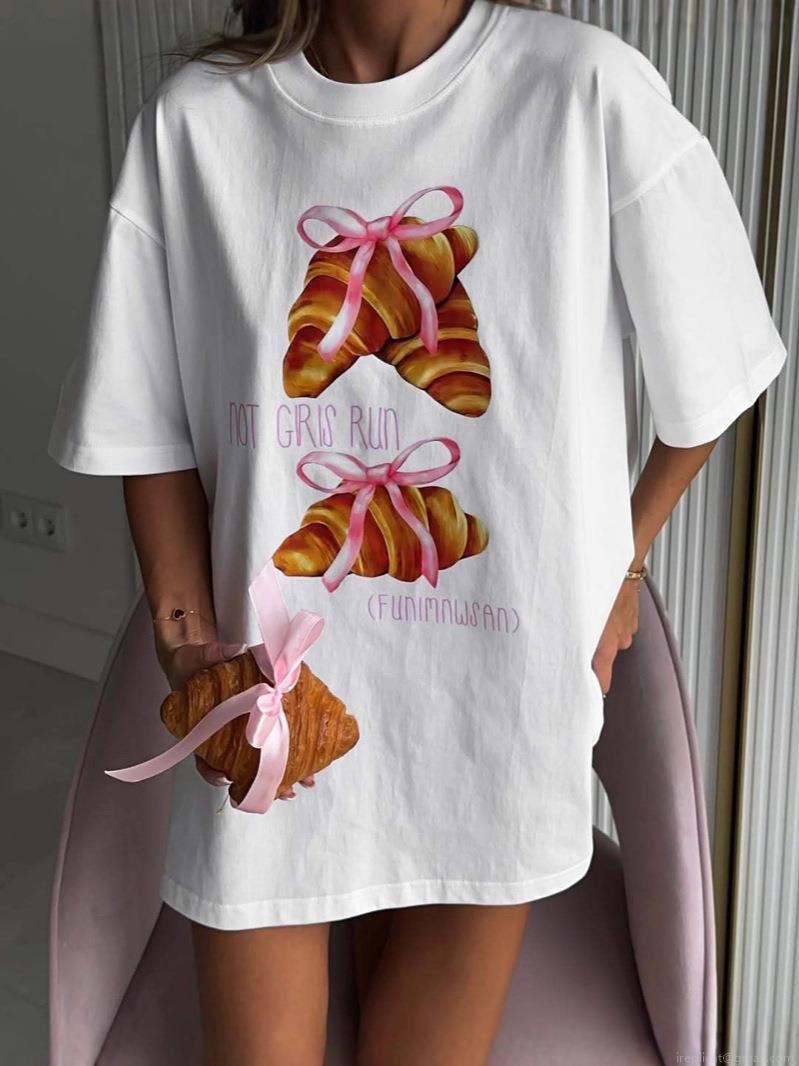 • Women's Oversized Cotton Blend T-Shirt Casual Short Sleeve Croissant Bowknot Print Loose Fit Streetwear Tee Top for Women Daily Wear