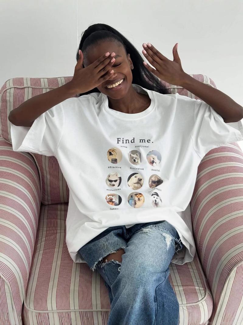• Women's Oversized Cotton Blend T-Shirt Funny Dog Photo Grid Graphic Print Short Sleeve Crew Neck Loose Casual Summer Streetwear Tee Top for Women