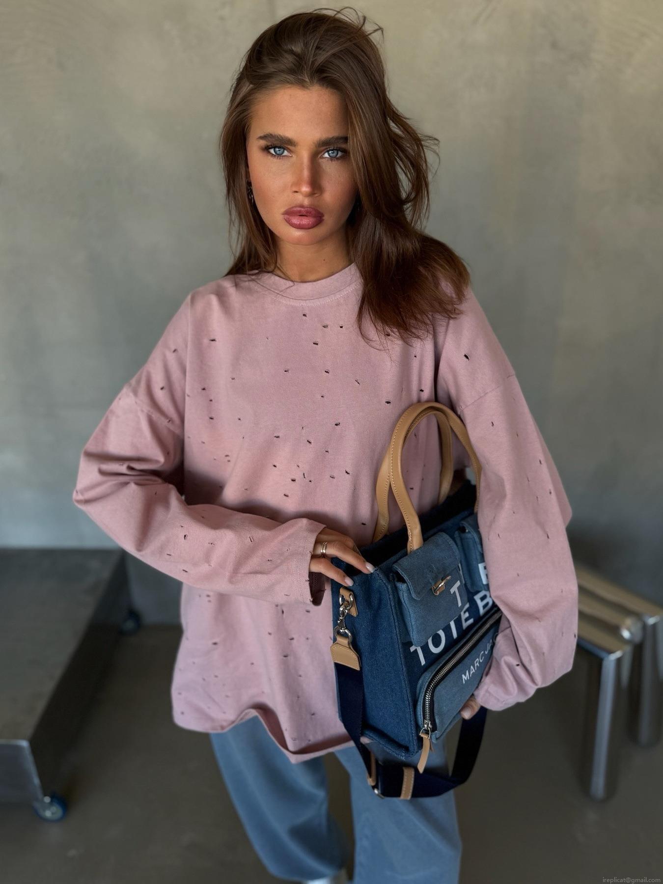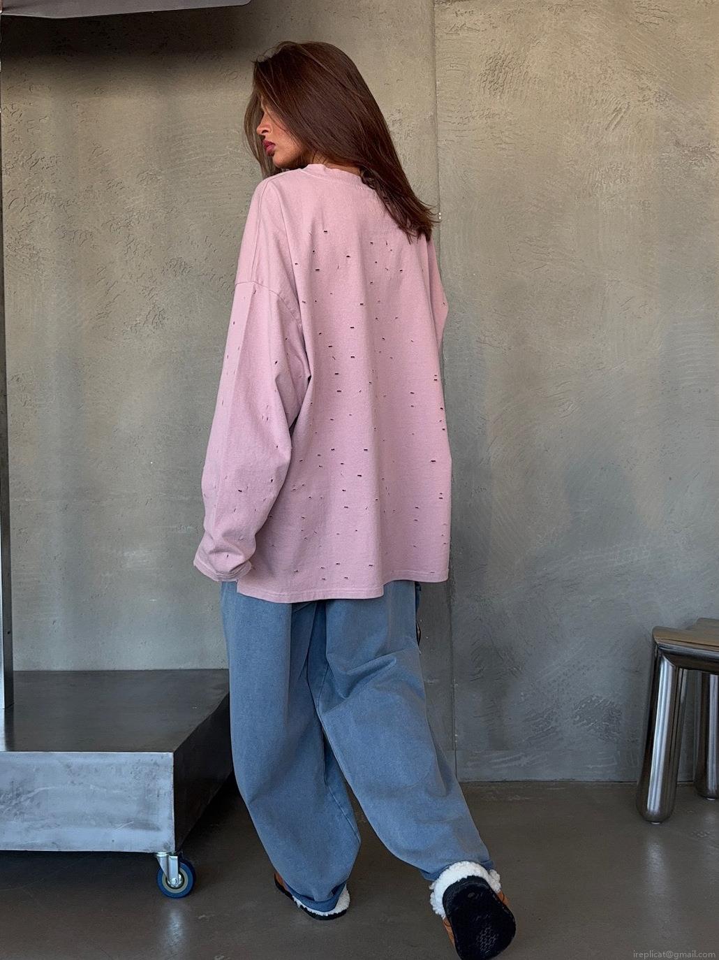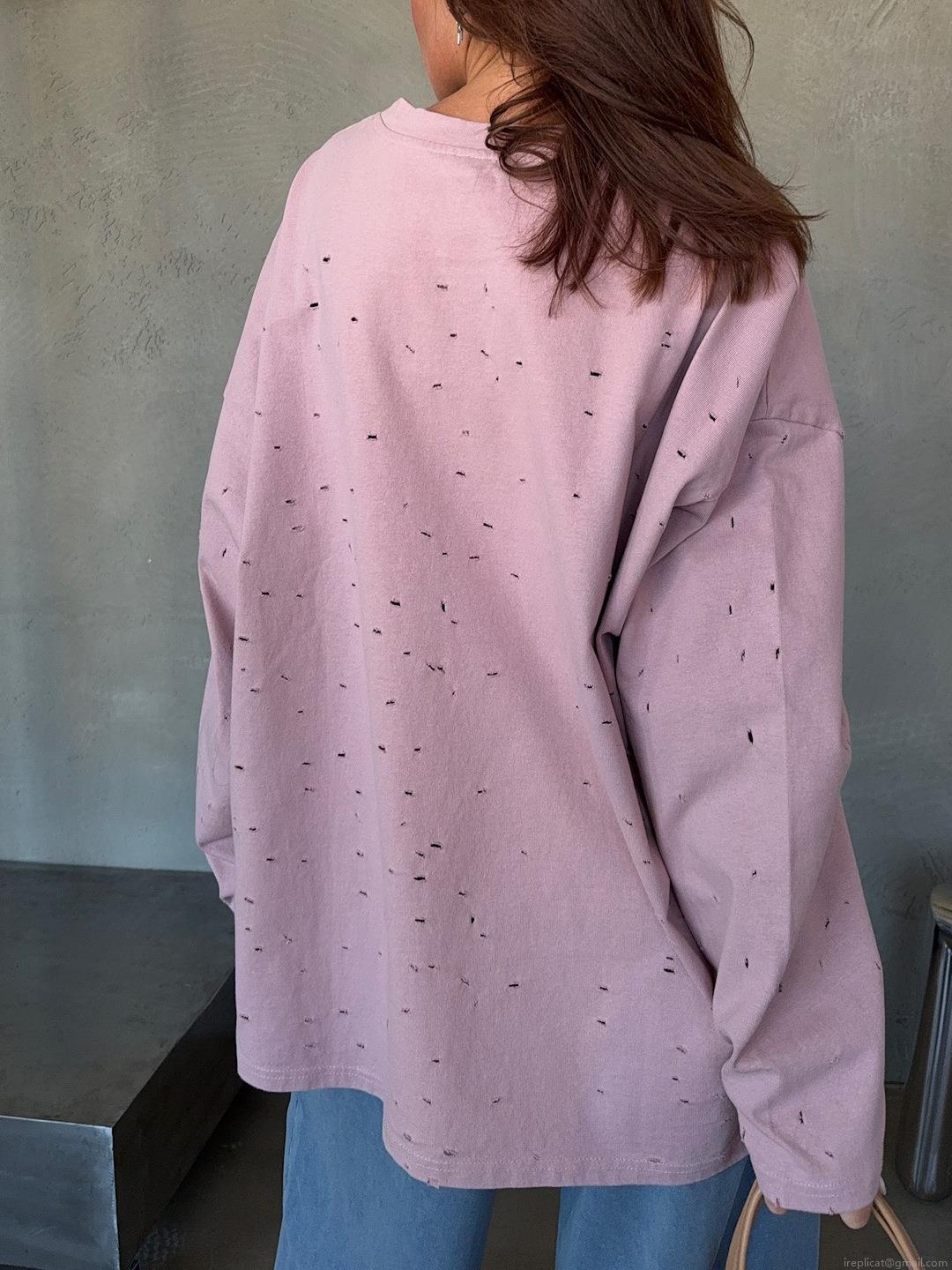 • Women's Oversized Distressed Long Sleeve T-Shirt Cotton Blend Ripped Detail Crew Neck Streetwear Loose Fit Solid Pink Casual Pullover Tops