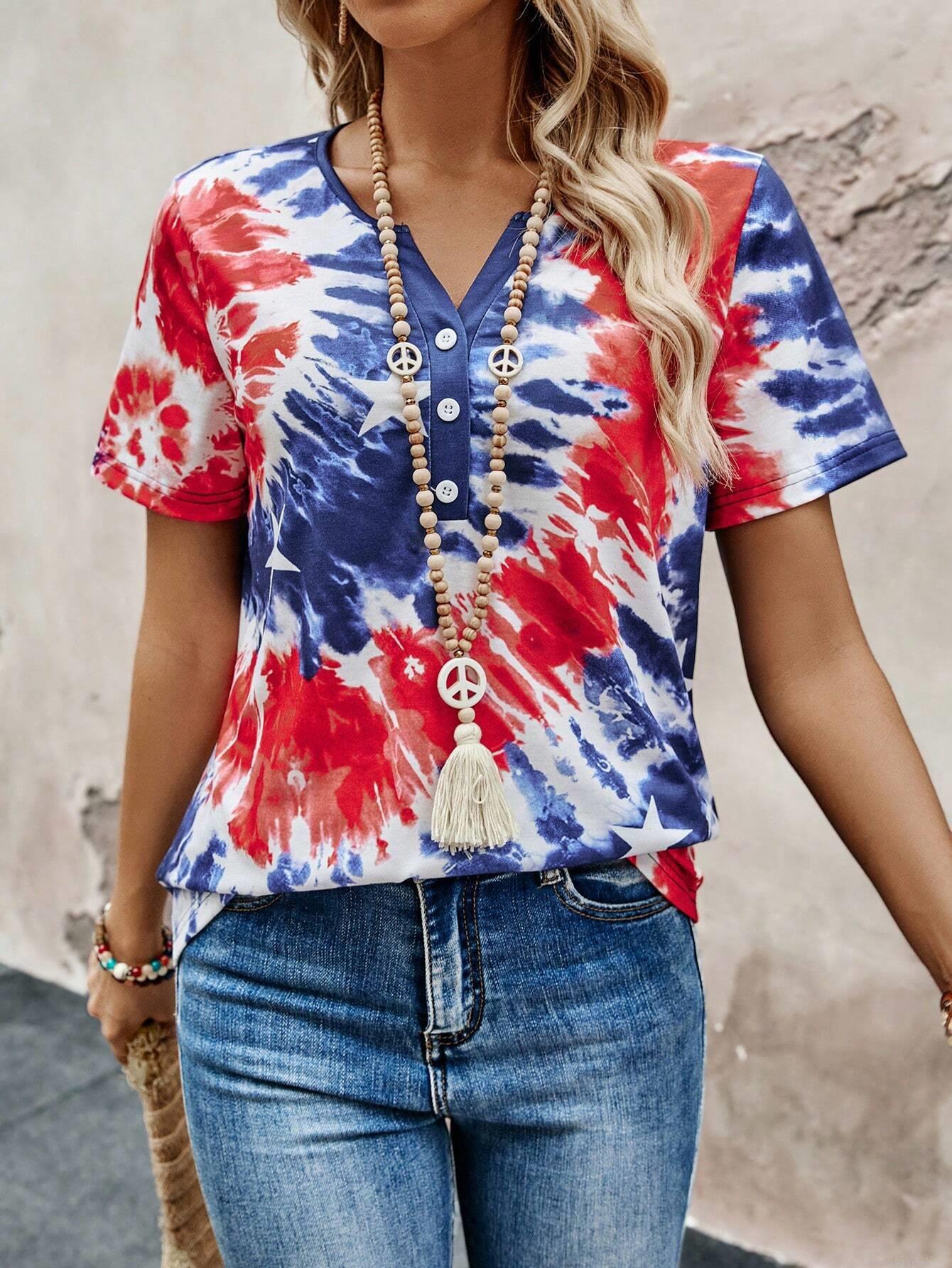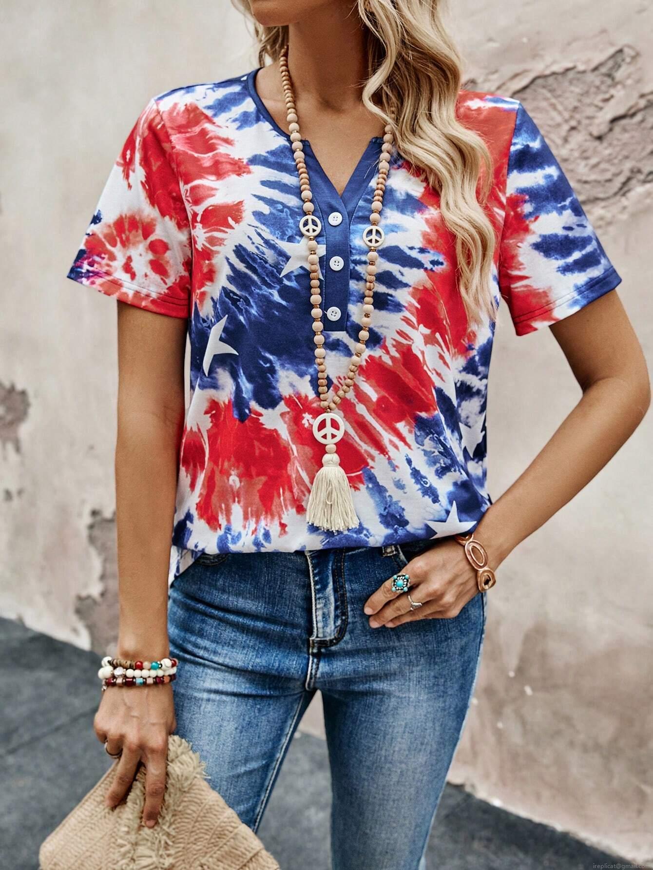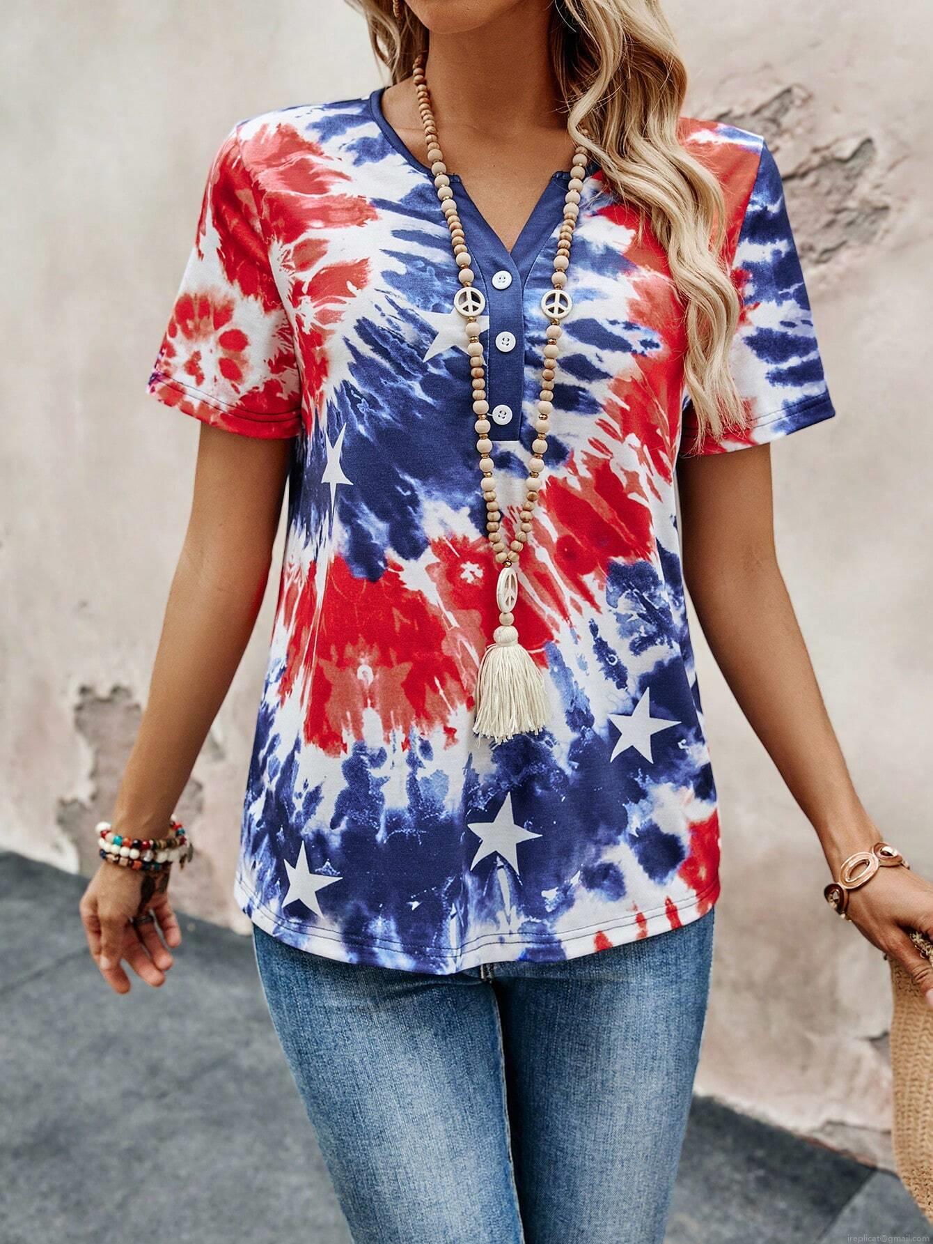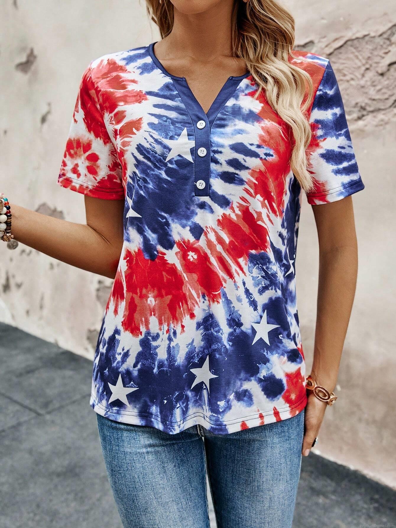 Women's Patriotic Red White Blue Tie Dye Short Sleeve T-Shirt Star Print V-Neck Button Down Casual Summer Vacation Tee Top