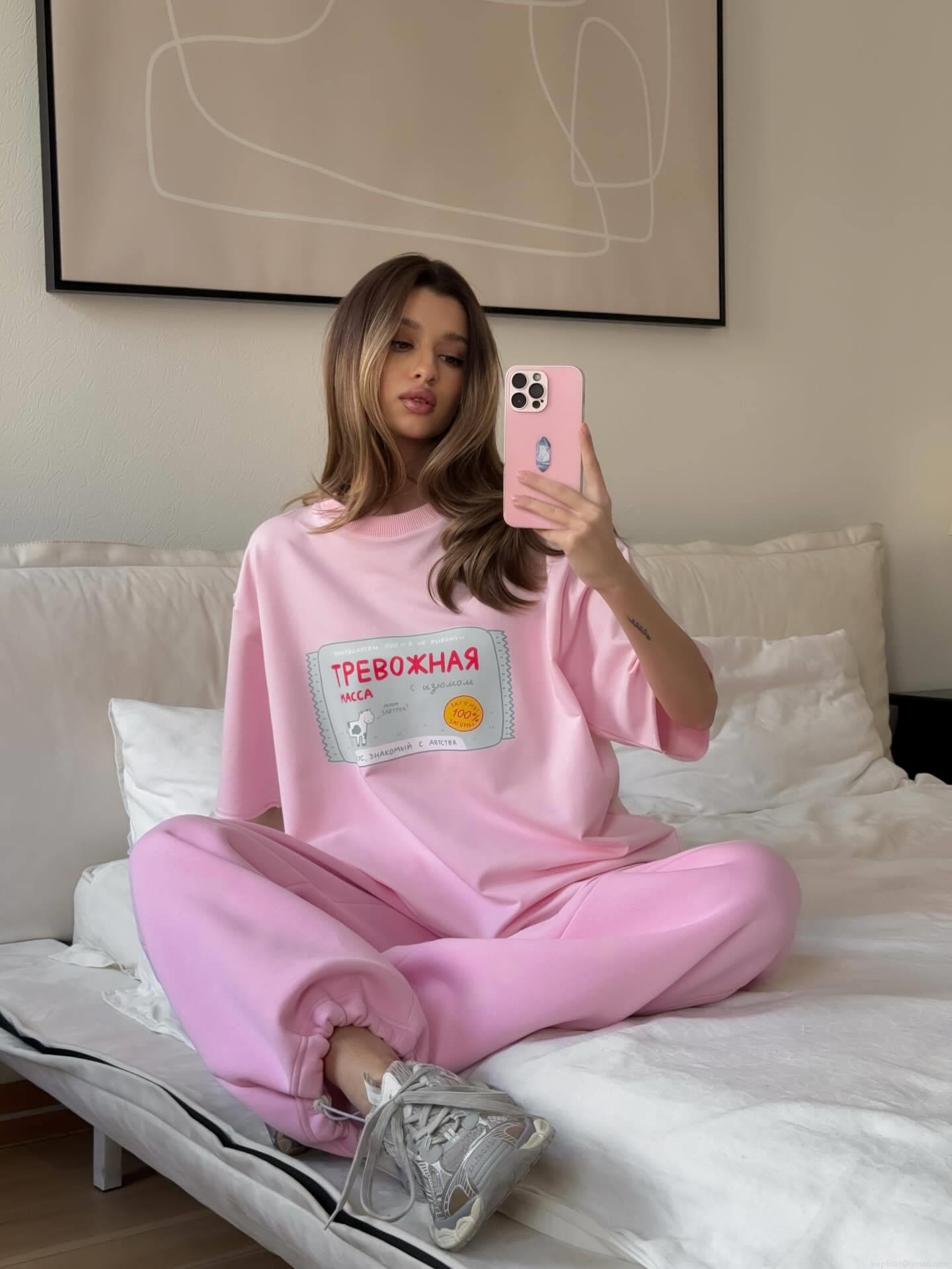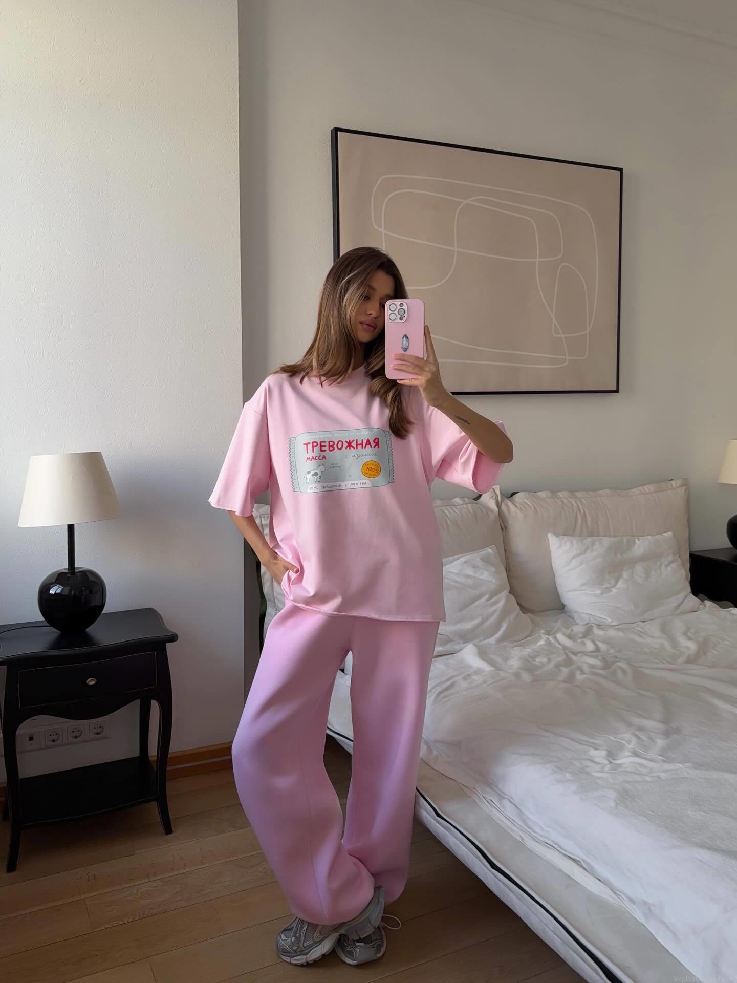 • Women's Pink Cotton Graphic T-Shirt Loose Drop Shoulder Short Sleeve Top Casual Russian Style Milk Label Print Comfortable Streetwear For Summer Daily