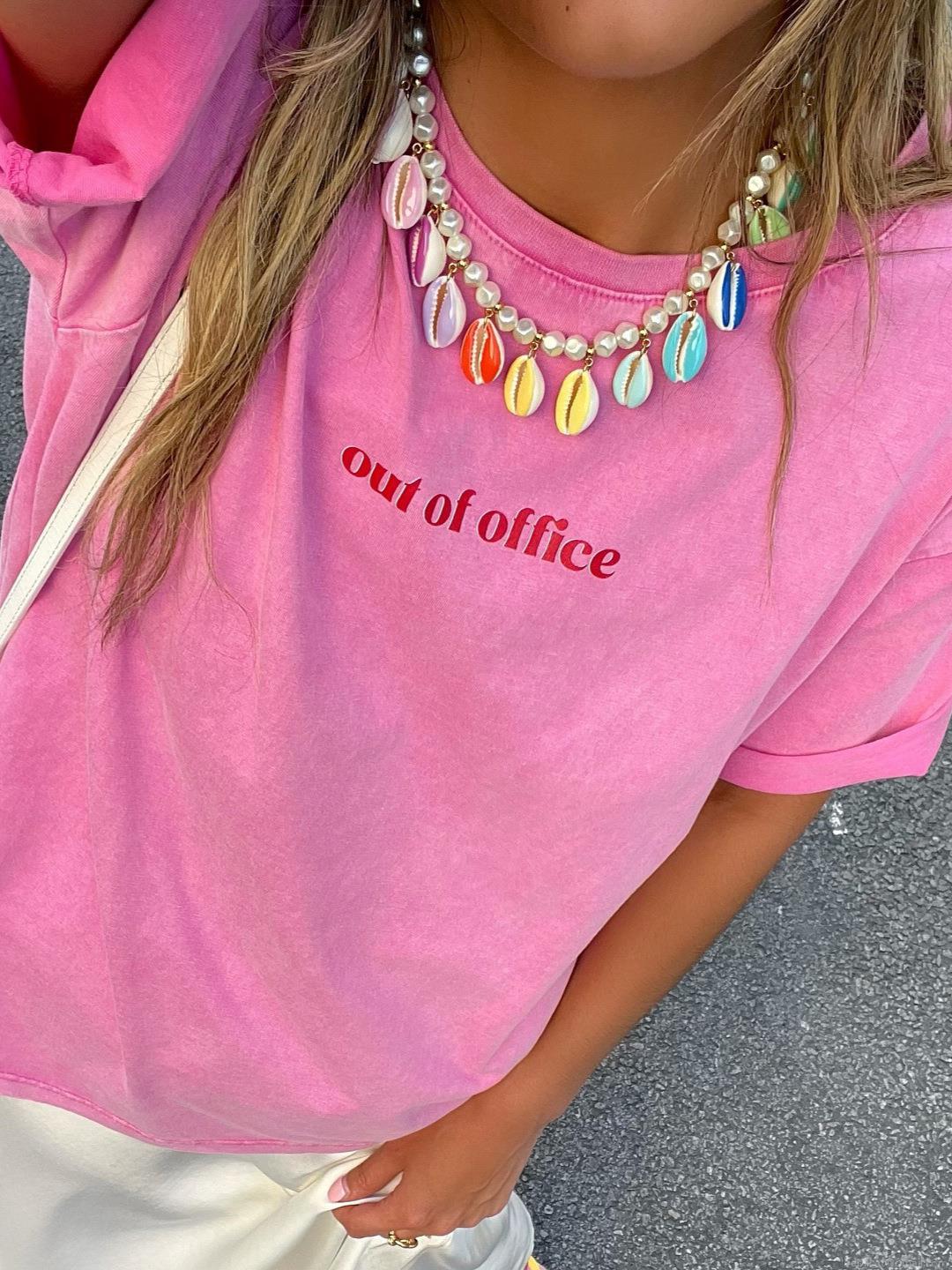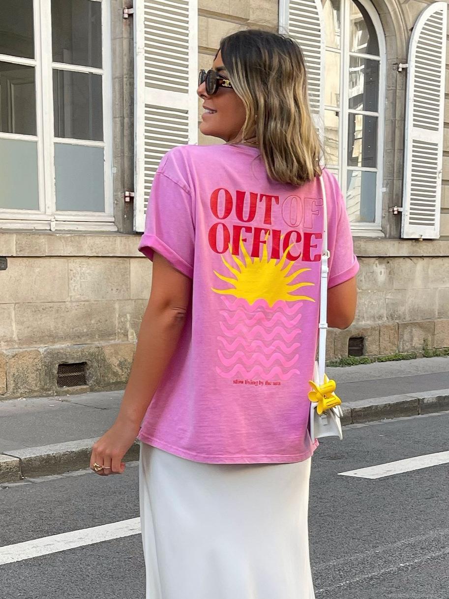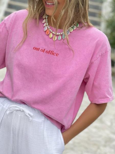 • Women's Pink Cotton Short Sleeve T-Shirt With Out Of Office Letter Print Summer Vacation Casual Loose Fit Oversized Tee Streetwear Dopamine Style Top
