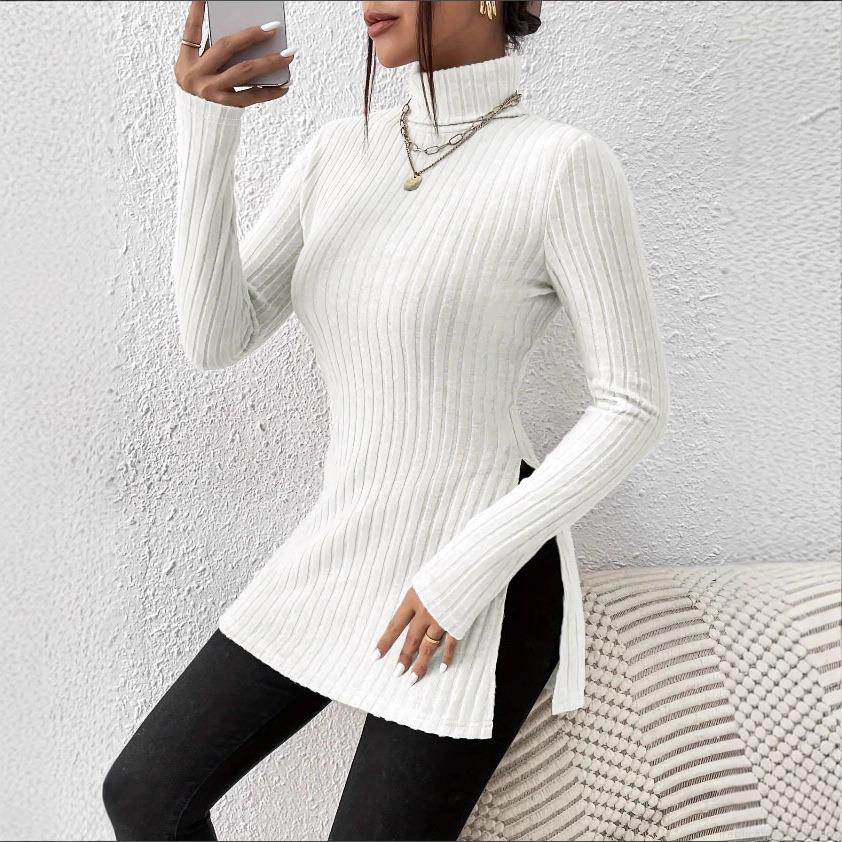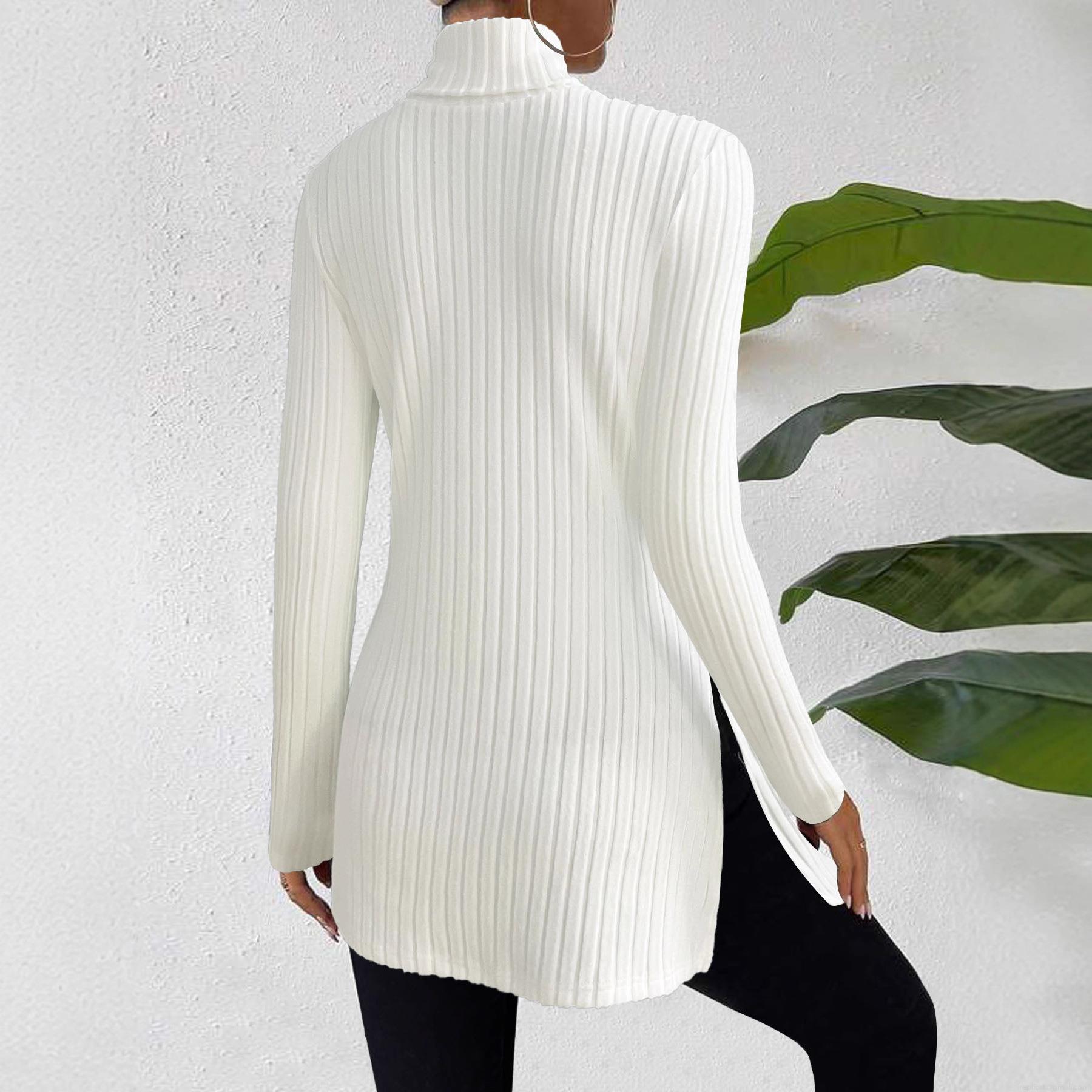 • Women's Plus Size Turtleneck Knit Top Ribbed Long Sleeve Slim Fit T-Shirt Side Slit Mid-Length Pullover Casual Solid Color Base Layer Shirt
