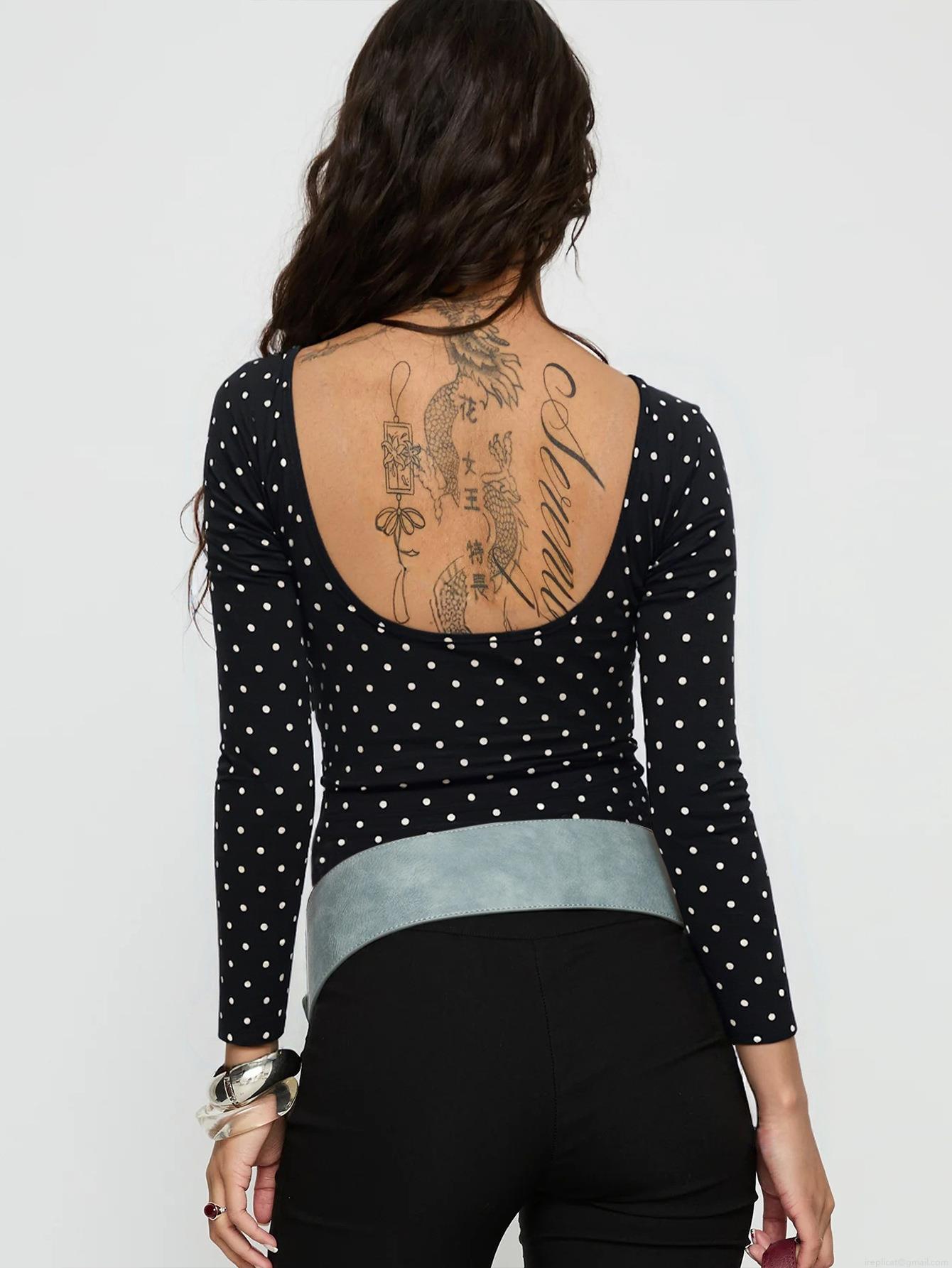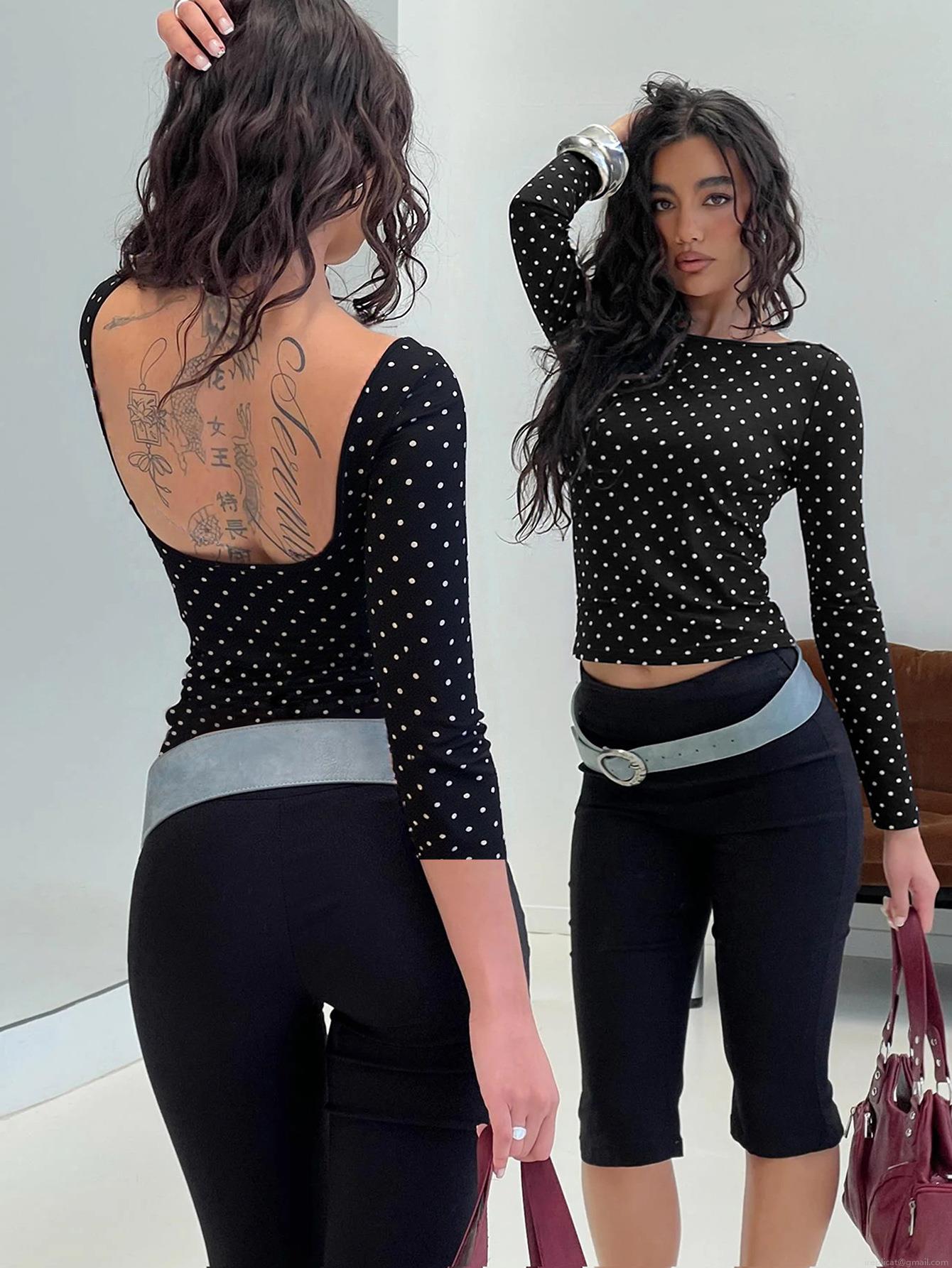 • Women's Polka Dot Long Sleeve T-Shirt Backless Slim Fit Round Neck Polyester Elastane Blend Retro Casual Base Layer Top For Autumn Winter Streetwear