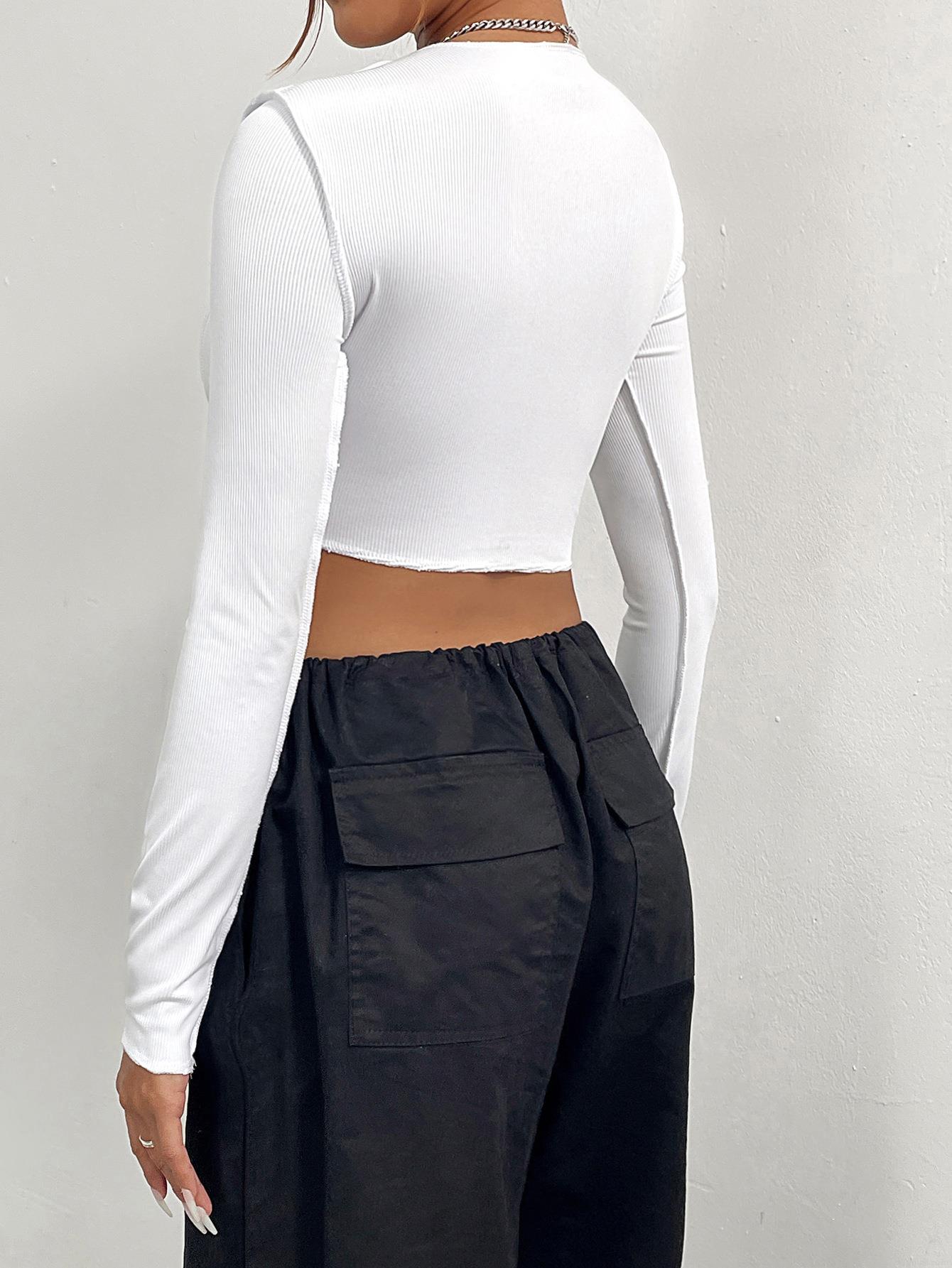 • Women's Polyester Elastane Ribbed Knit Long Sleeve Crop Top Sexy Hollow Out Front Tie-up T-Shirt Slim Fit Crew Neck Streetwear Top for Ladies