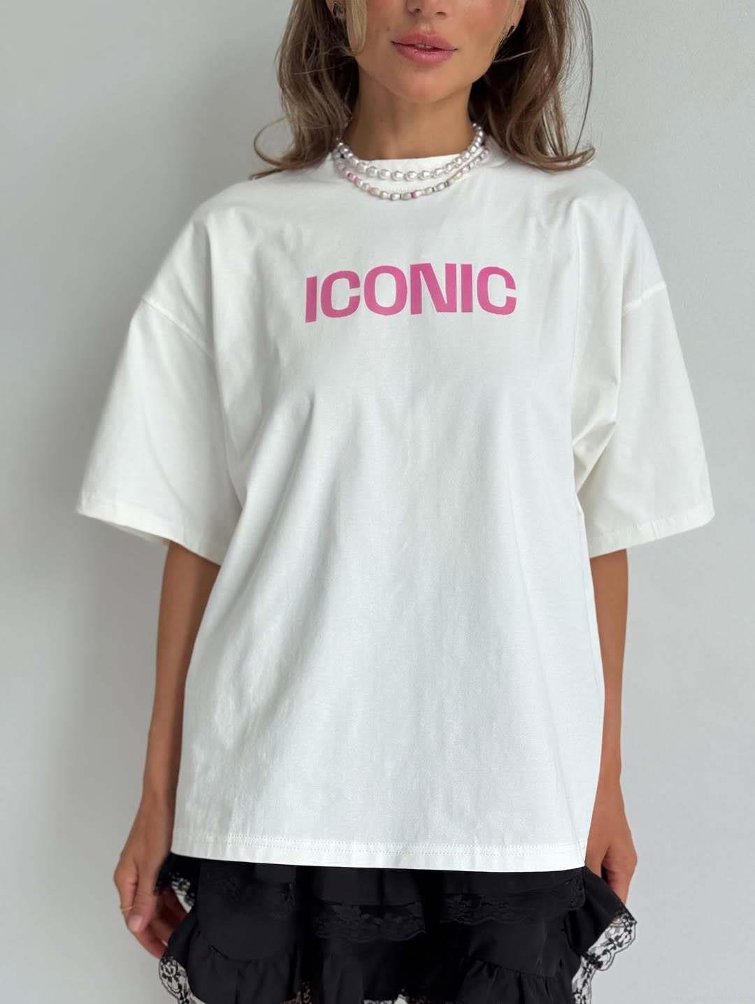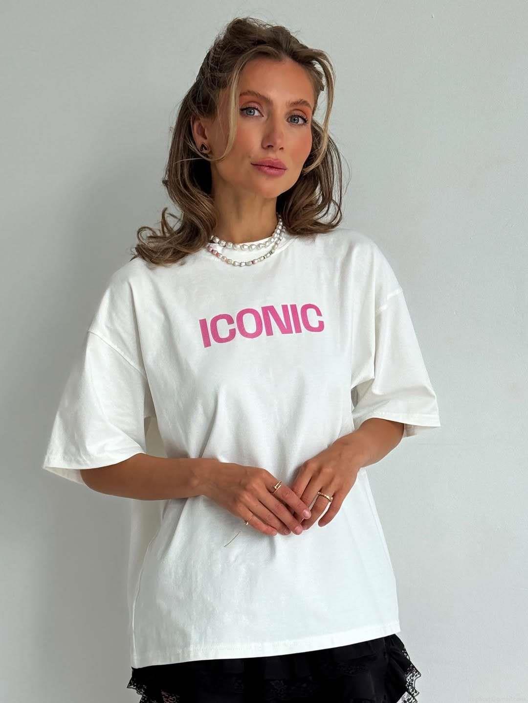 • Women's Retro Oversized Cotton Blend T-Shirt With Pink ICONIC Letter Print Round Neck Short Sleeve Streetwear Casual Top For Summer Daily Outdoor