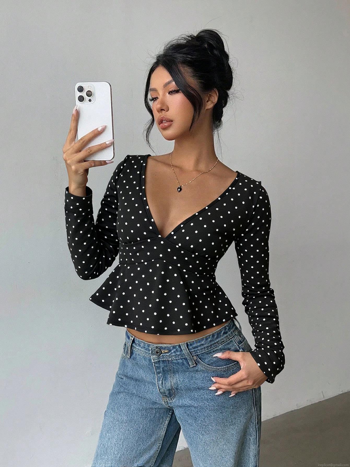 • Women's Retro Polka Dot Deep V-Neck Peplum Long Sleeve T-Shirt Slim Fit Elegant Casual Polyester Spandex Top For Party Dating Daily