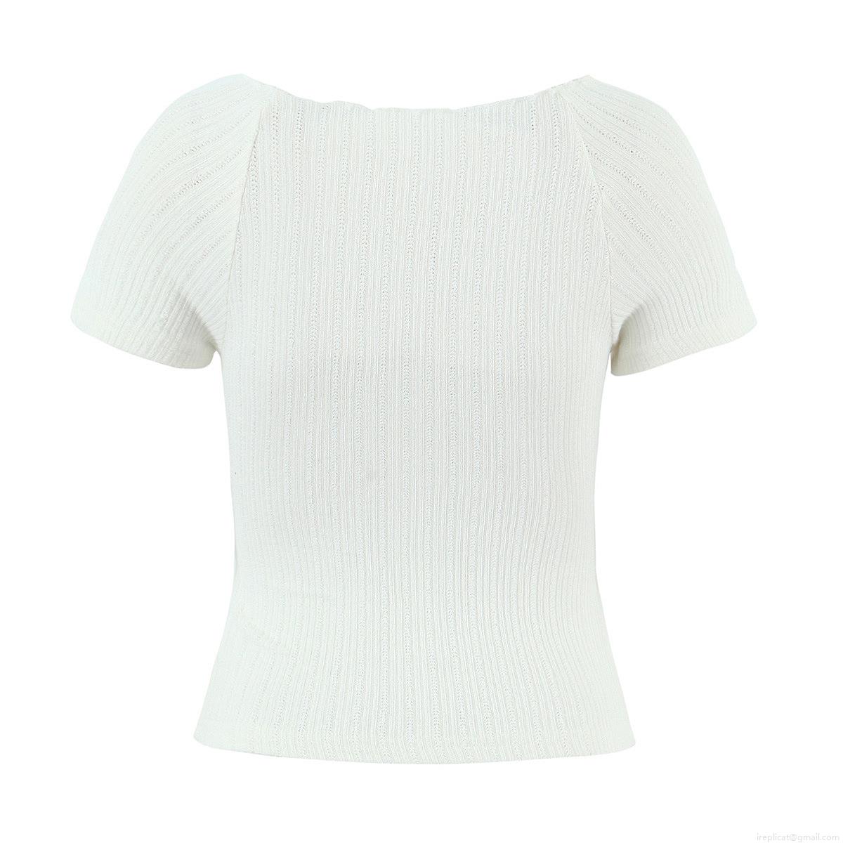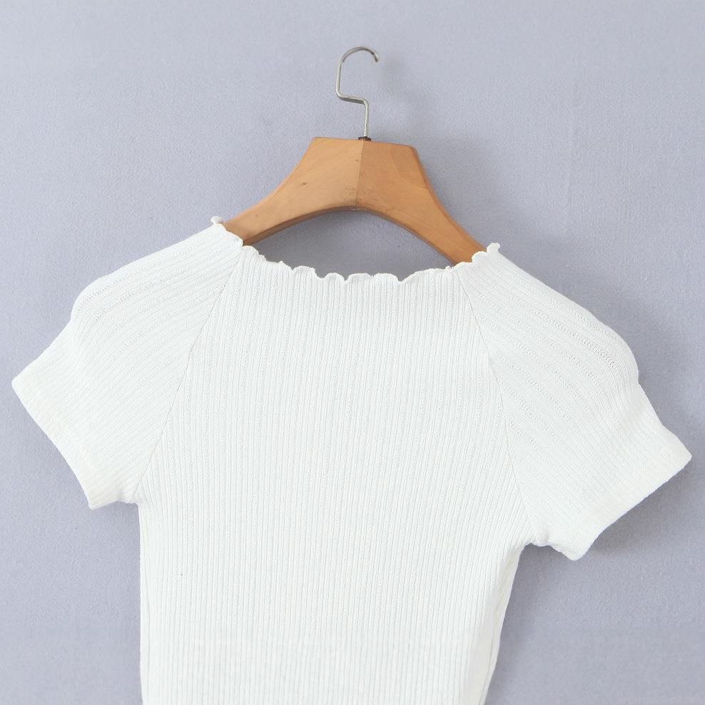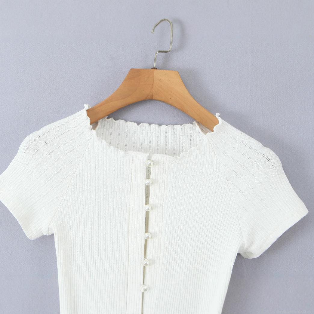 • Women's Retro Ribbed Knit Henley T-Shirt Pearl Buttons Off-Shoulder Slim Fit Short Sleeve Wavy Edge Summer Street Style Top
