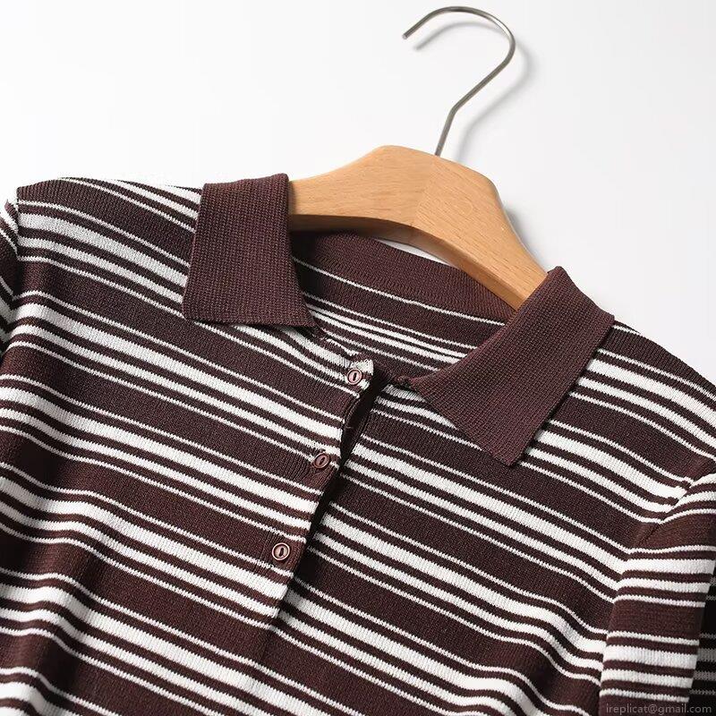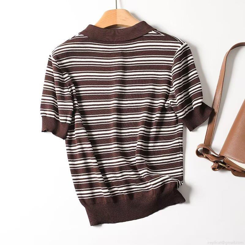 Women's Retro Striped Knitted Polo Shirt Short Sleeve 80% Viscose 20% Nylon Loose Casual Button V-Neck Top For Daily Commuting Women Clothing