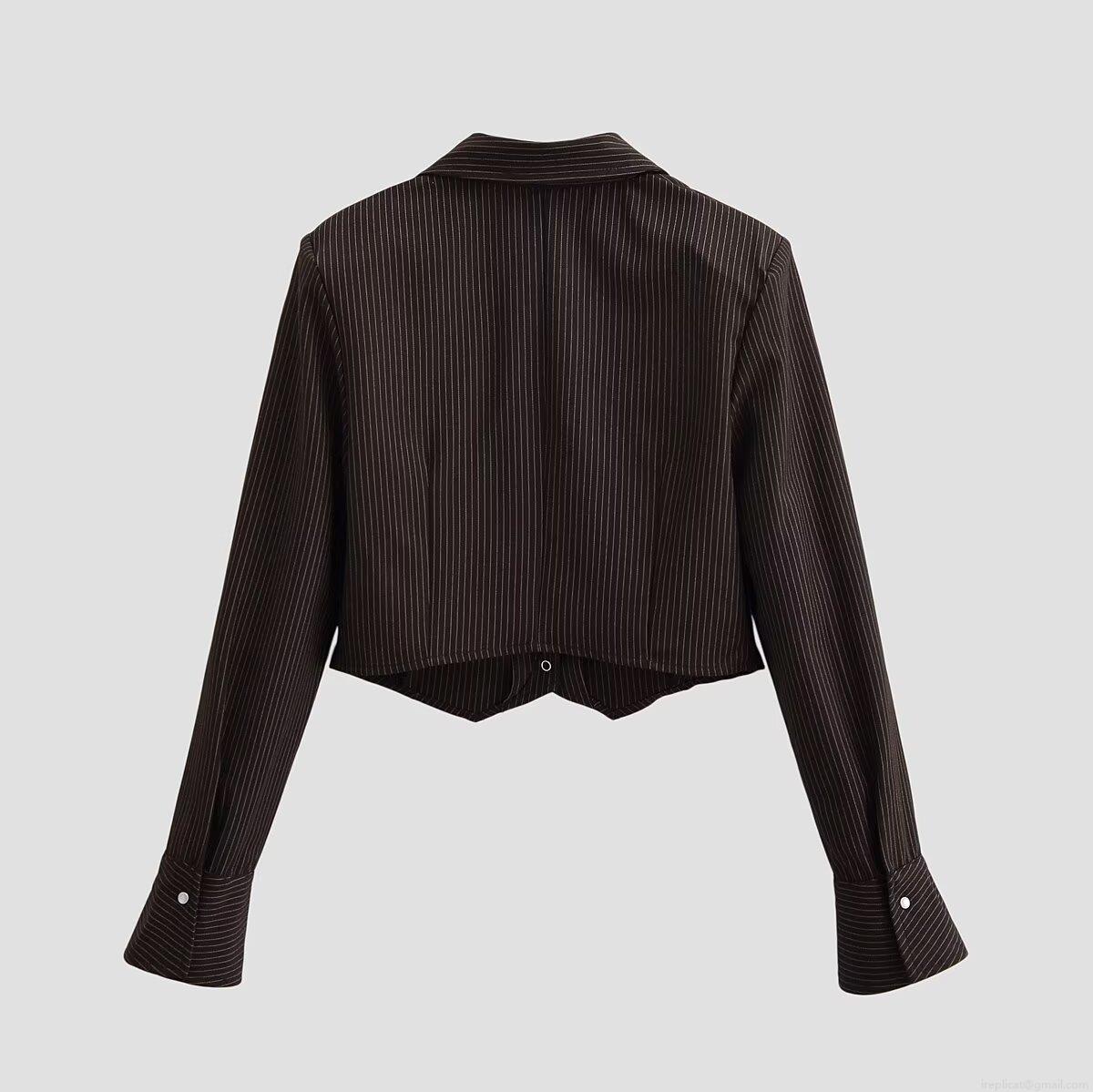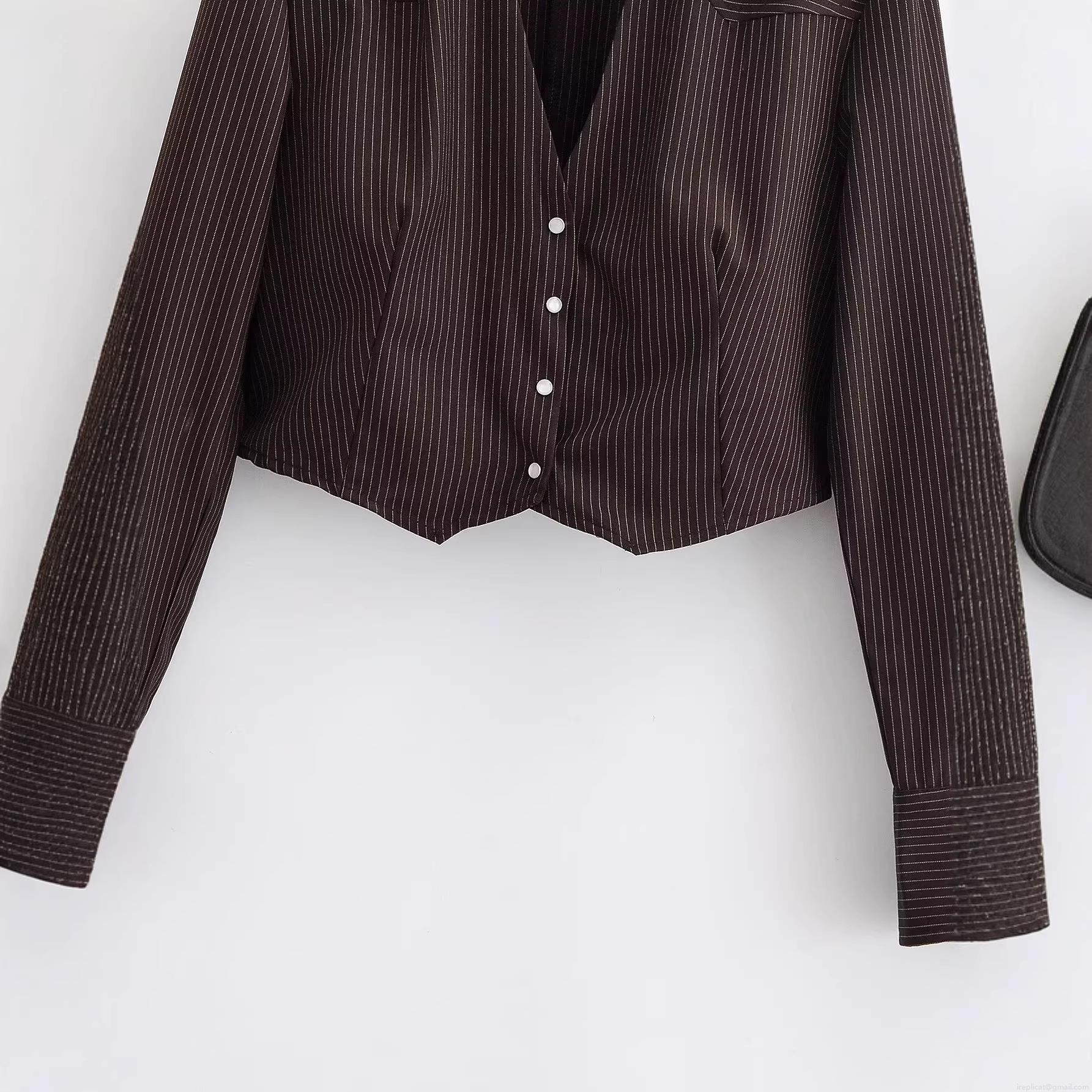 • Women's Retro Striped Long Sleeve Crop Blouse Fashion Lapel Single Breasted Coffee Shirt Autumn Streetwear Top
