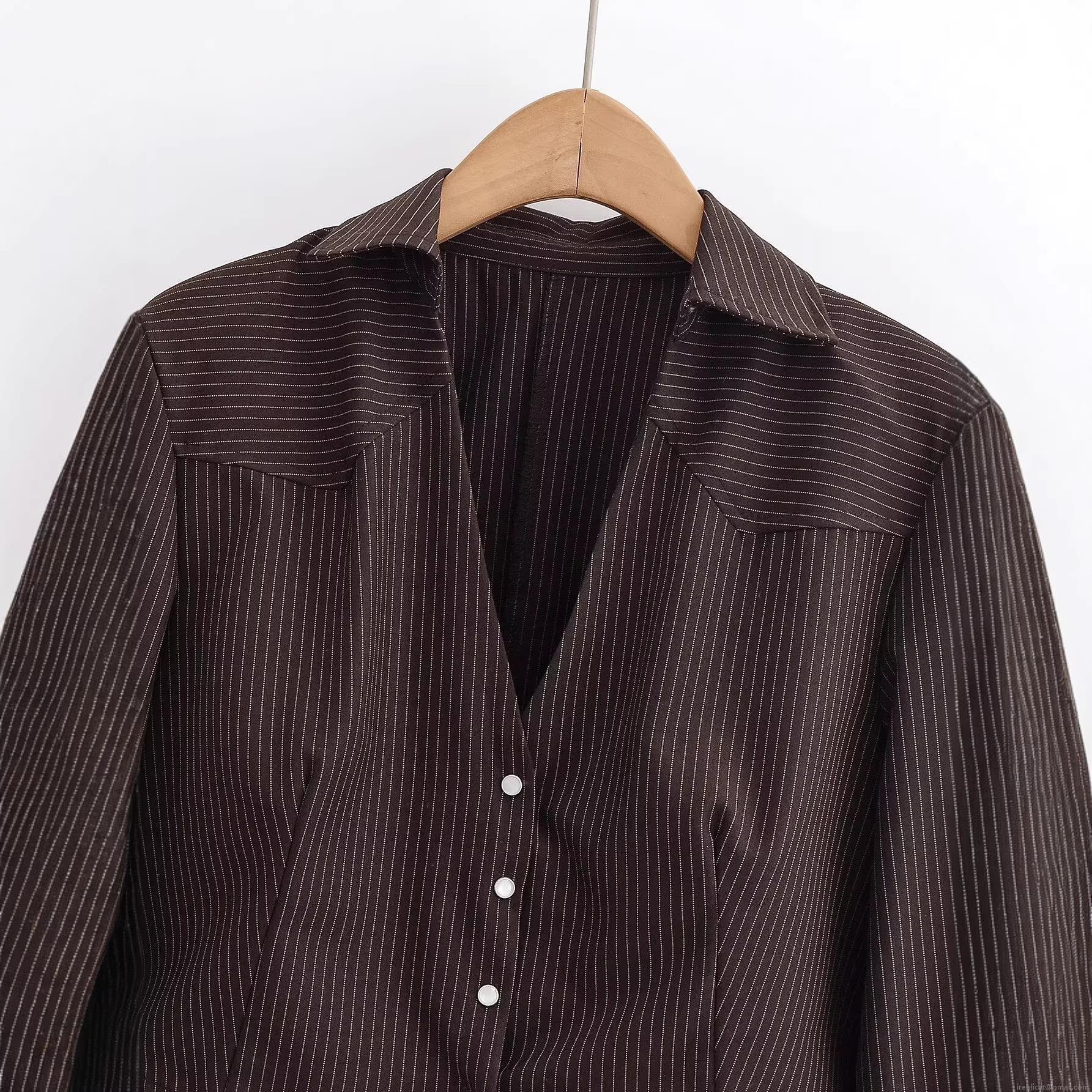 Women's Retro Striped Long Sleeve Crop Blouse Fashion Lapel Single Breasted Coffee Shirt Autumn Streetwear Top