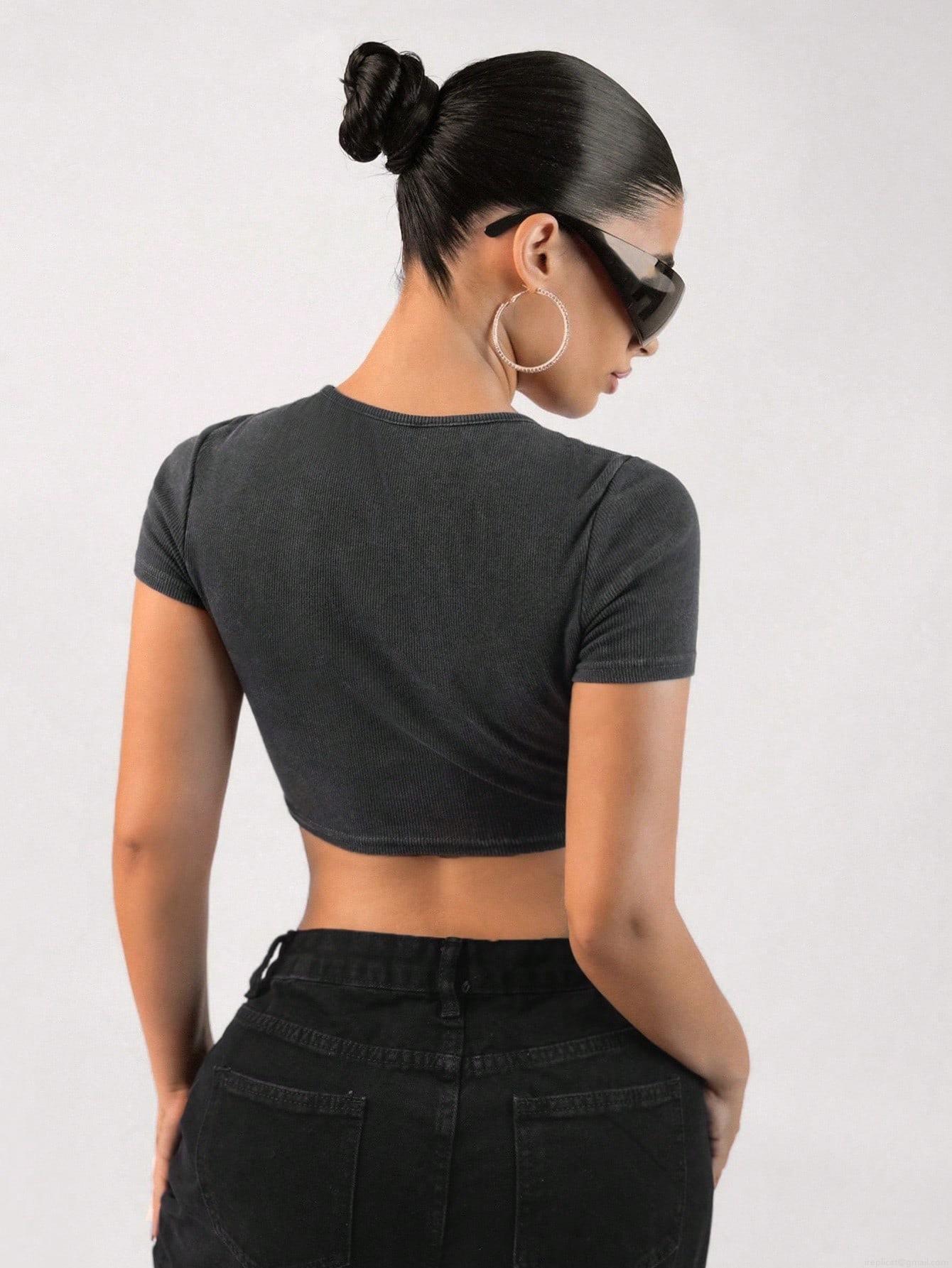 Women's Ribbed Crop Top Short Sleeve T-Shirt Viscose Polyester Hollow Out With Metal Buckles Streetwear Slim Fit Summer Sexy Tee