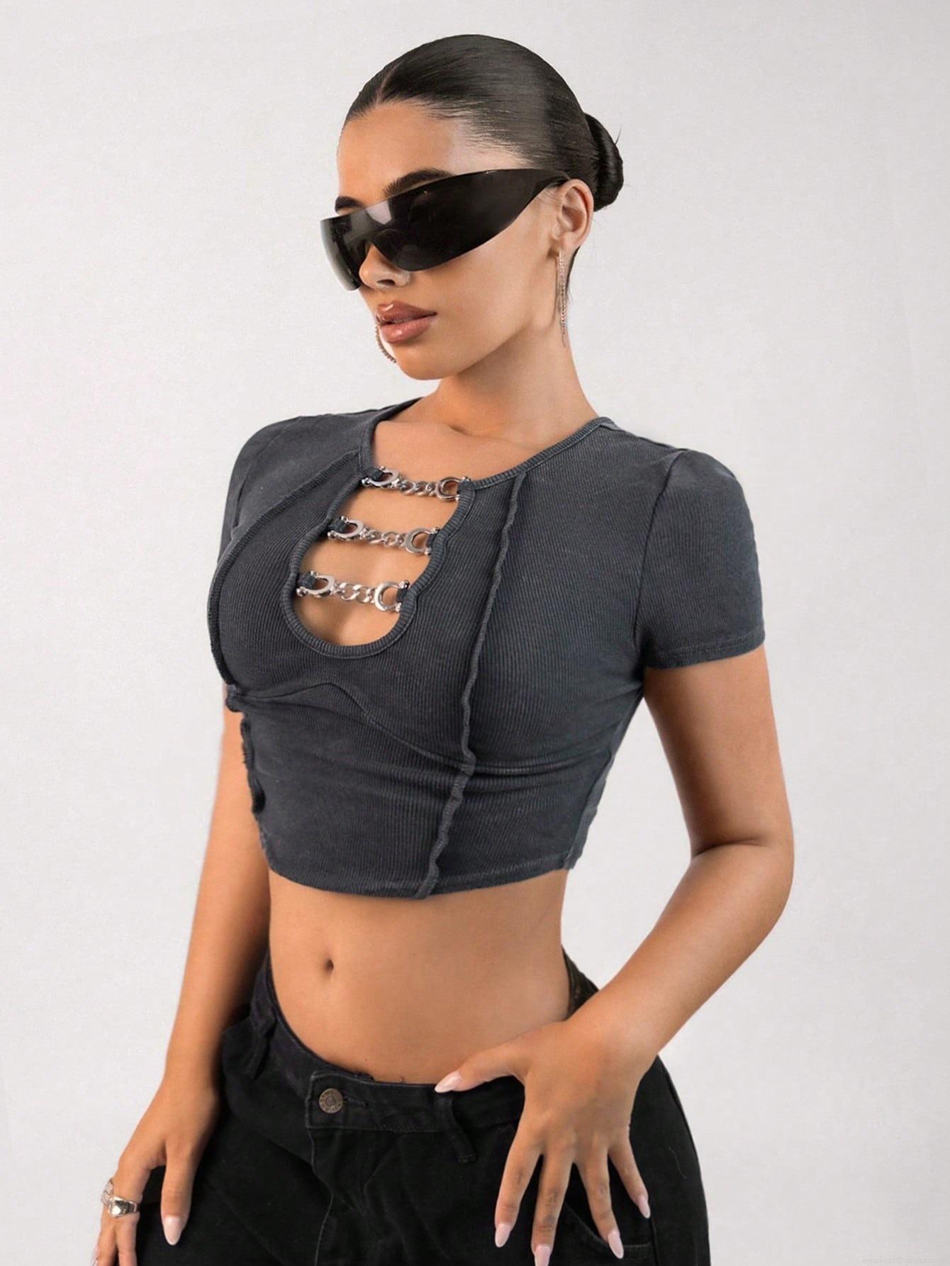 Solid Color, Hollow Out, Ribbed, Navel Exposed, Metal Chain Buckle