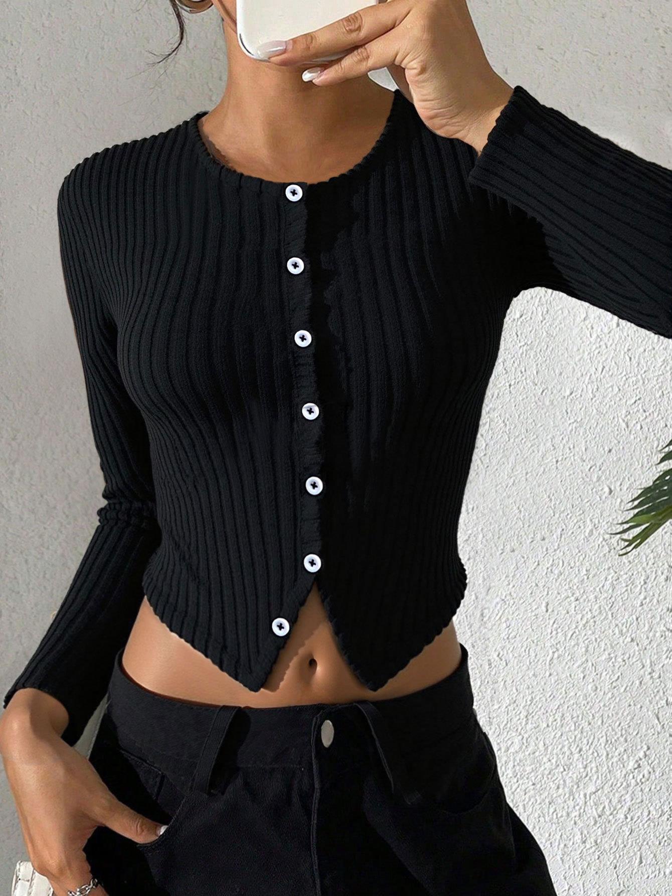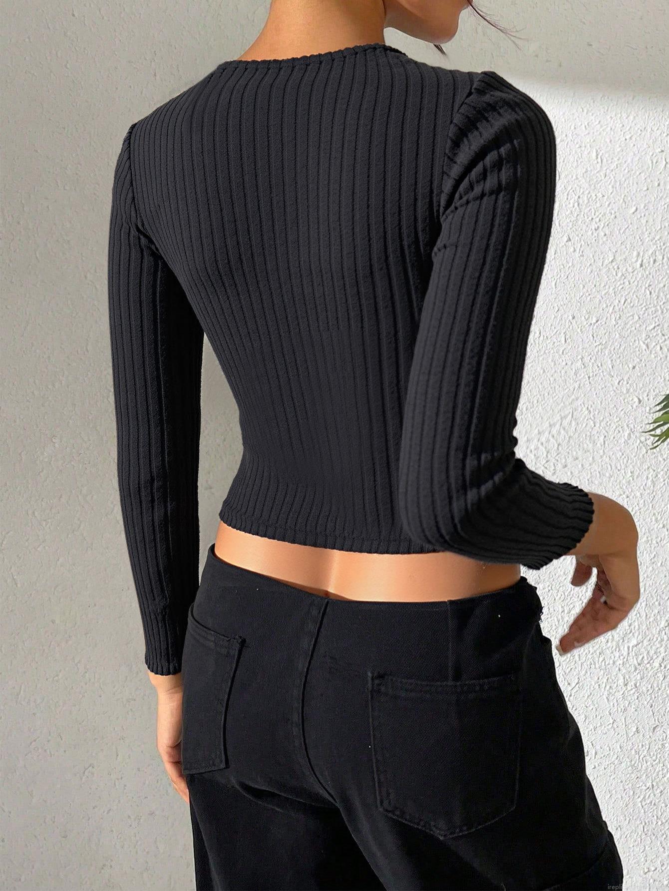 • Women's Ribbed Knit Long Sleeve Crop Top Button Front Slim Fit Crew Neck T-Shirt Polyester Viscose Casual Sexy Fashion Tee