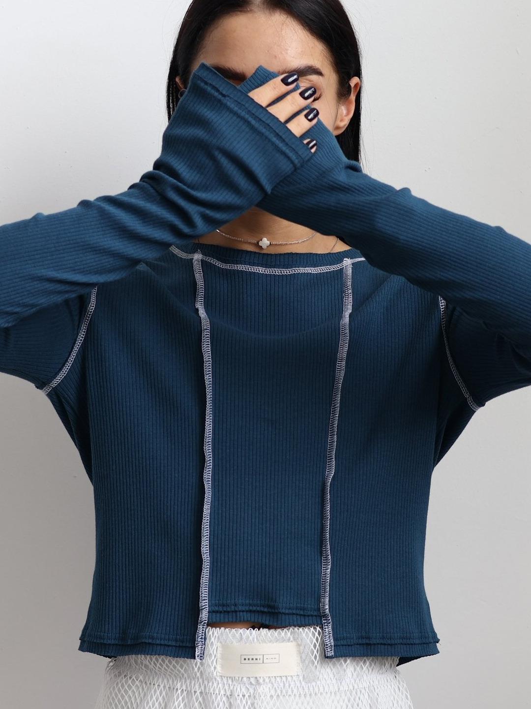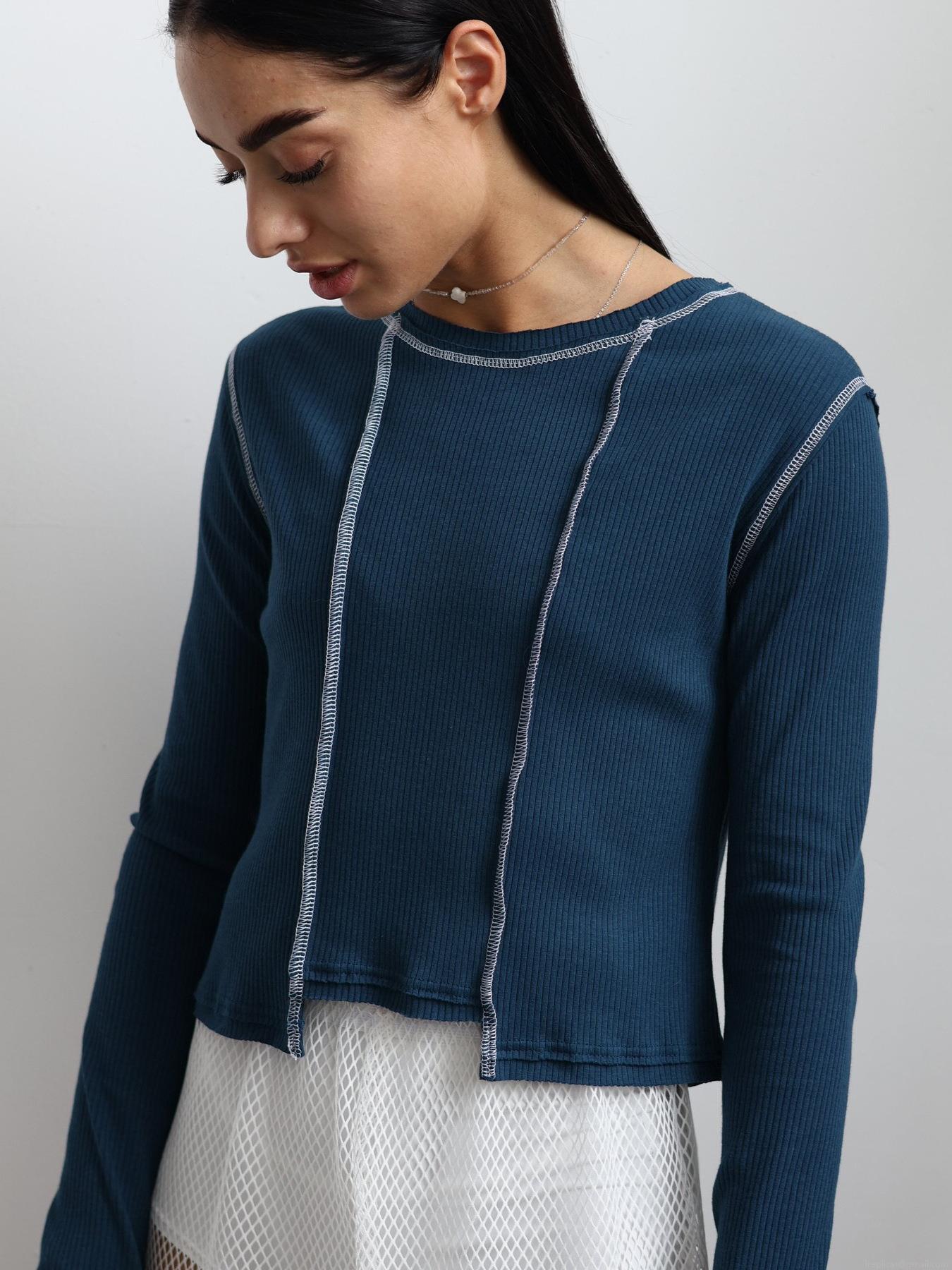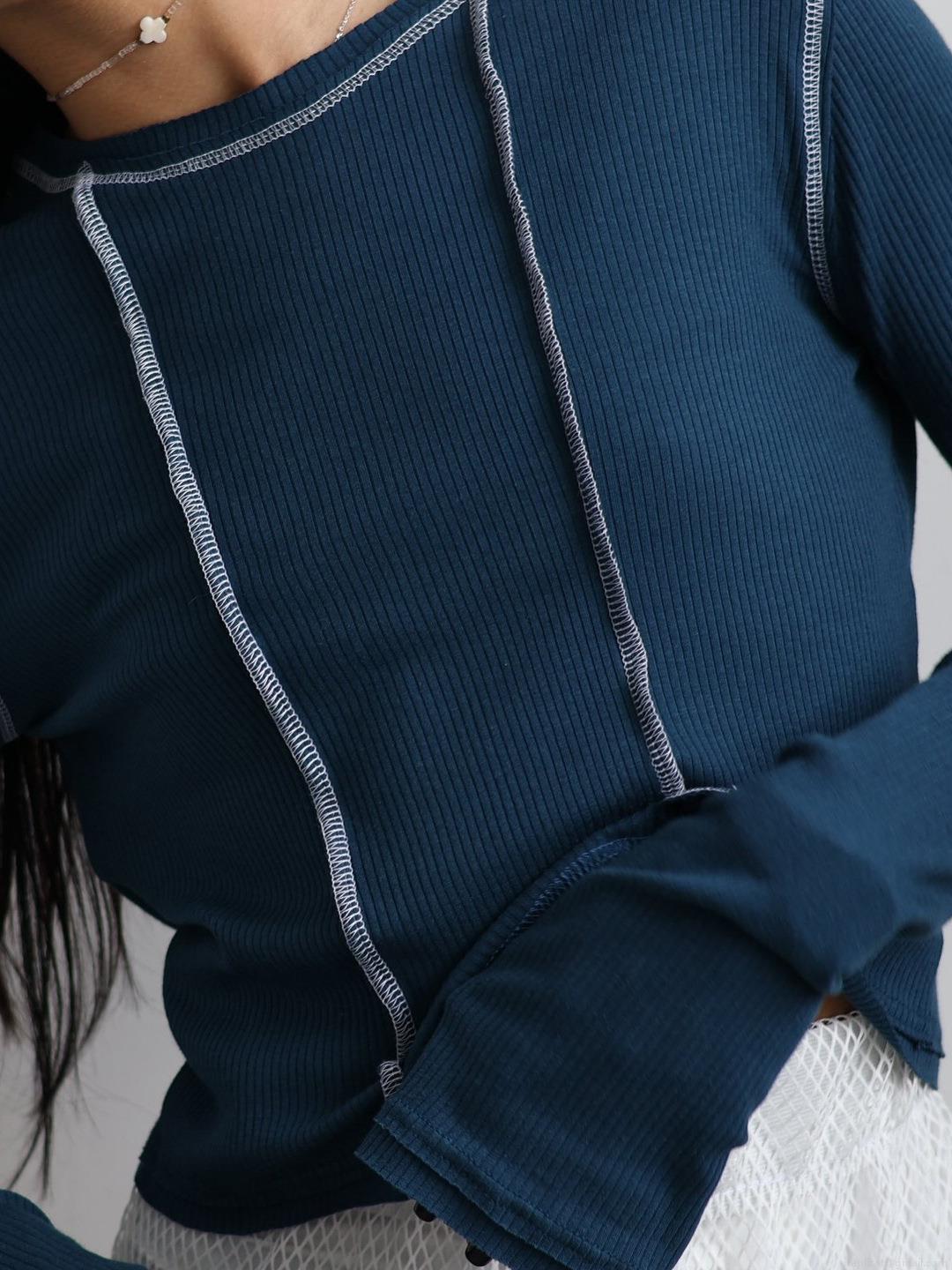 • Women's Ribbed Knit Long Sleeve T-Shirt Contrast Exposed Seams Irregular Crop Top Casual Streetwear Pullover Round Neck Cotton Blend Fashion Shirt