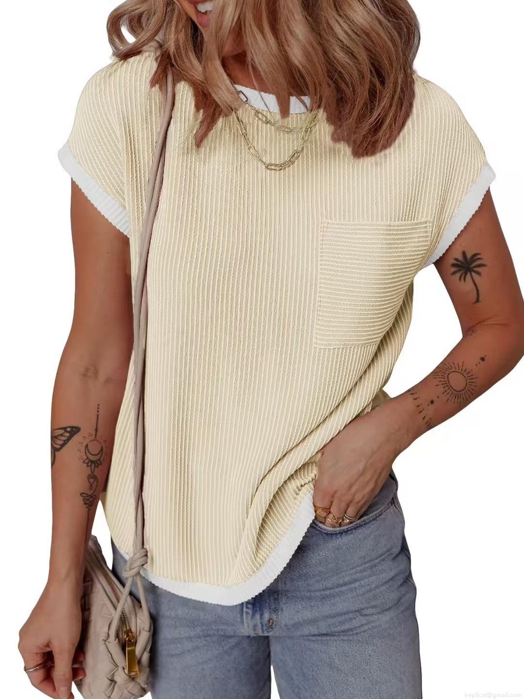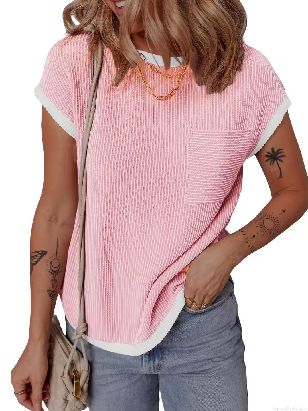 Women's Ribbed Knit T-Shirt Contrast Binding Round Neck Short Sleeve Top With Chest Pocket Casual Summer Commuter Tee For Women