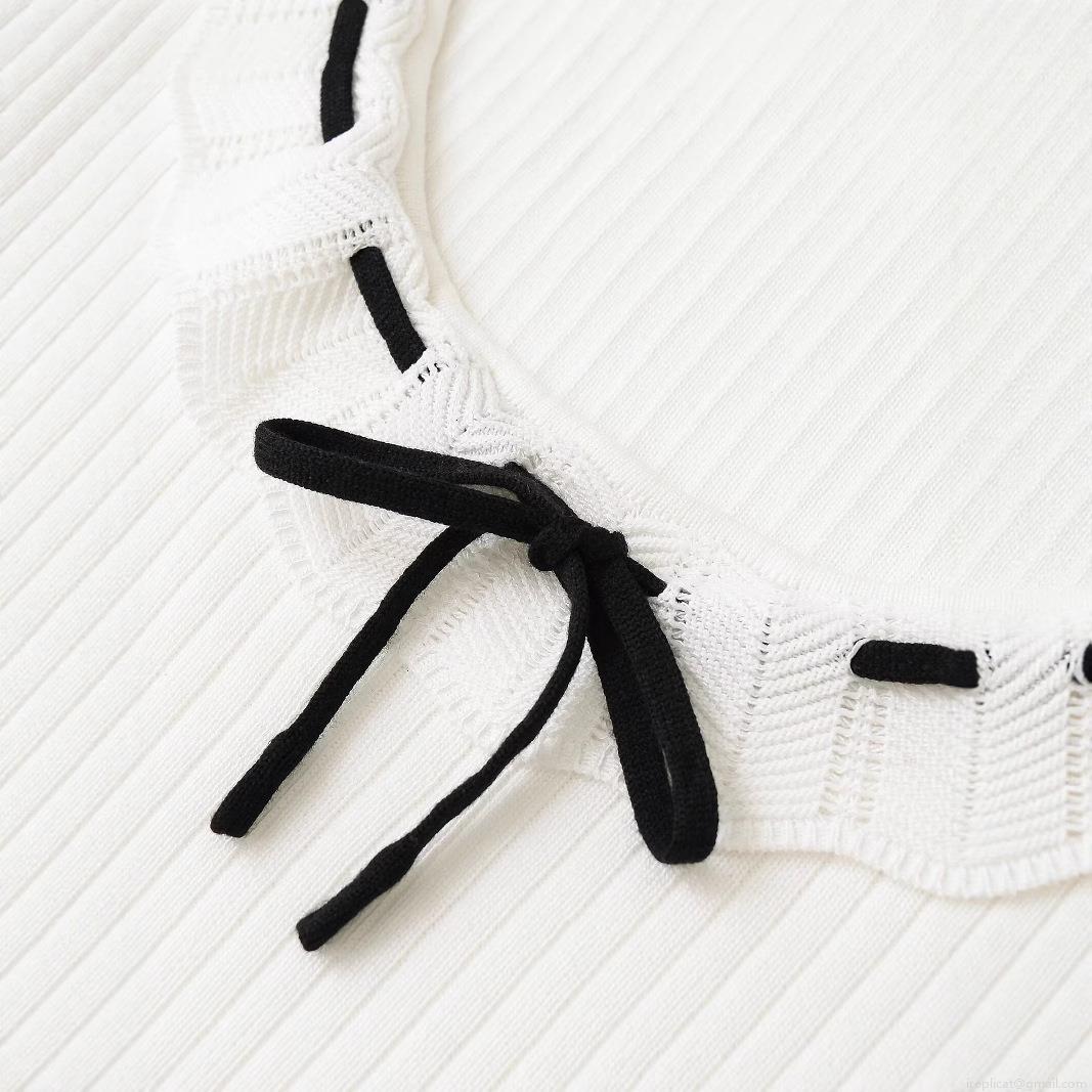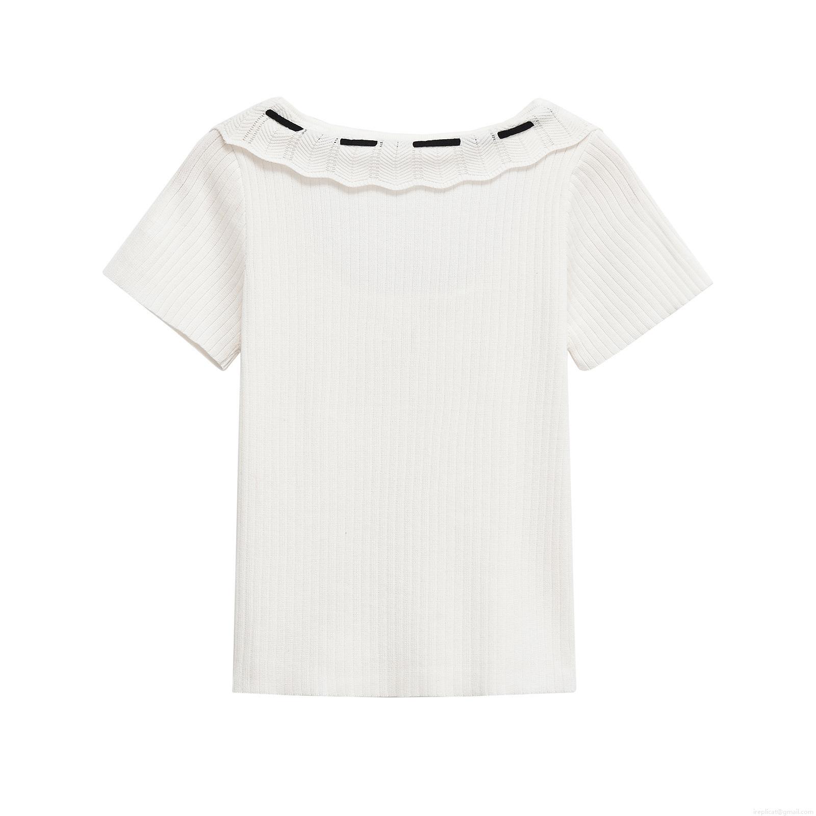 • Women's Ribbed Knit T-Shirt Contrast Ruffle Collar With Bow Tie Mercerized Cotton Polyester Short Sleeve Top Slim Fit Street Style Casual Summer Tee