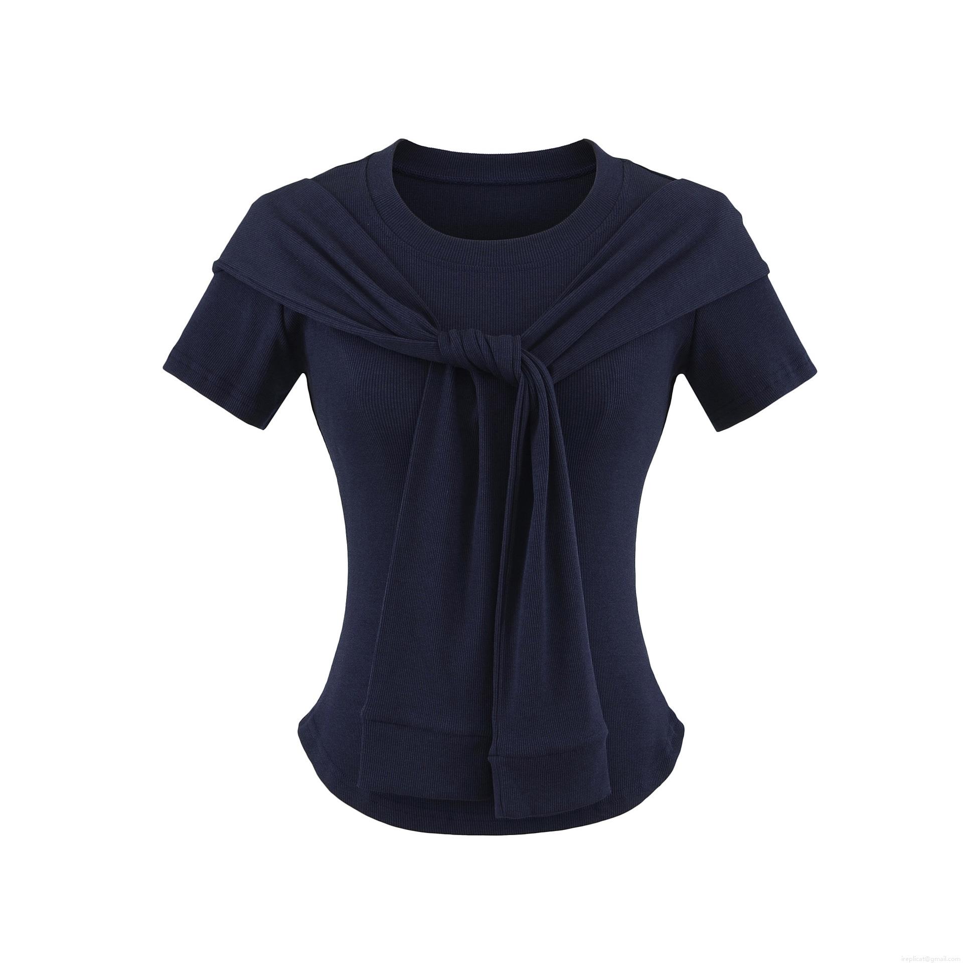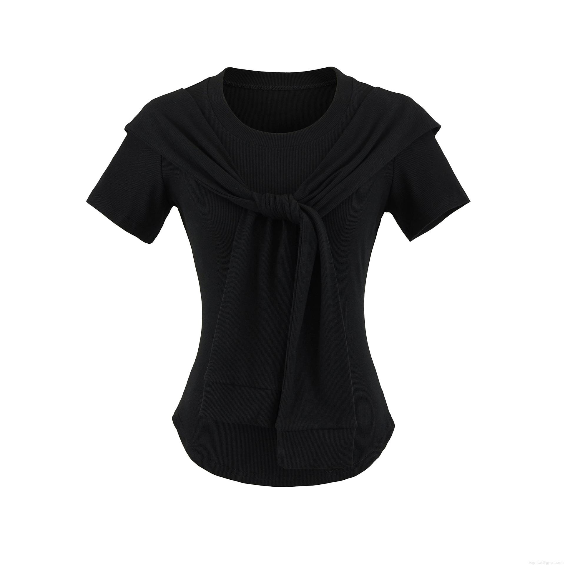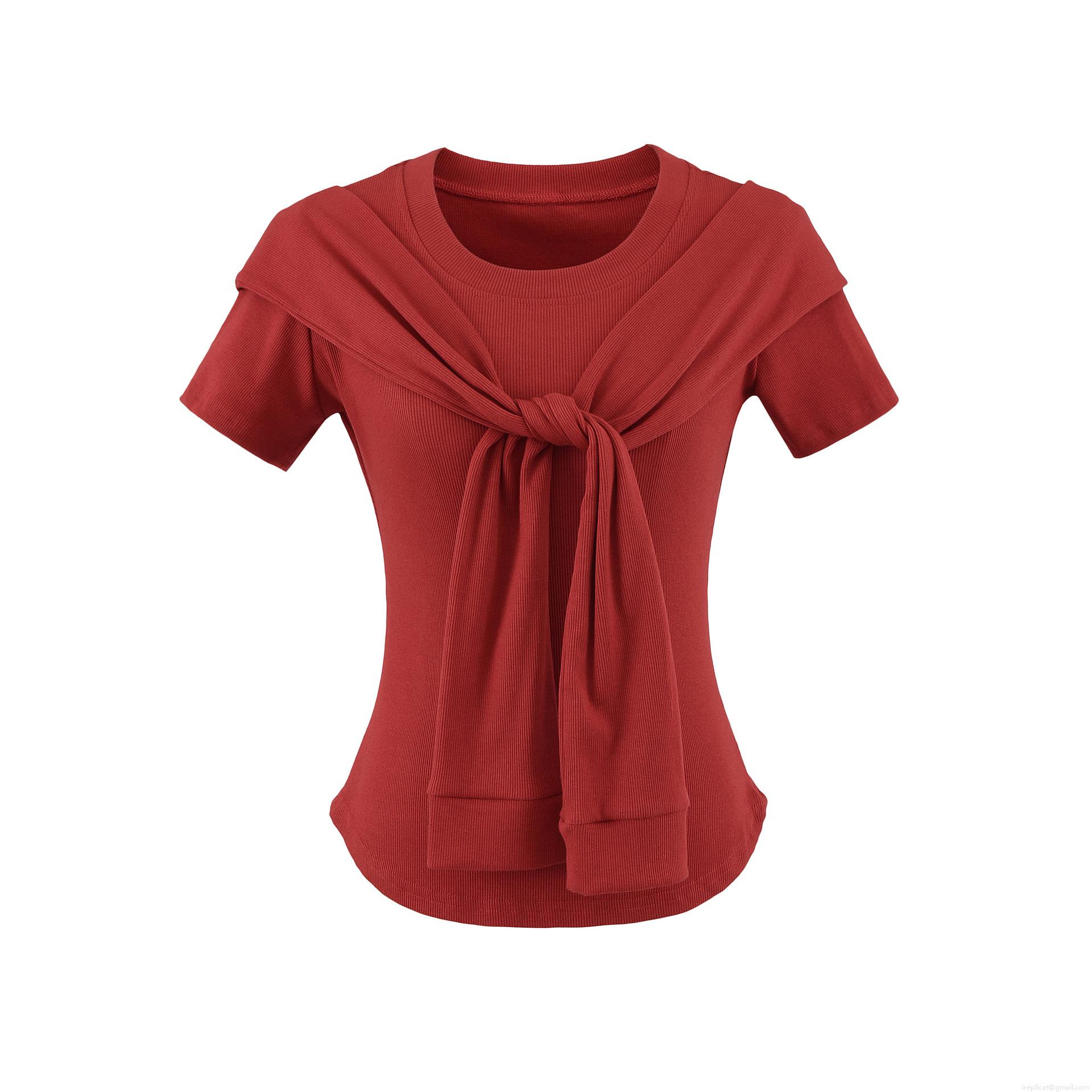 • Women's Ribbed Knit T-Shirt Fake Two-Piece Knot Front Shawl Design Short Sleeve Round Neck Cotton Blend Slim Fit Summer Casual Streetwear Top