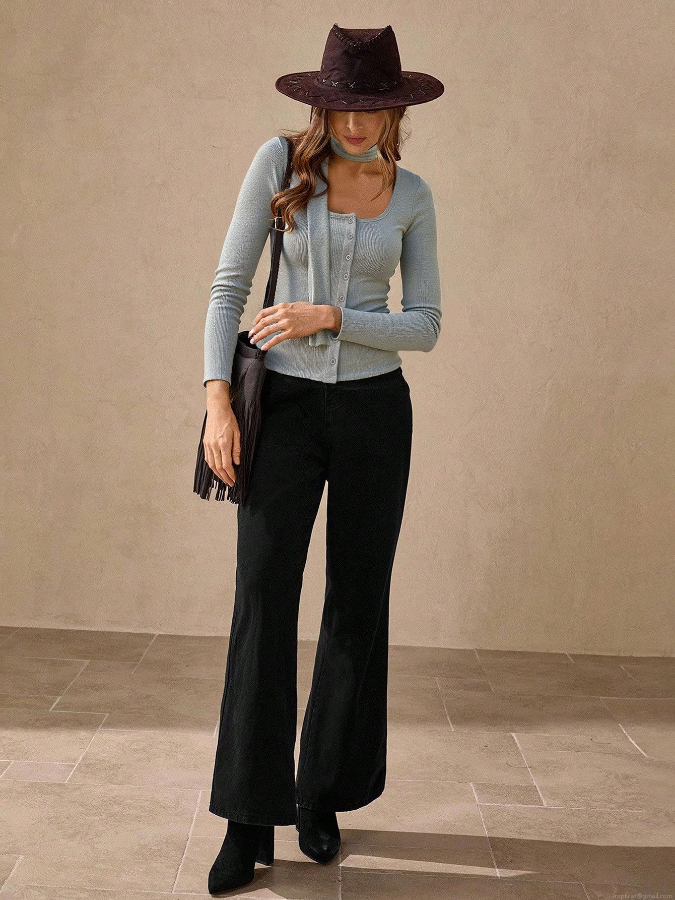 • Women's Ribbed Knit T-Shirt With Button Front And Matching Scarf Long Sleeve Slim Fit Polyester Elastane Cardigan Style Top For Early Autumn Daily Casual Wear