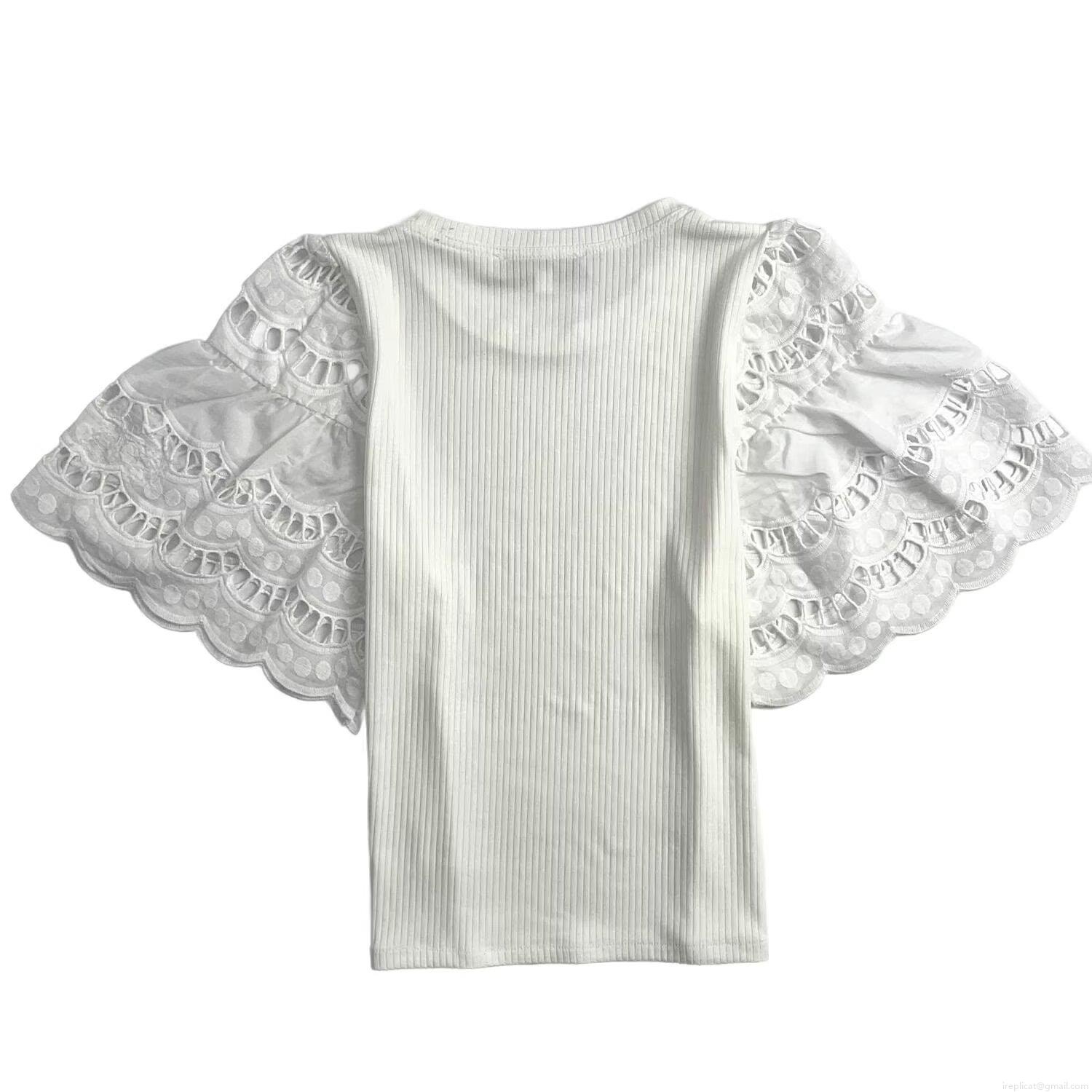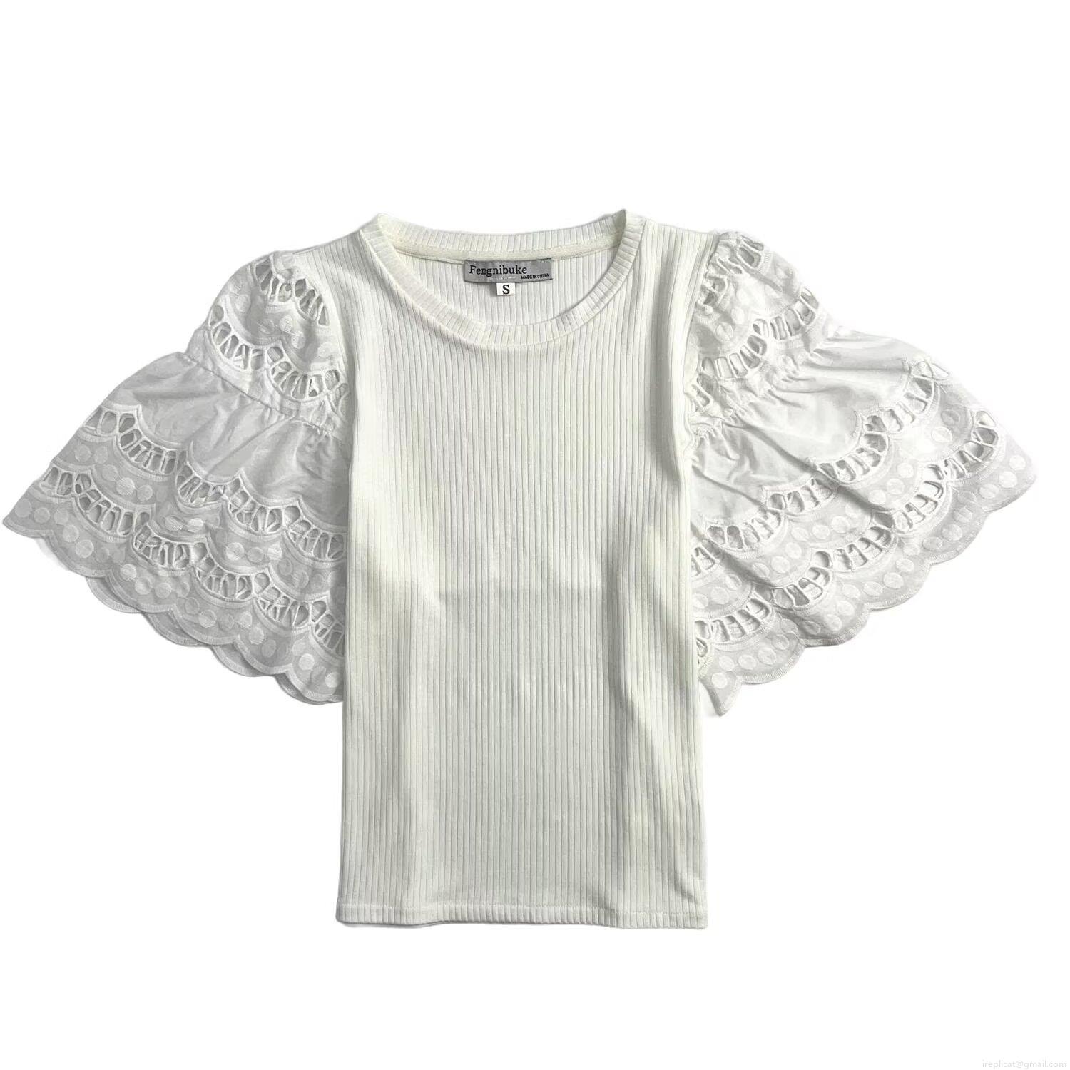 Women's Ribbed Knit T-Shirt With Flutter Embroidery Lace Sleeves Round Neck Casual Viscose Polyester Blend Hollow Out Top For Daily Streetwear Elegant Bohemian Style