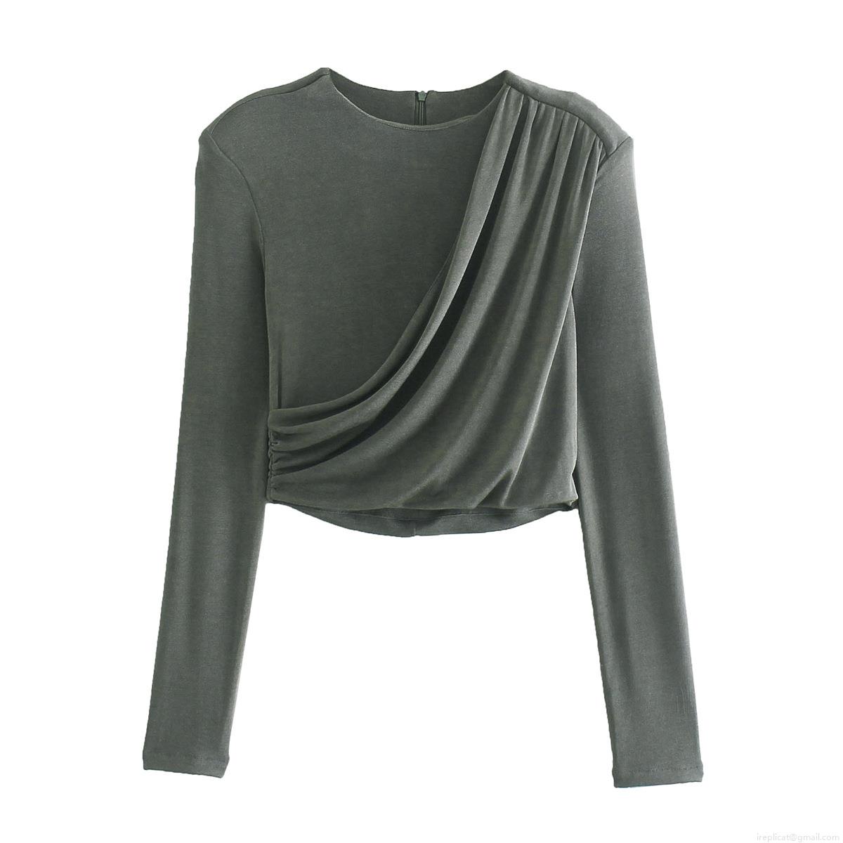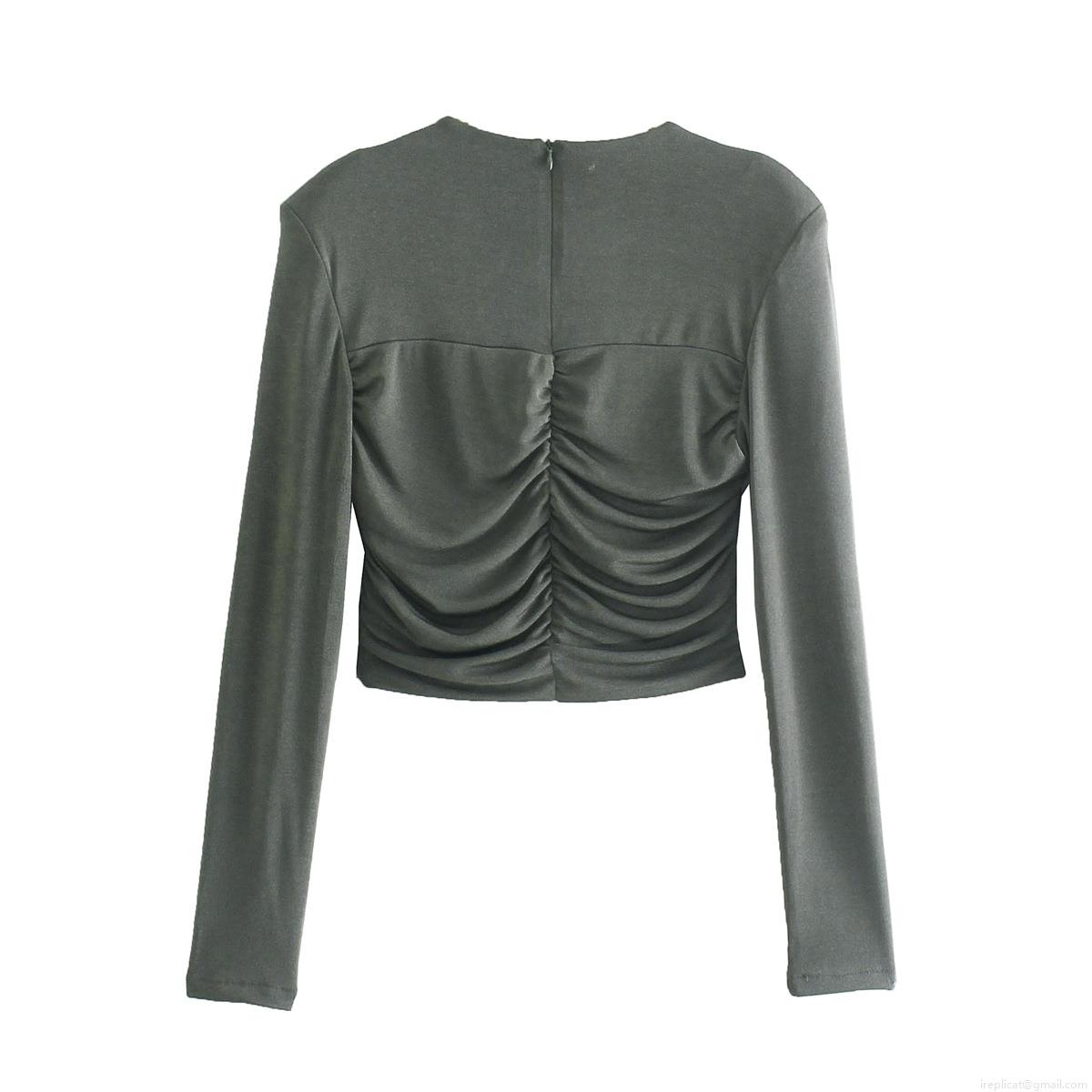 • Women's Ruched Long Sleeve Crop Top With Shoulder Pads Slim Fit Round Neck Solid Color Elastic Polyester Pullover Streetwear Fashion Tee For Ladies