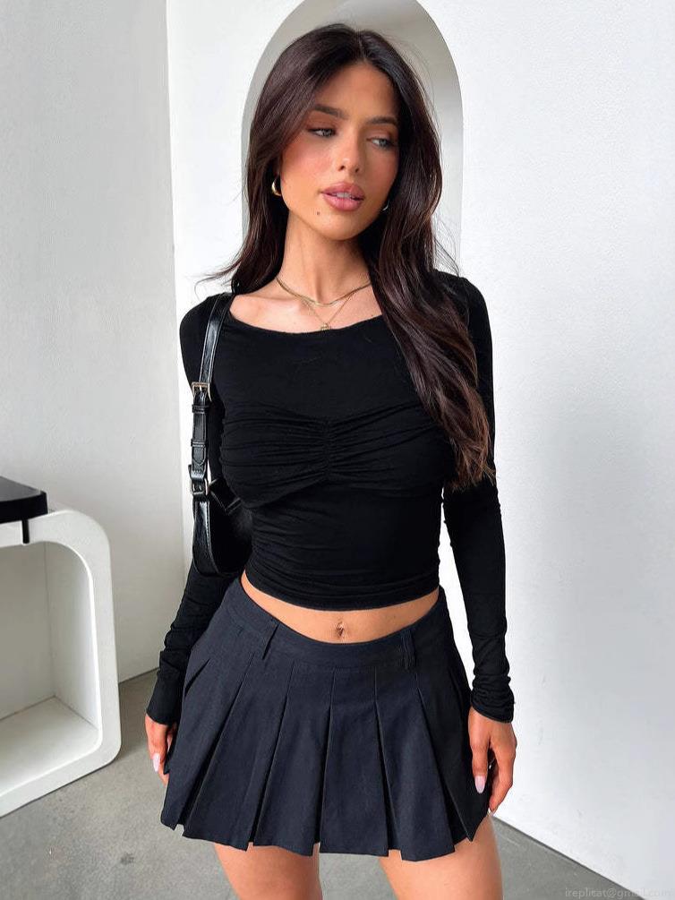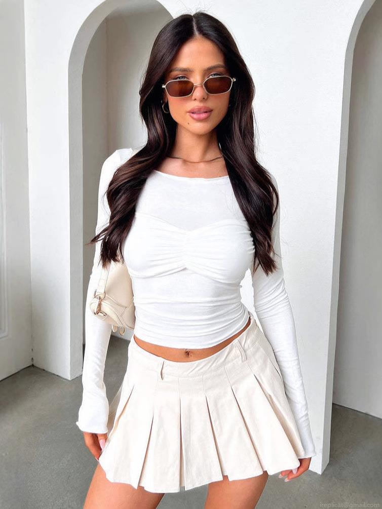 • Women's Ruched Long Sleeve T-Shirt Solid Color Slim Fit Round Neck Pullover Top Comfortable Brushed Polyester Spandex Casual Streetwear Minimalist Basic Tee for Daily Wear