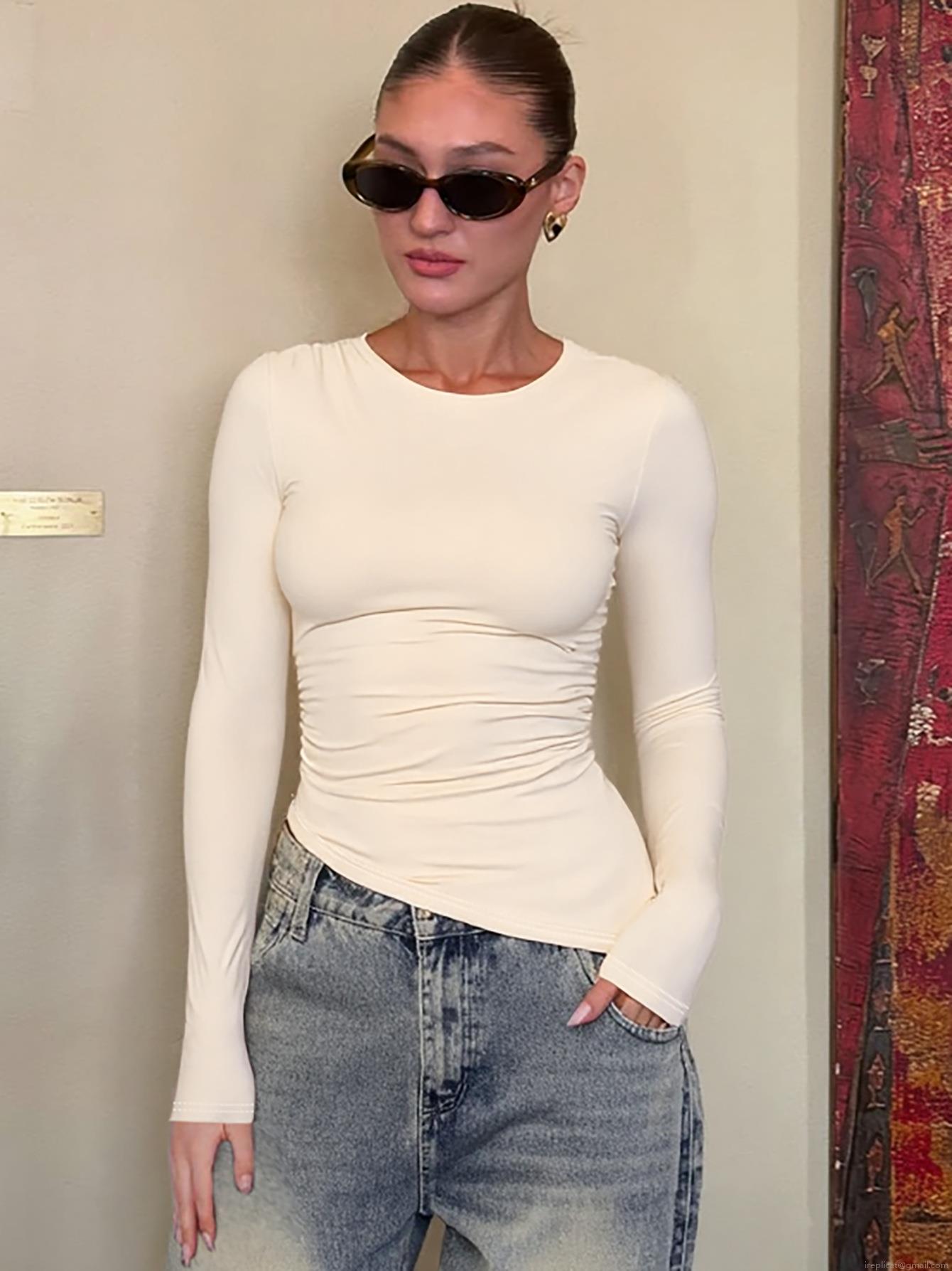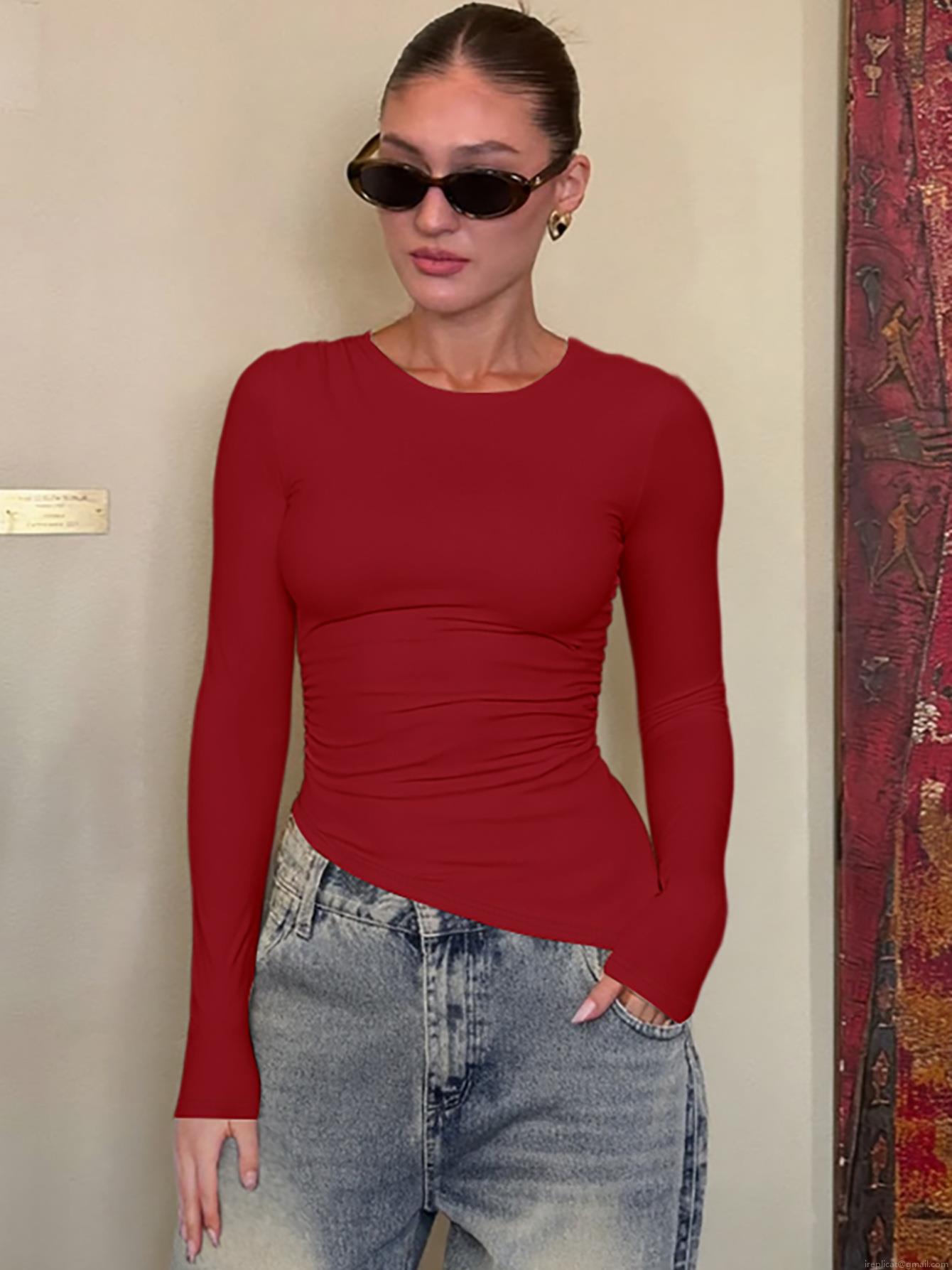 • Women's Ruched Long Sleeve T-Shirt With Asymmetric Hem Slim Fit Round Neck 95% Polyester 5% Spandex Solid Color Sexy Streetwear Fashion Top For Women