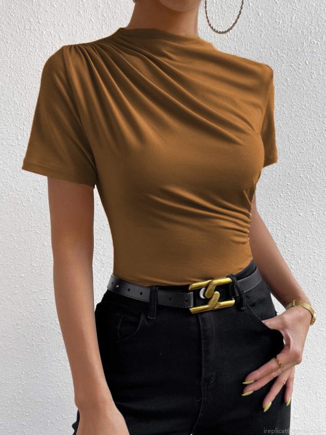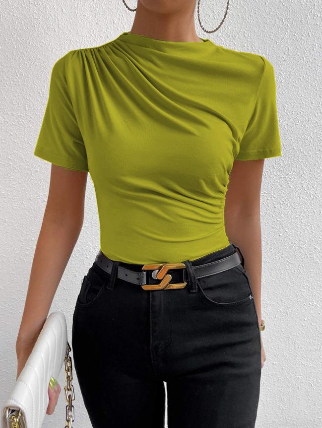 • Women's Ruched Slim Fit T-Shirt Short Sleeve Semi-High Neck Solid Color Polyester Summer Casual Commute Tops For Women Chic Ruched Detailing