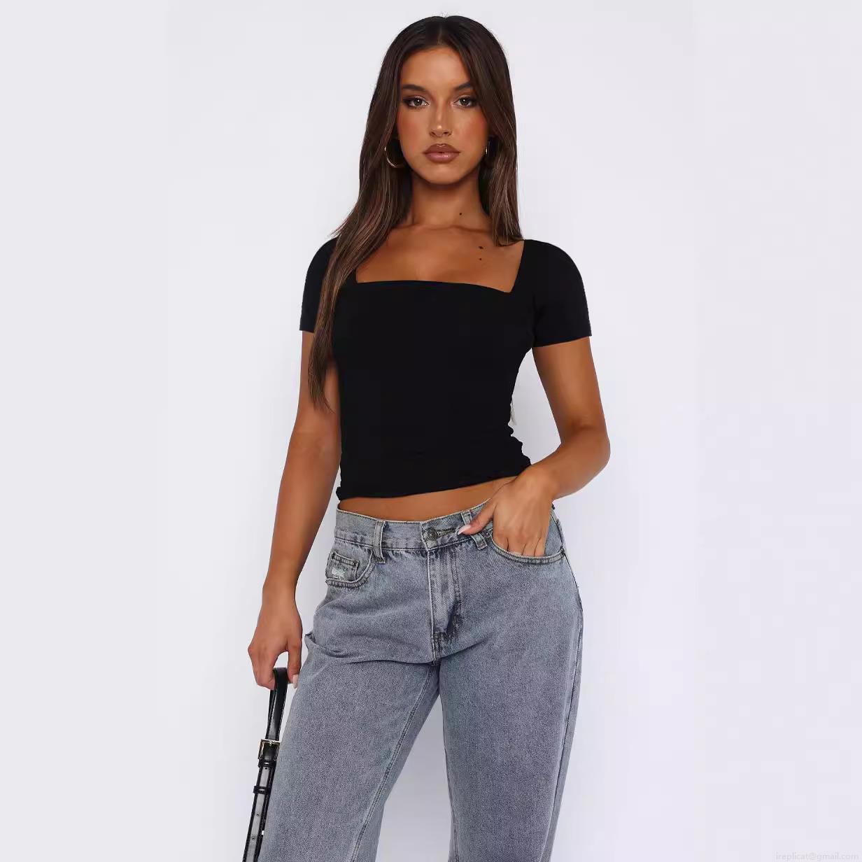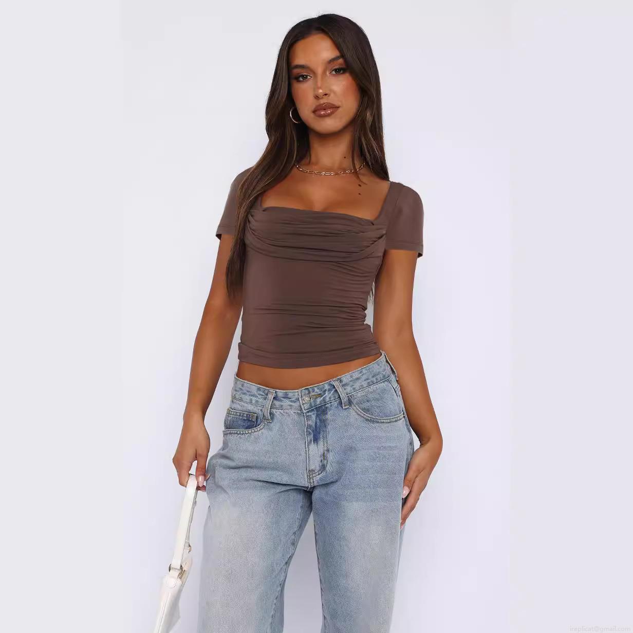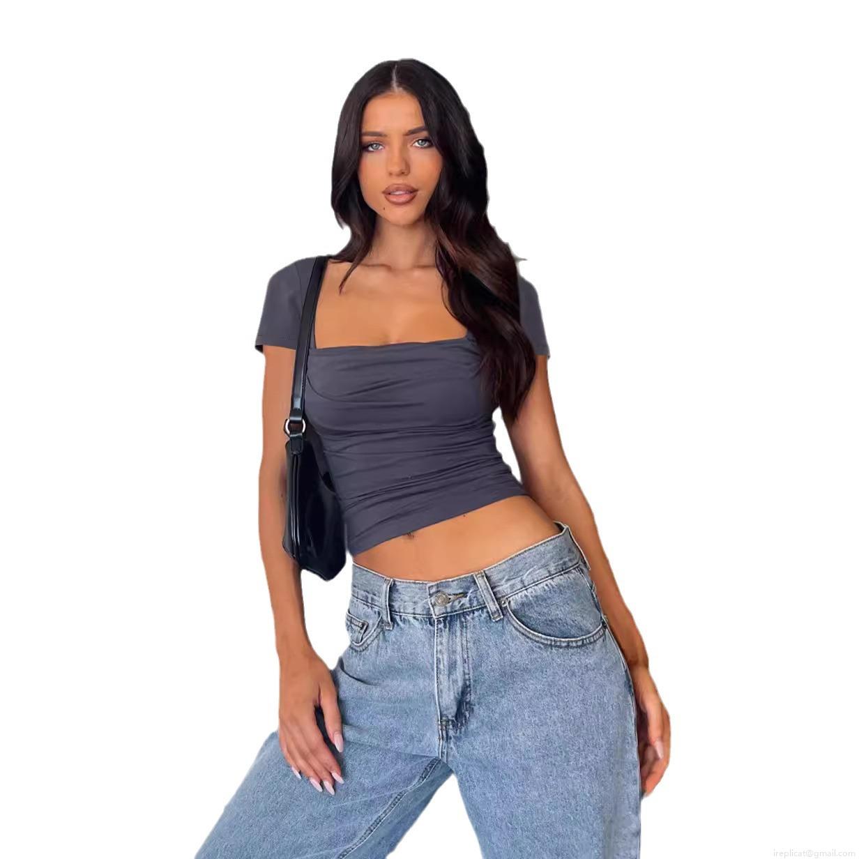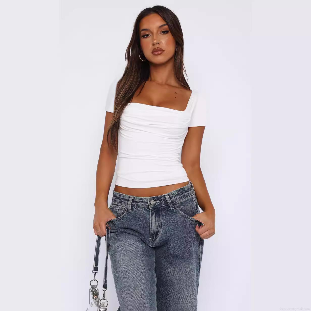 • Women's Ruched Square Neck T-Shirt Short Sleeve Slim Fit Solid Color Polyester Spandex Crop Top For Summer Casual Fashion Style